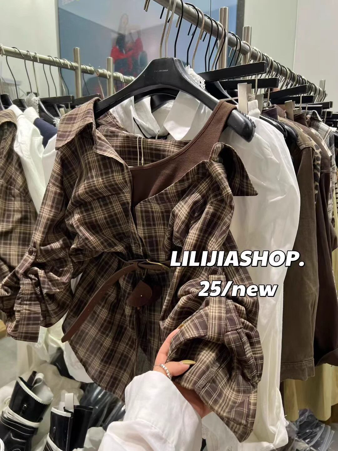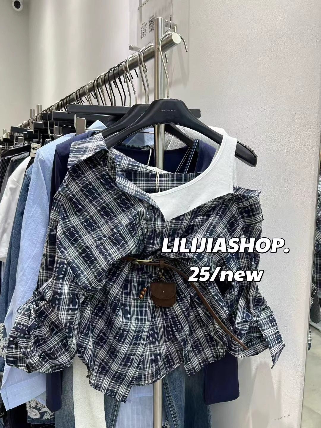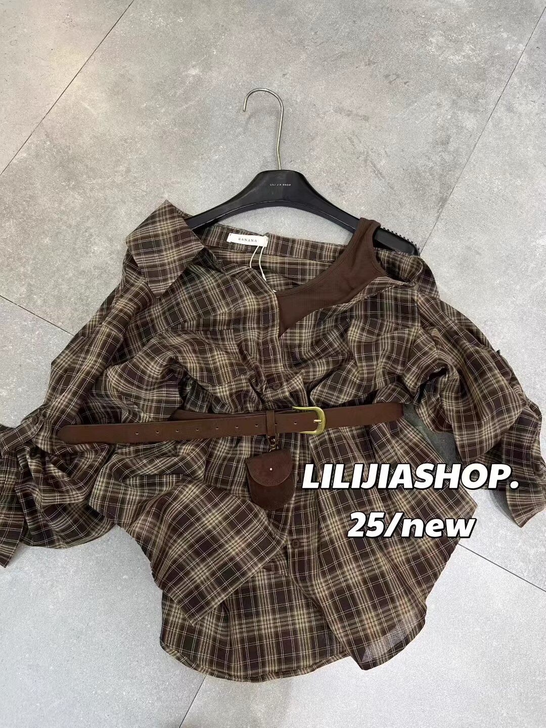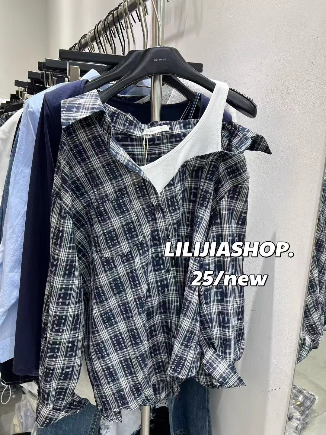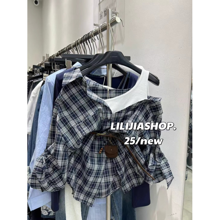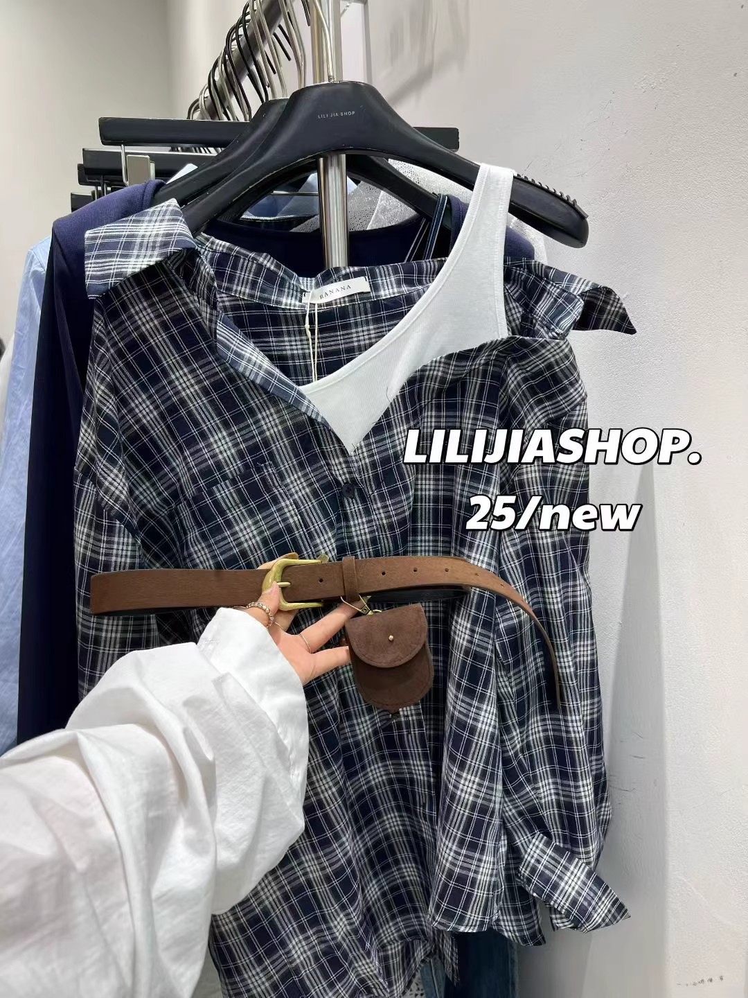 韓國東大門2025秋季新款復古氣質拼接假兩件格子長袖襯衫休閒上衣