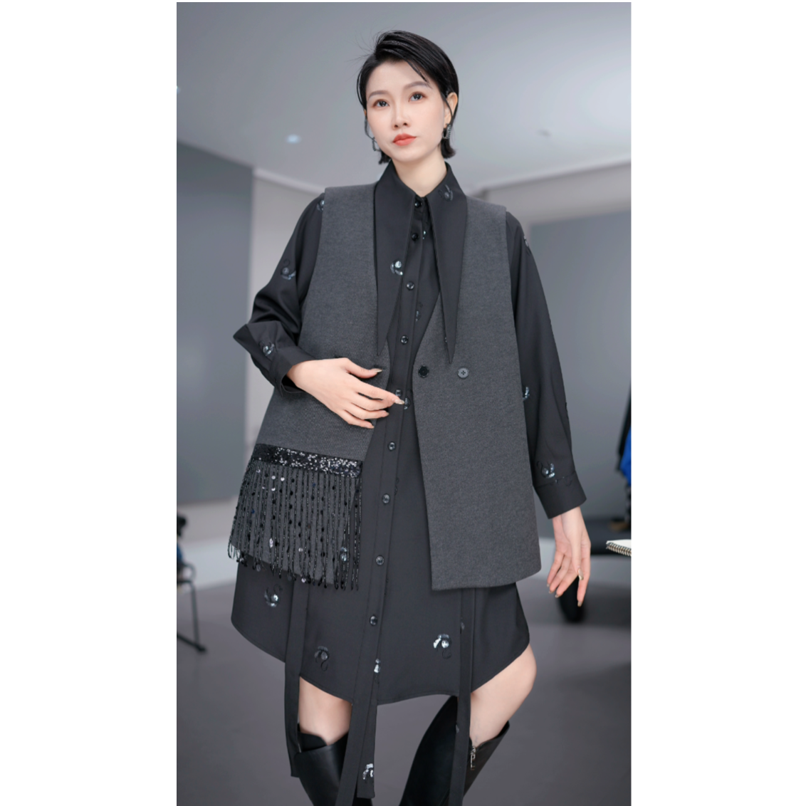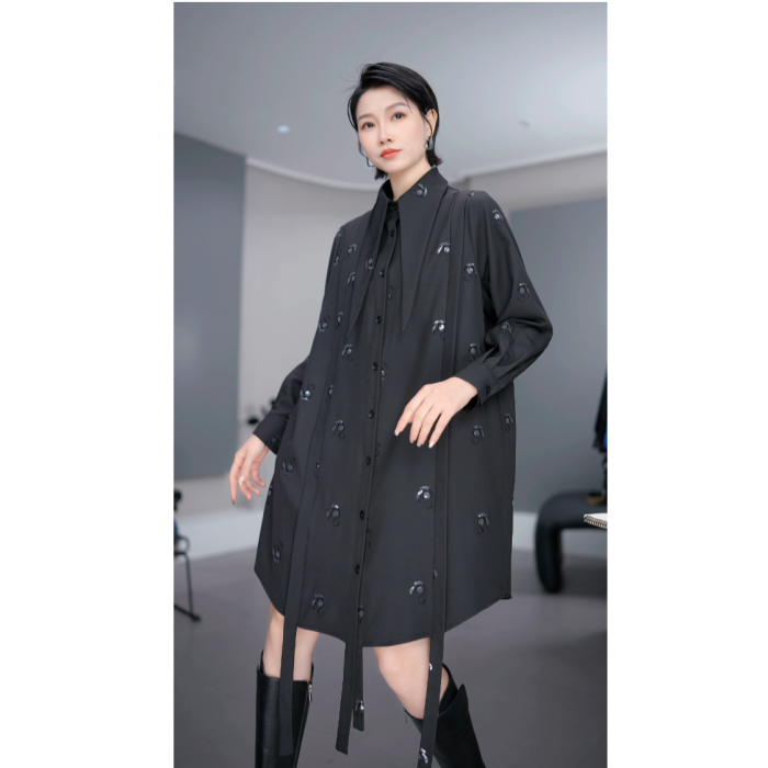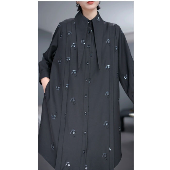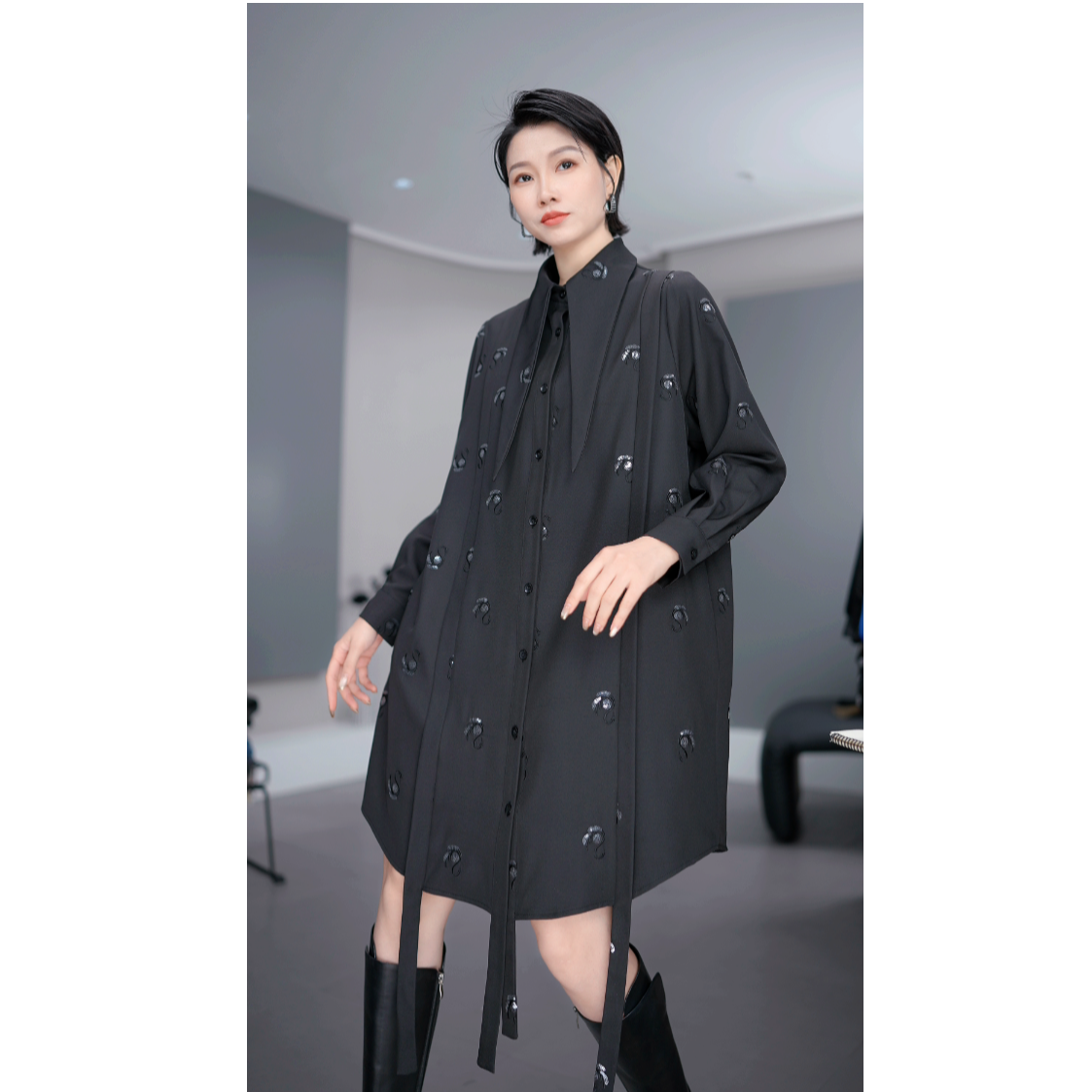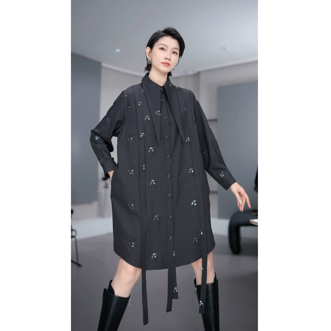 鑫鑫潮流休閒服小個子飄帶襯衫裙冬季顯瘦氣質亮片連衣裙33655