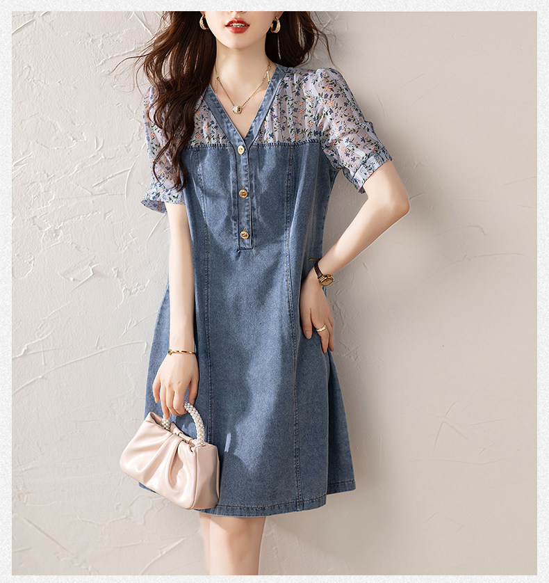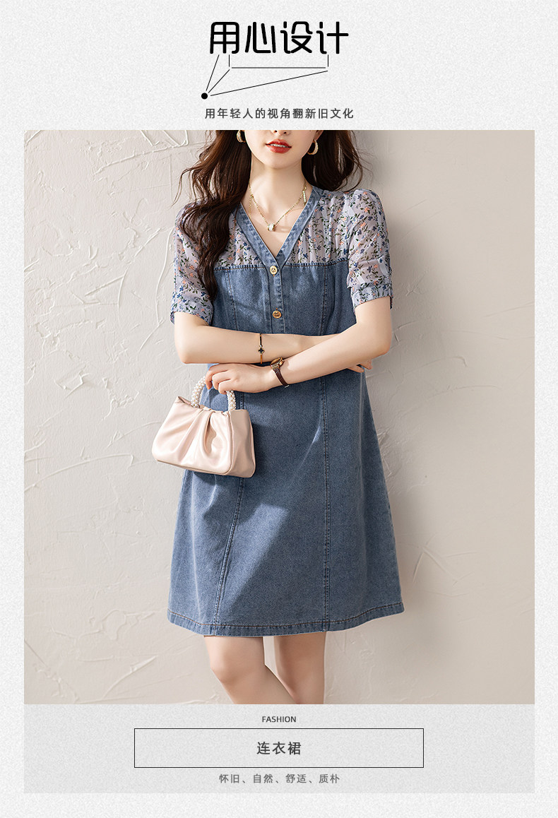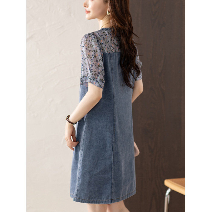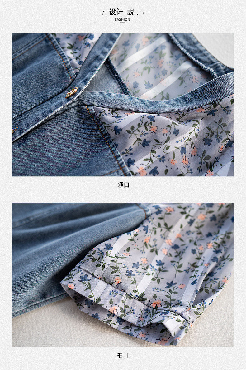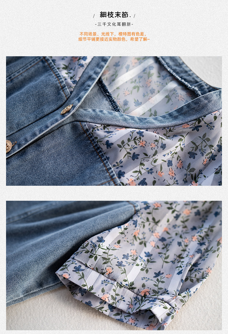 九月陌墨法式碎花拼接連衣裙假兩件夏2025新款收腰顯瘦氣質牛仔裙