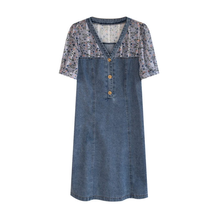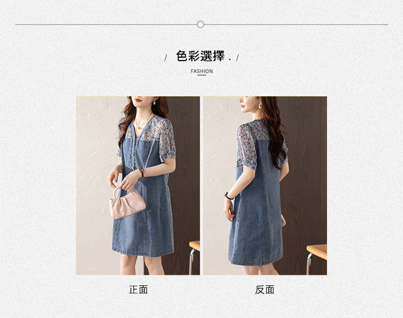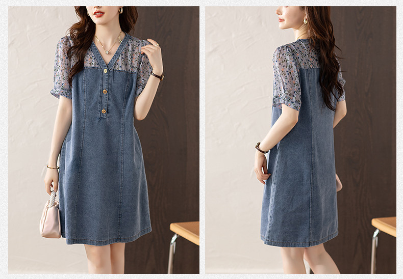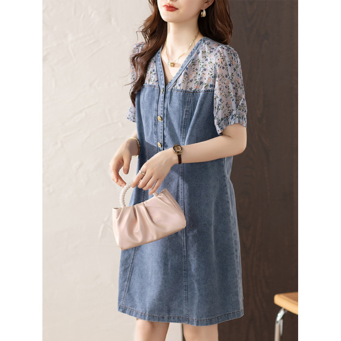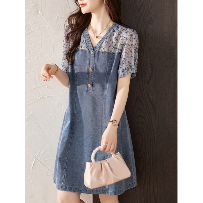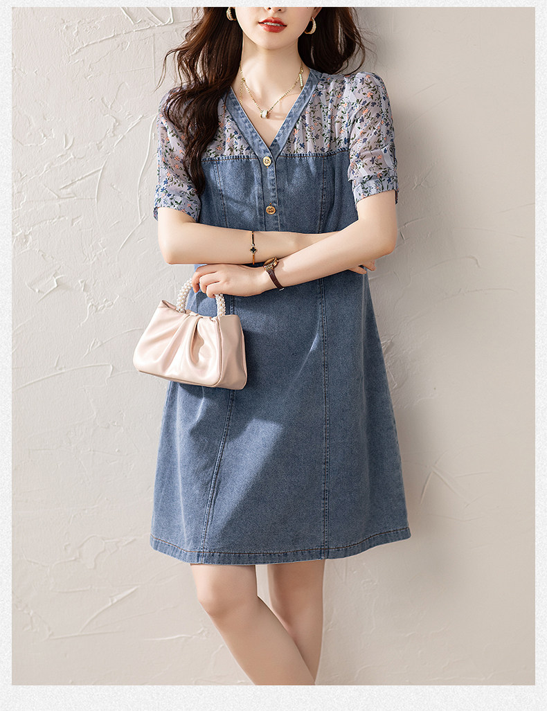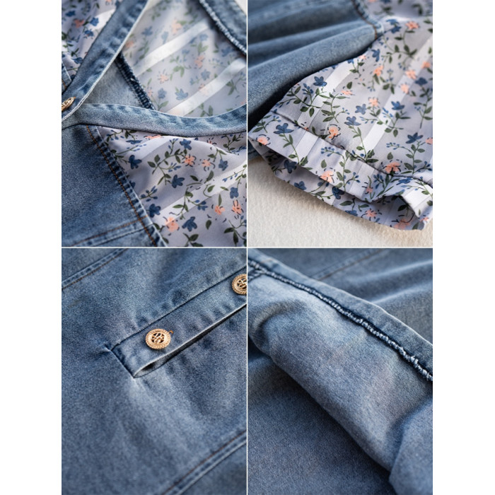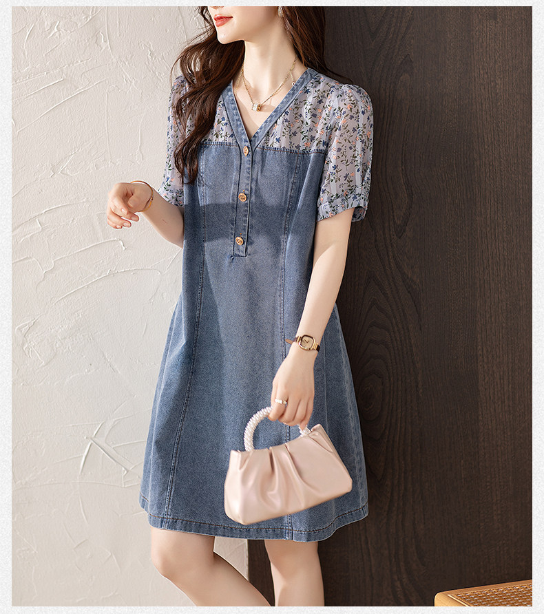 九月陌墨法式碎花拼接連衣裙假兩件夏2025新款收腰顯瘦氣質牛仔裙