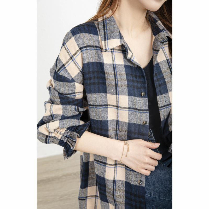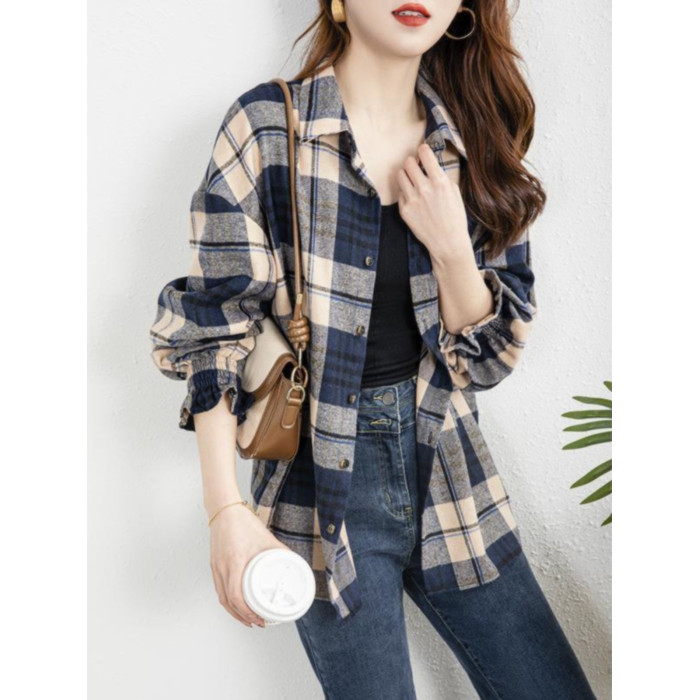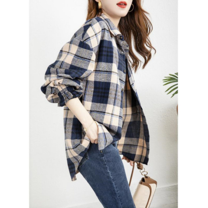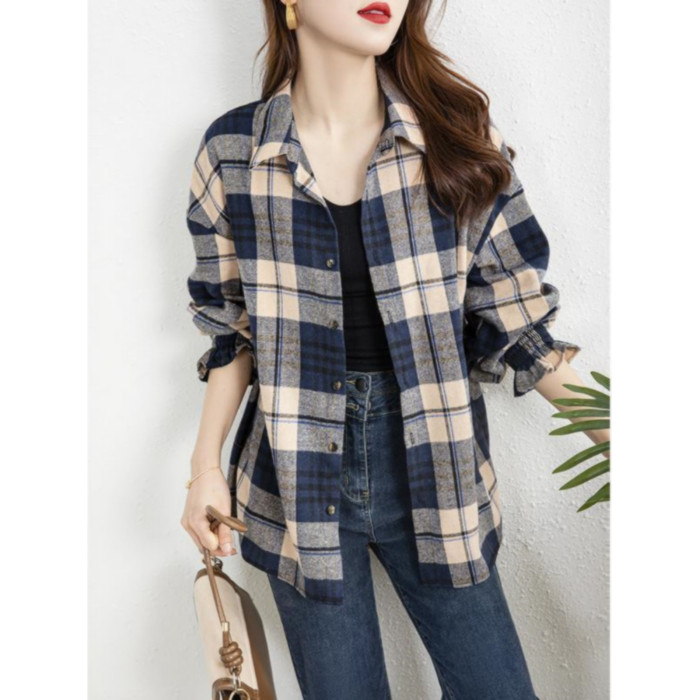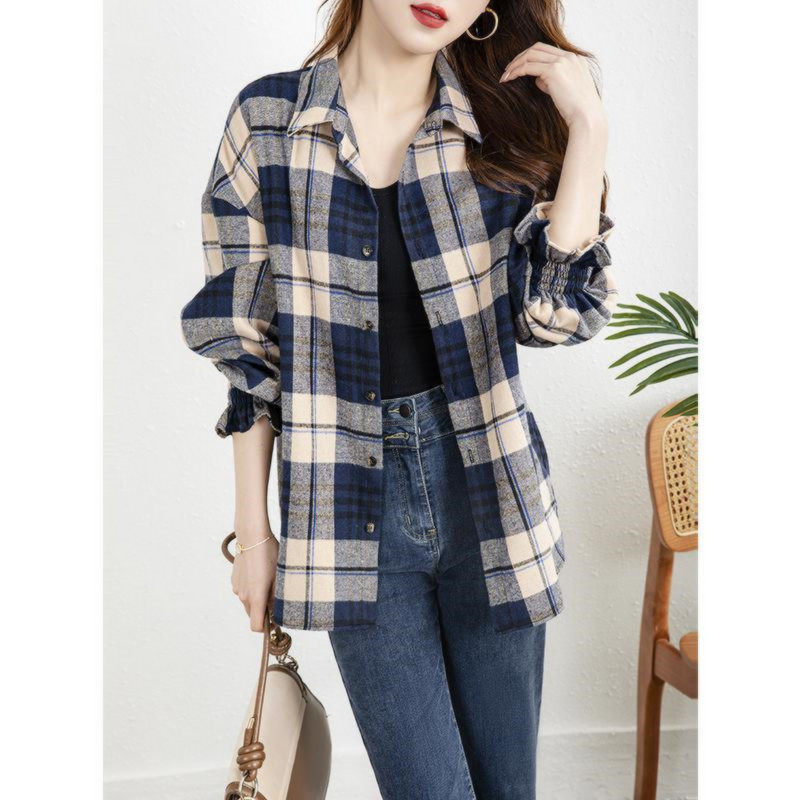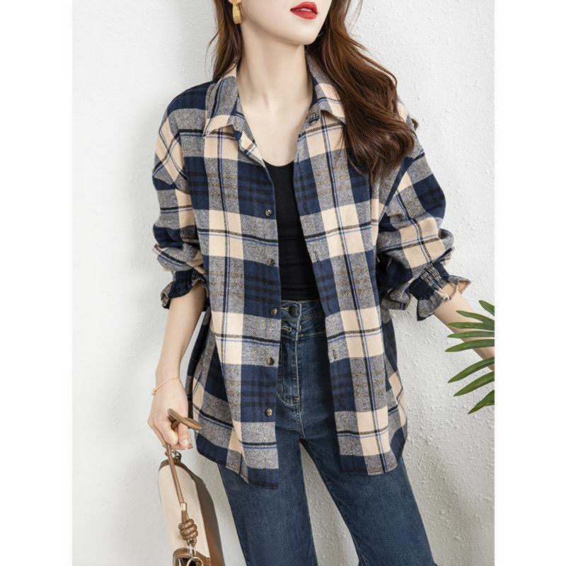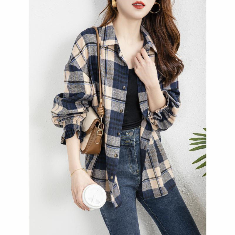 英倫風格子襯衫女款2023新款磨毛長袖上衣復古通勤曡穿外搭襯衣潮