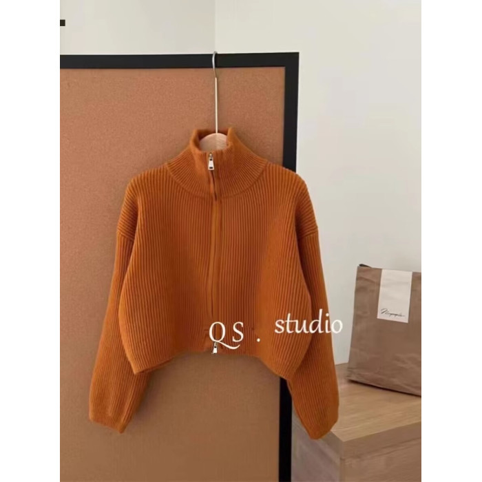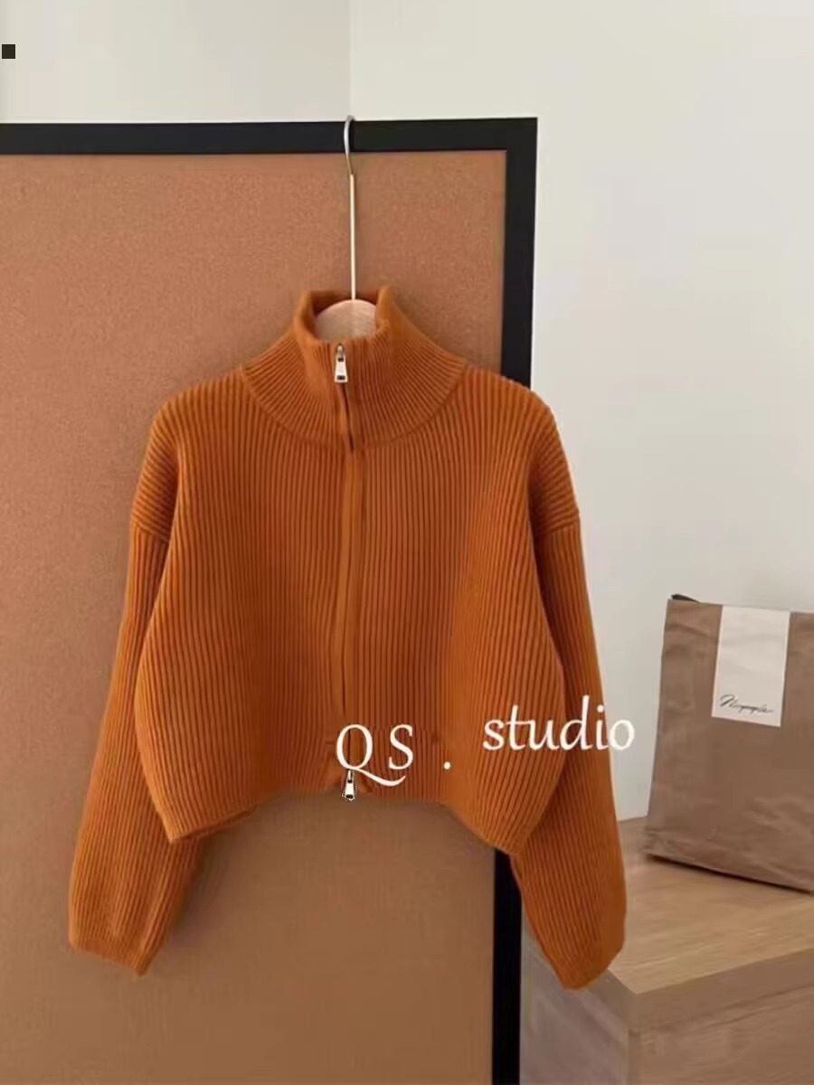 歐貨今年流行漂亮高領短款針織開衫外搭上衣女秋冬季拉鍊毛衣外套