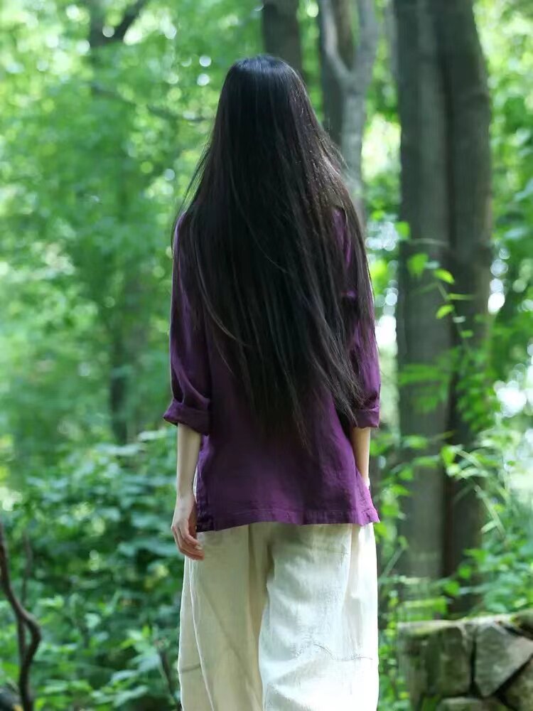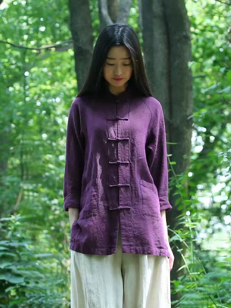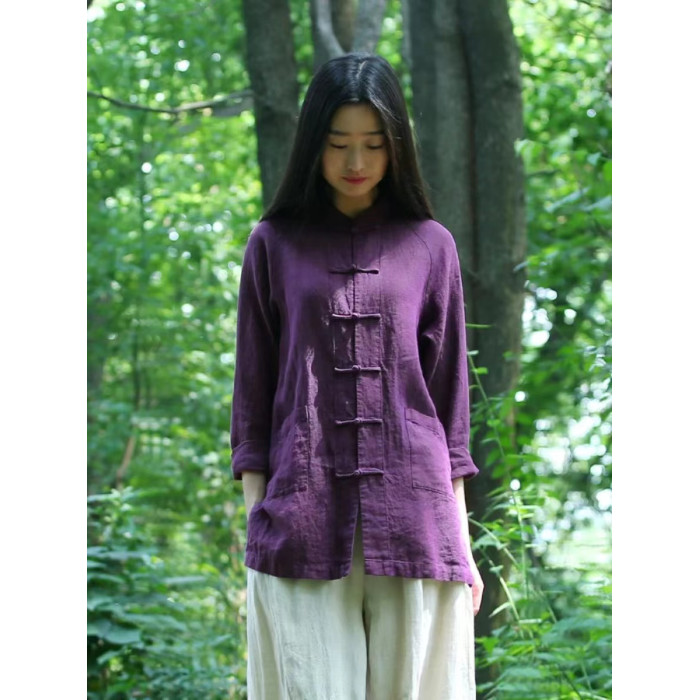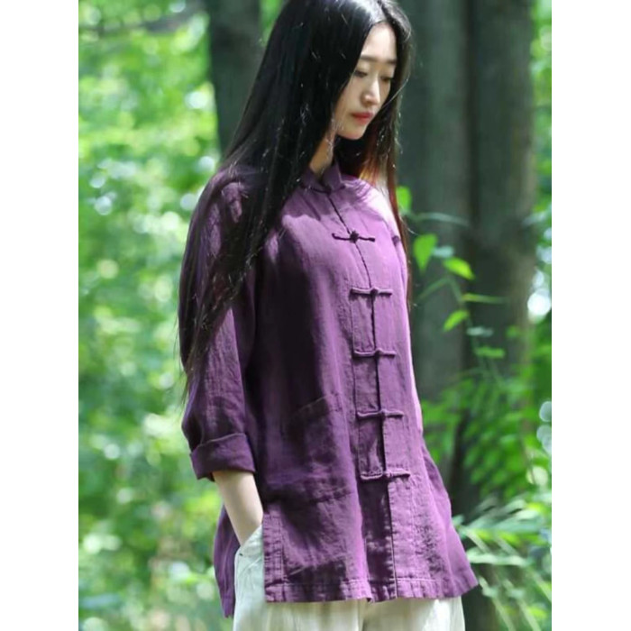 中式復古雙開衩棉麻上衣女秋季國風紫色對襟盤釦唐裝襯衫