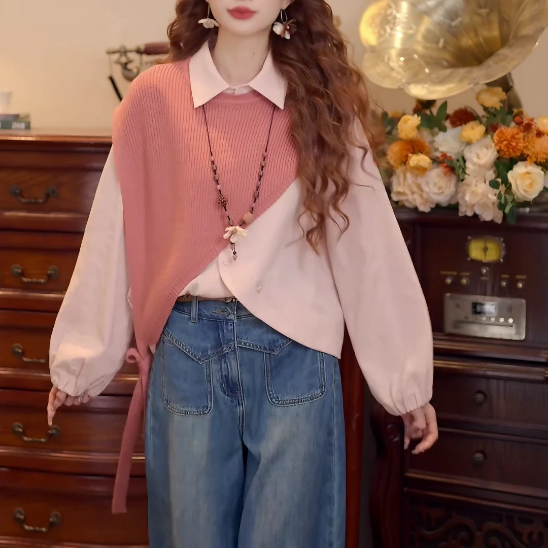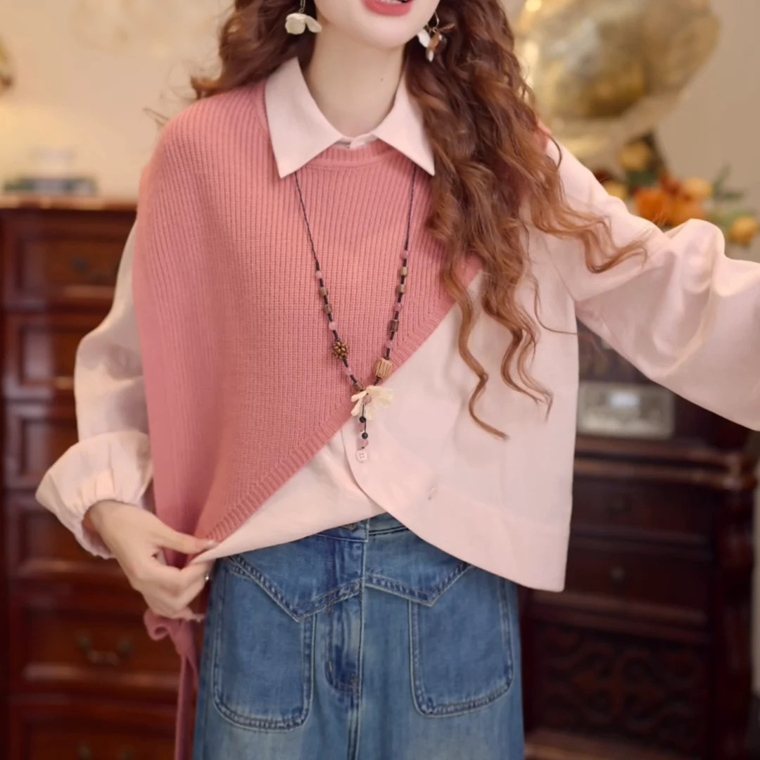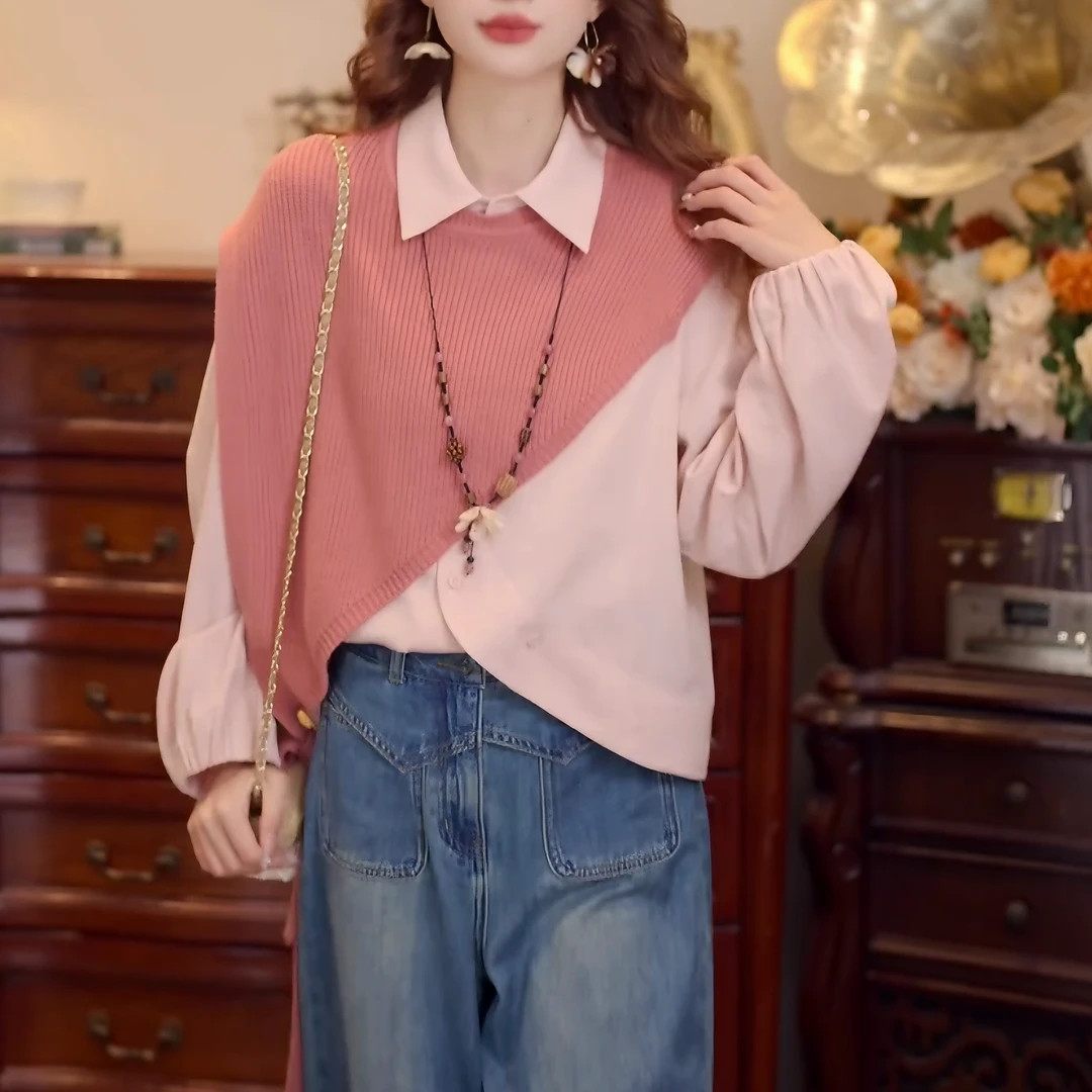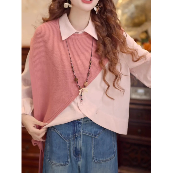 大碼2026年春季新款設計款港風復古披肩拼接長袖百搭寬鬆襯衫上衣