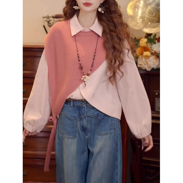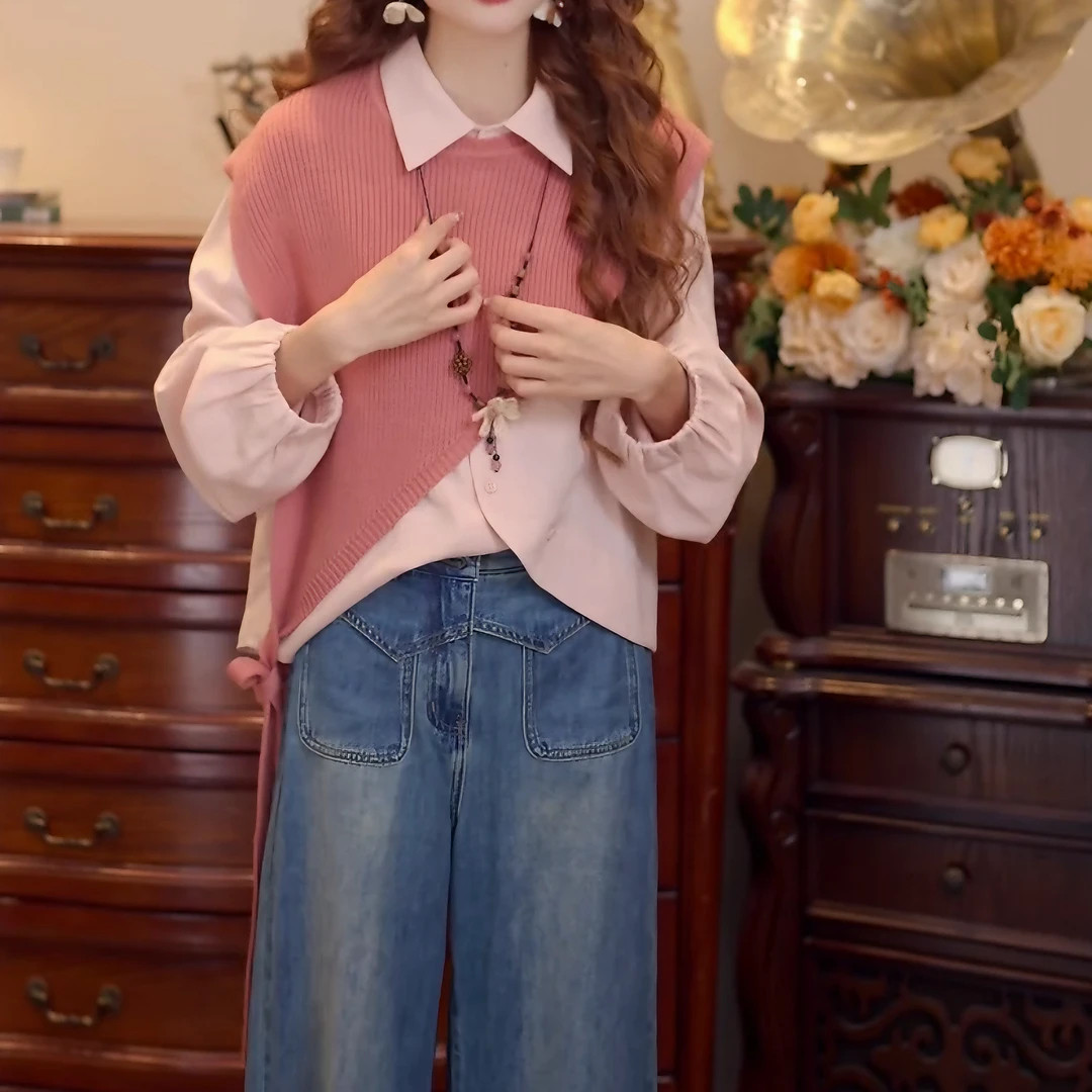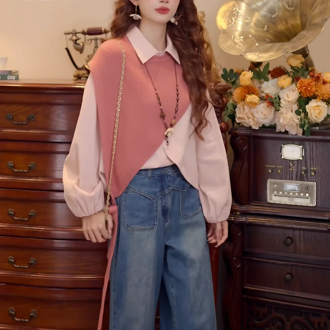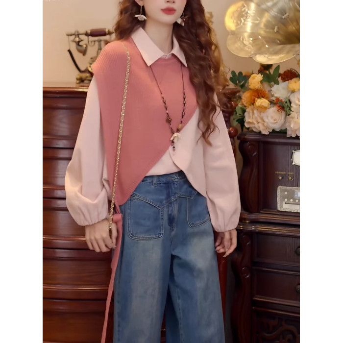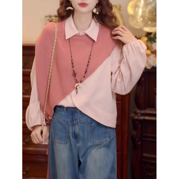 大碼2026年春季新款設計款港風復古披肩拼接長袖百搭寬鬆襯衫上衣