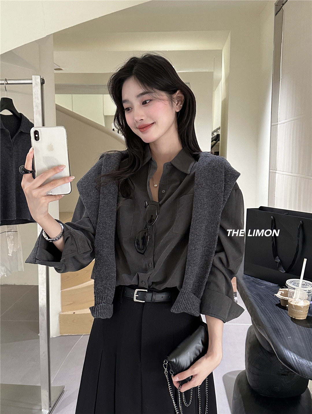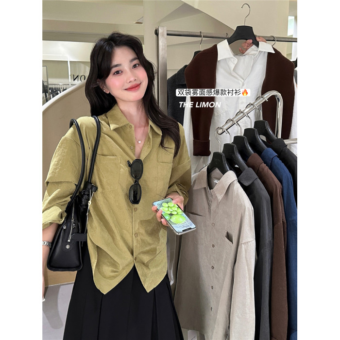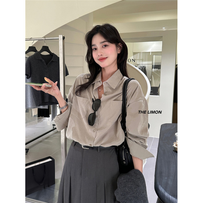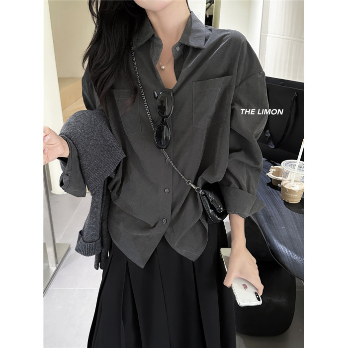 法式通勤高級霧面感長袖灰色襯衫秋冬女士雙口袋小衆上衣曡穿襯衣