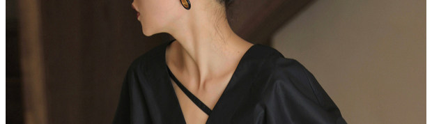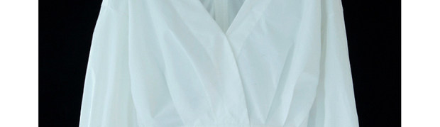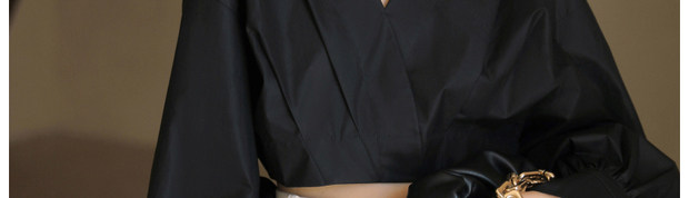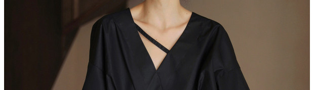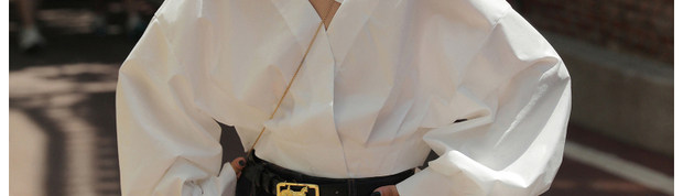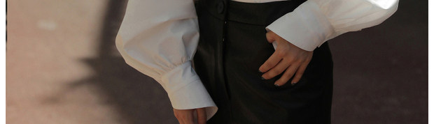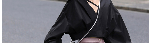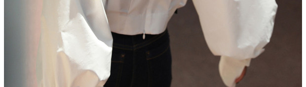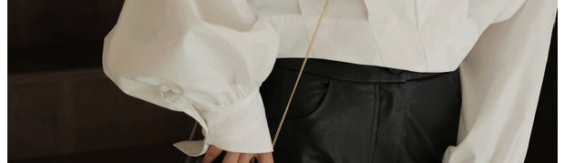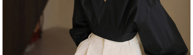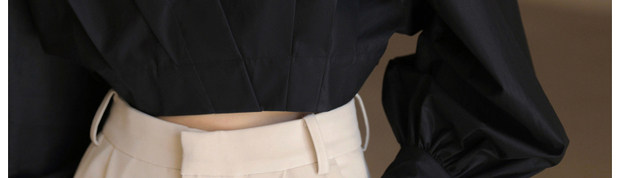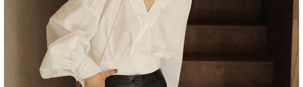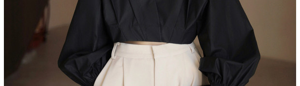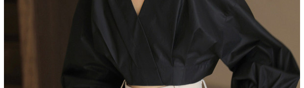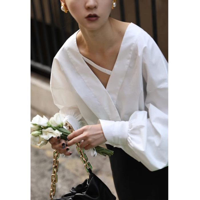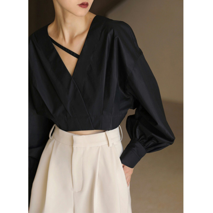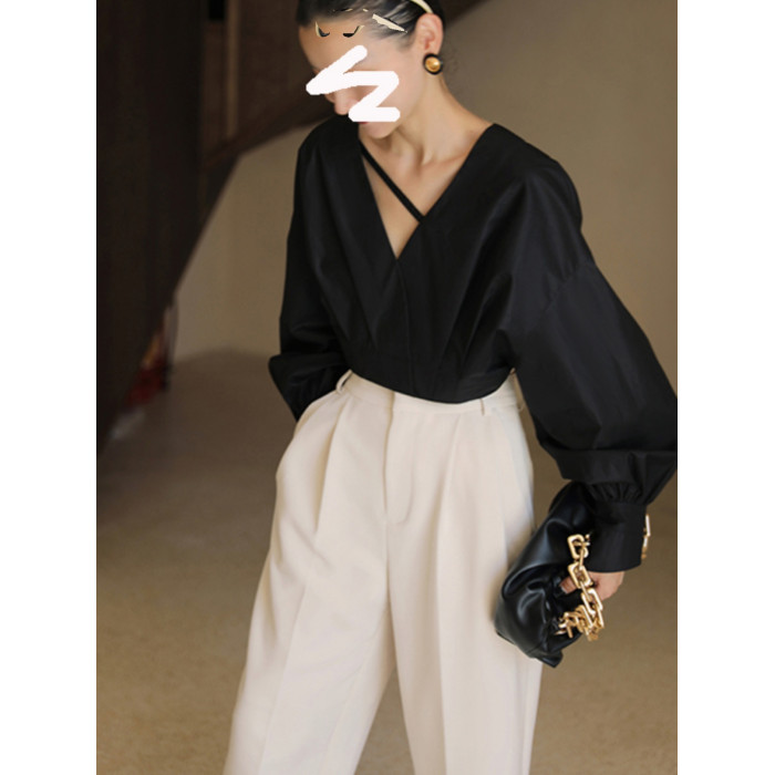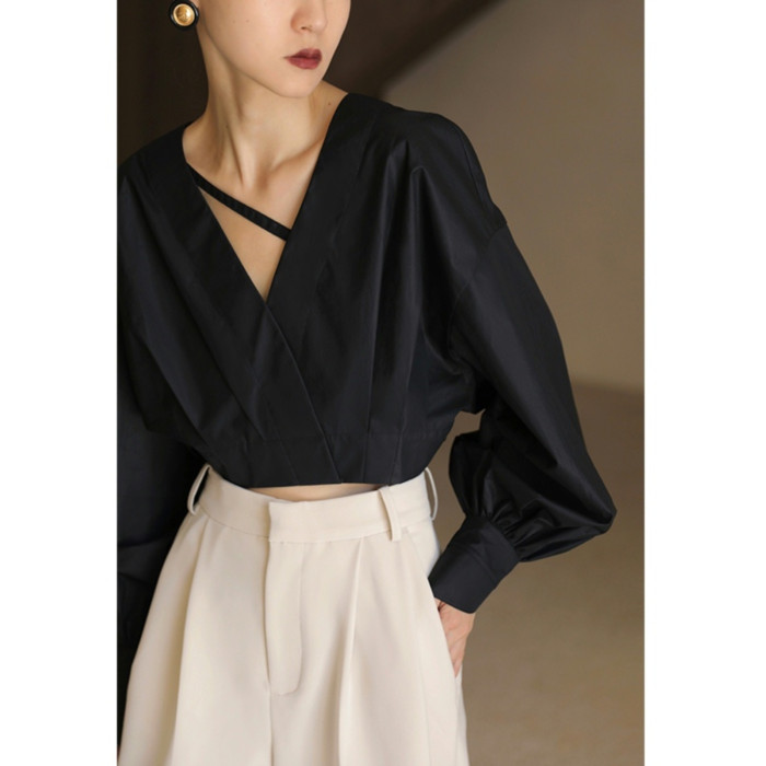品牌折釦歐貨女裝黑色紙片人襯衫女春秋V領泡泡袖露鎖骨短款上衣