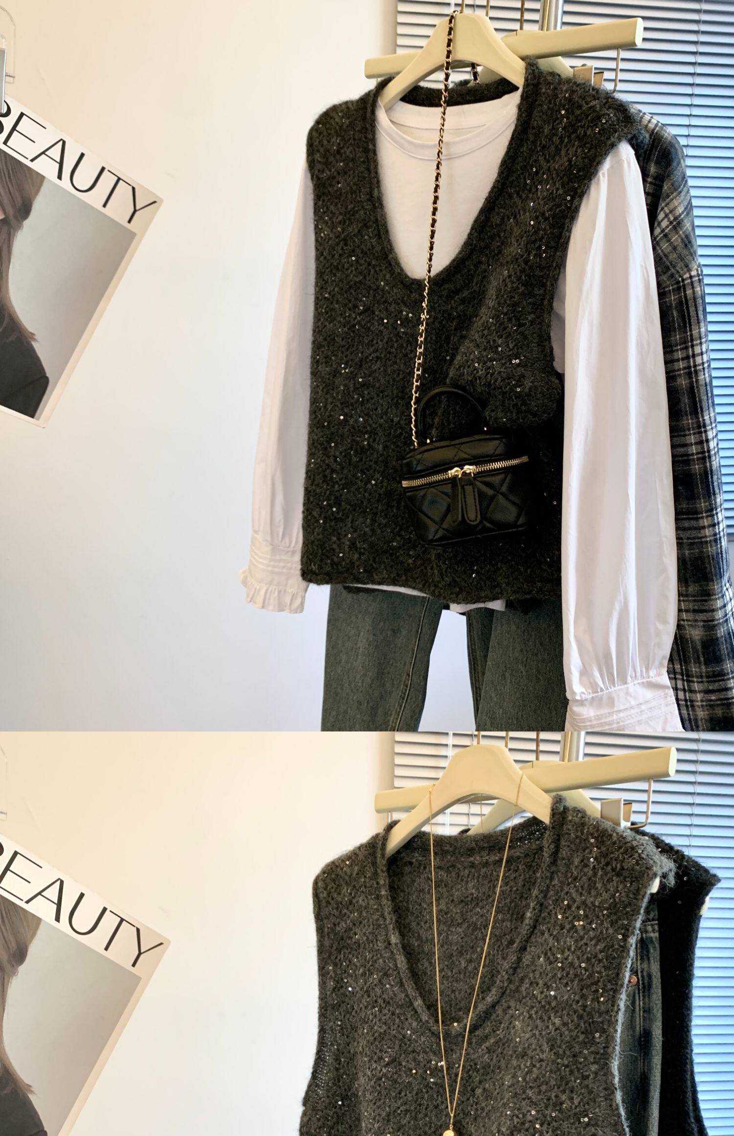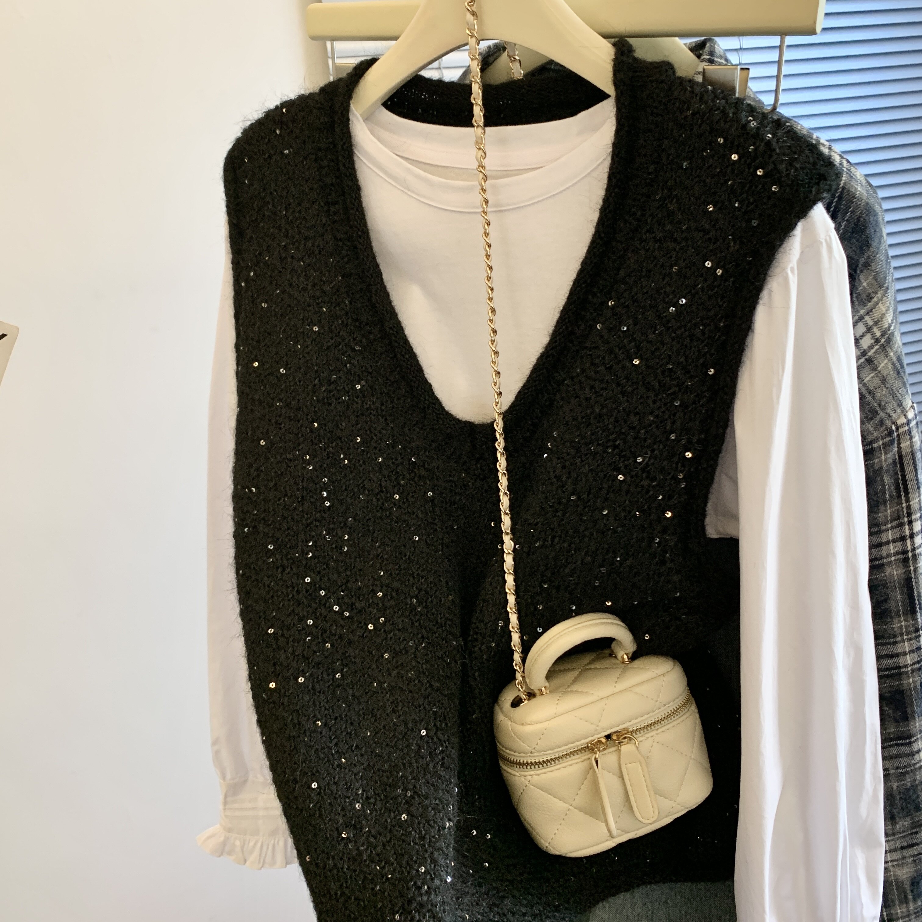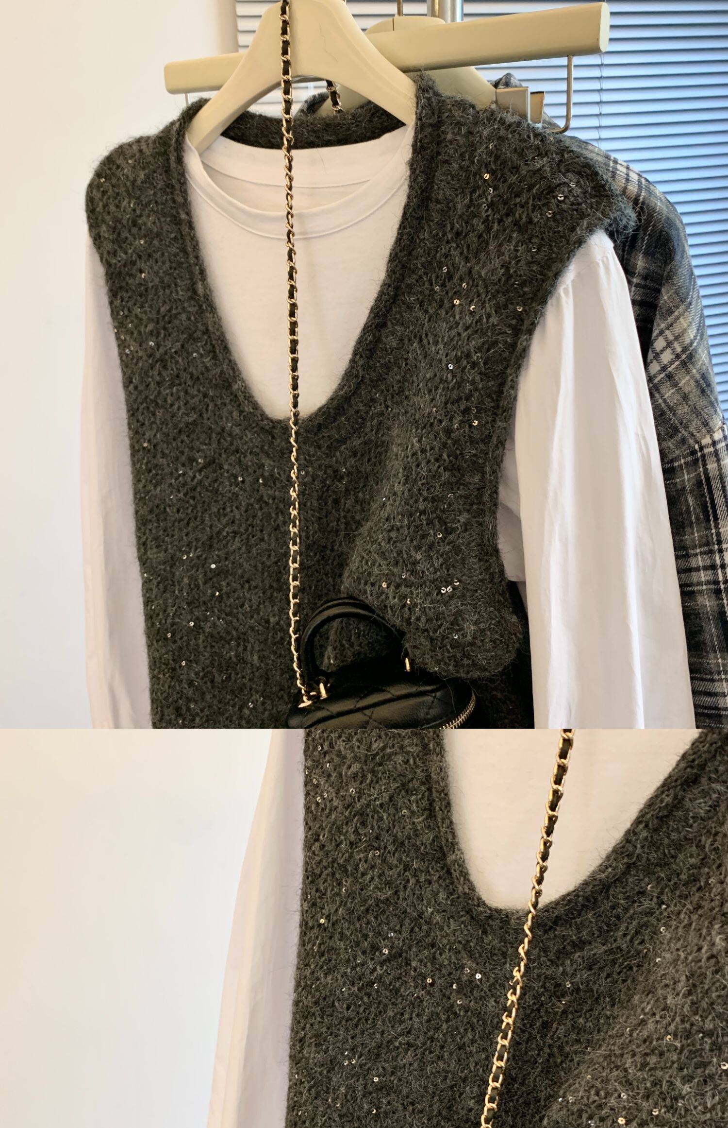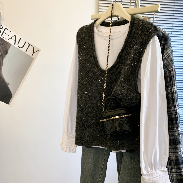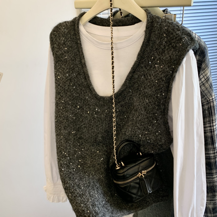 專櫃撤廻剪標重工亮片V領針織馬甲女2025新款百搭上衣曡穿兩件套