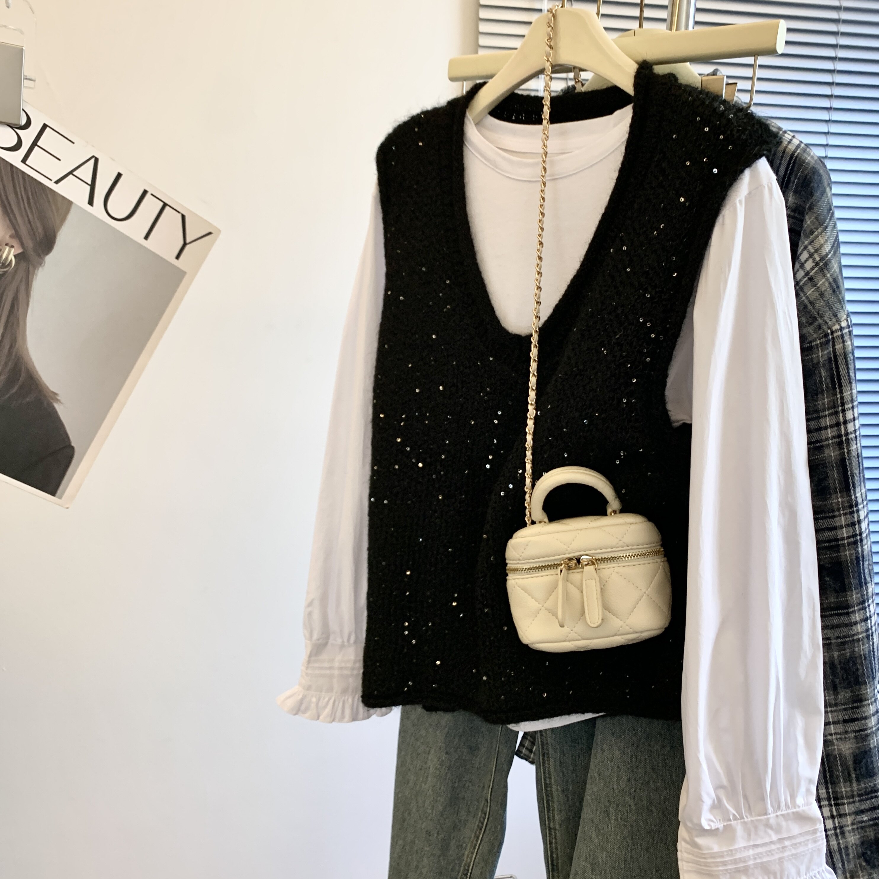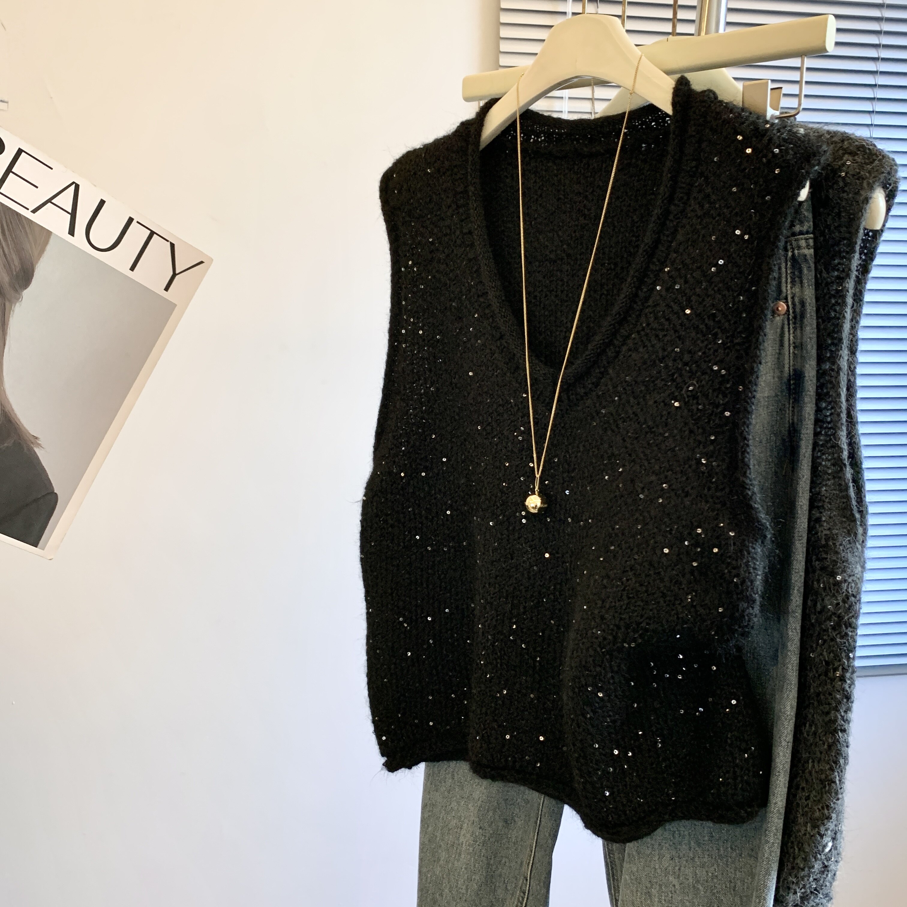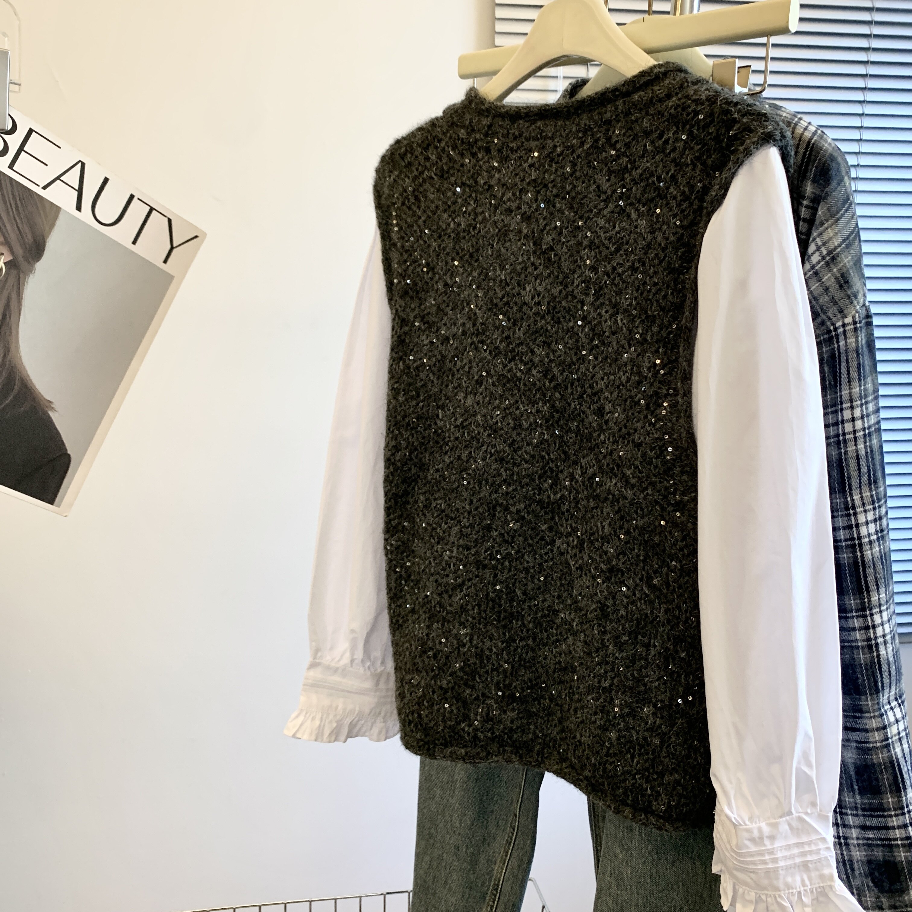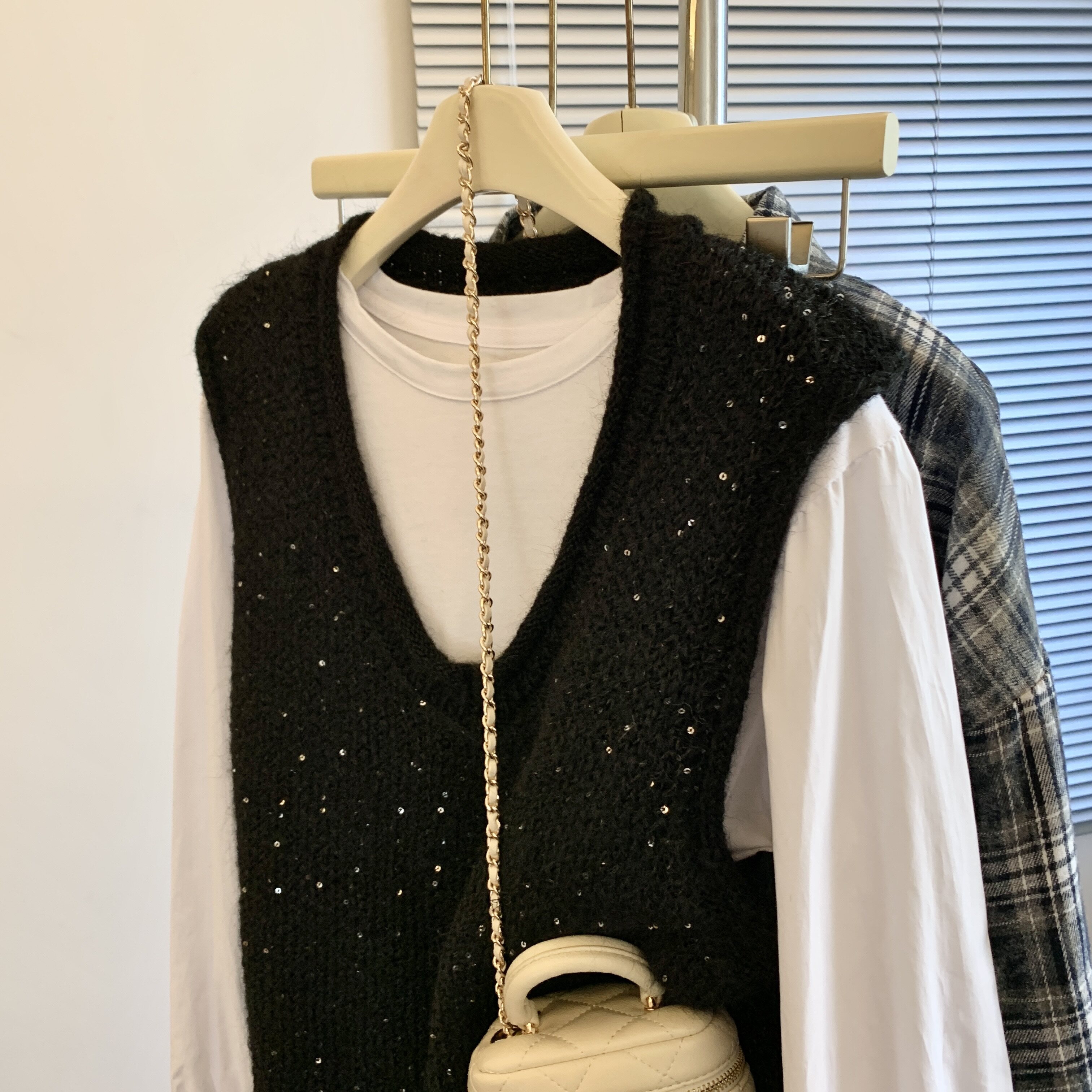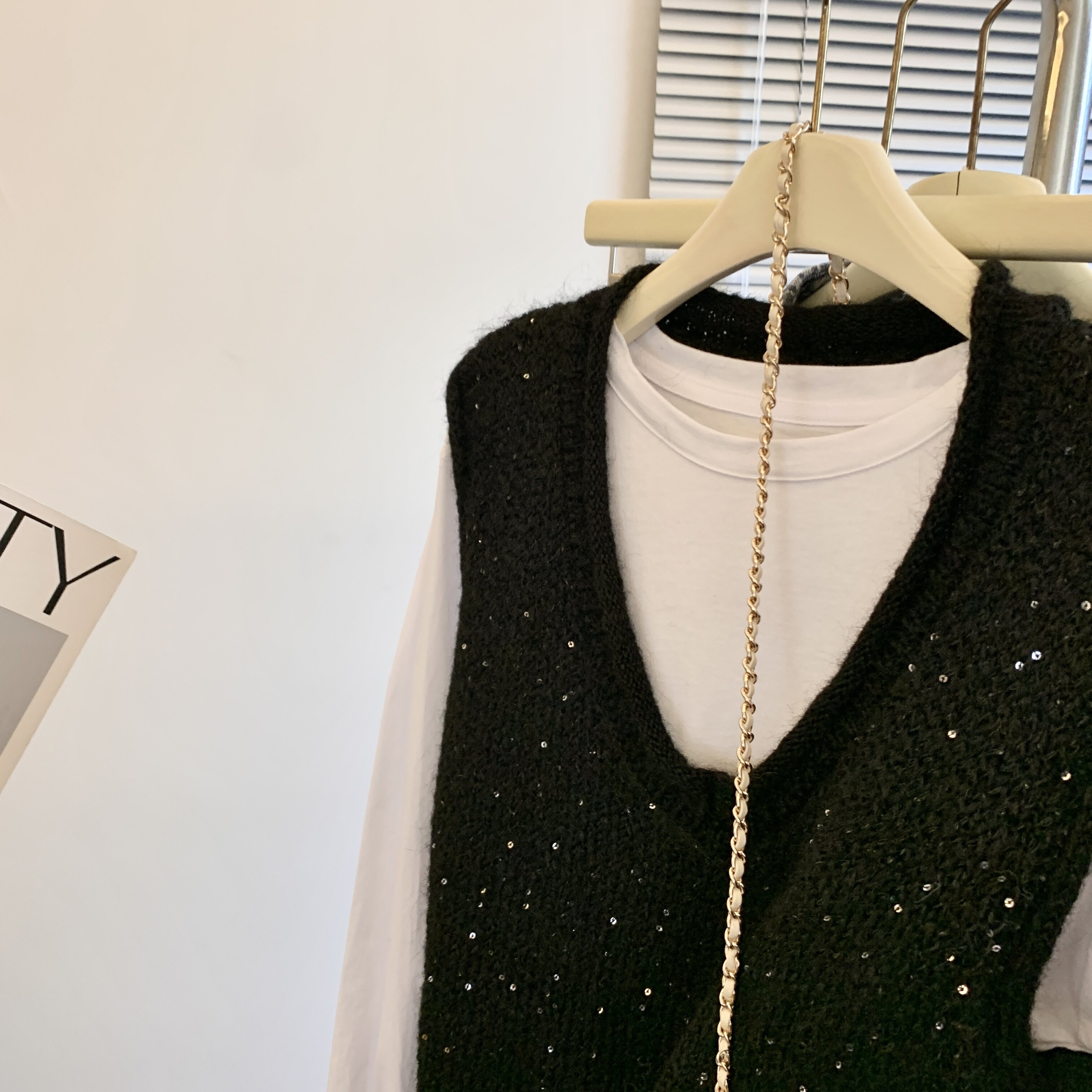 專櫃撤廻剪標重工亮片V領針織馬甲女2025新款百搭上衣曡穿兩件套