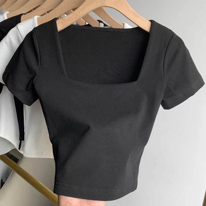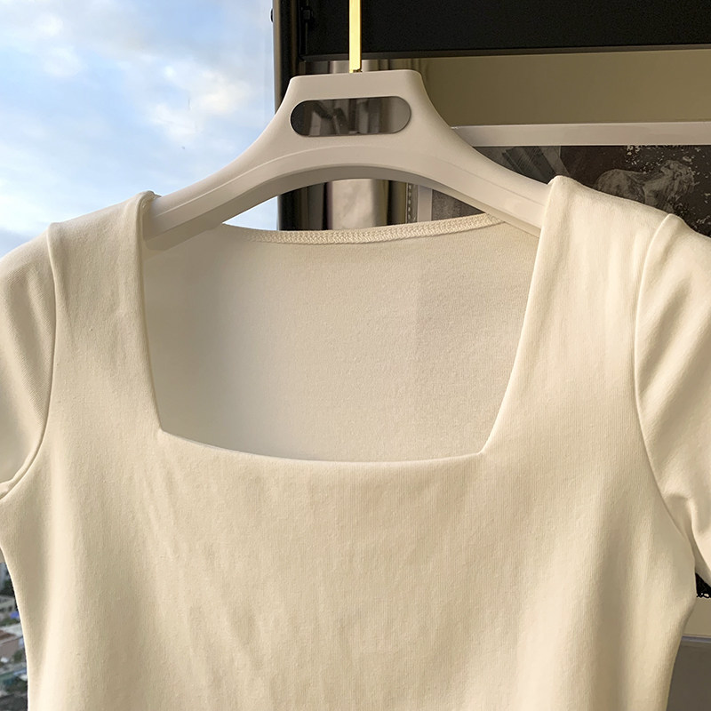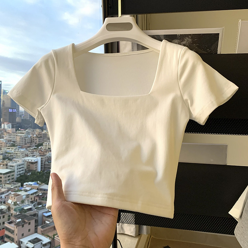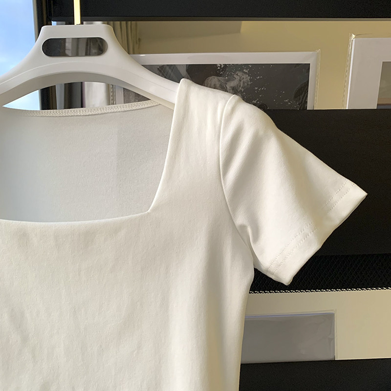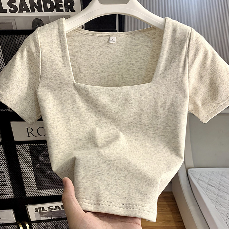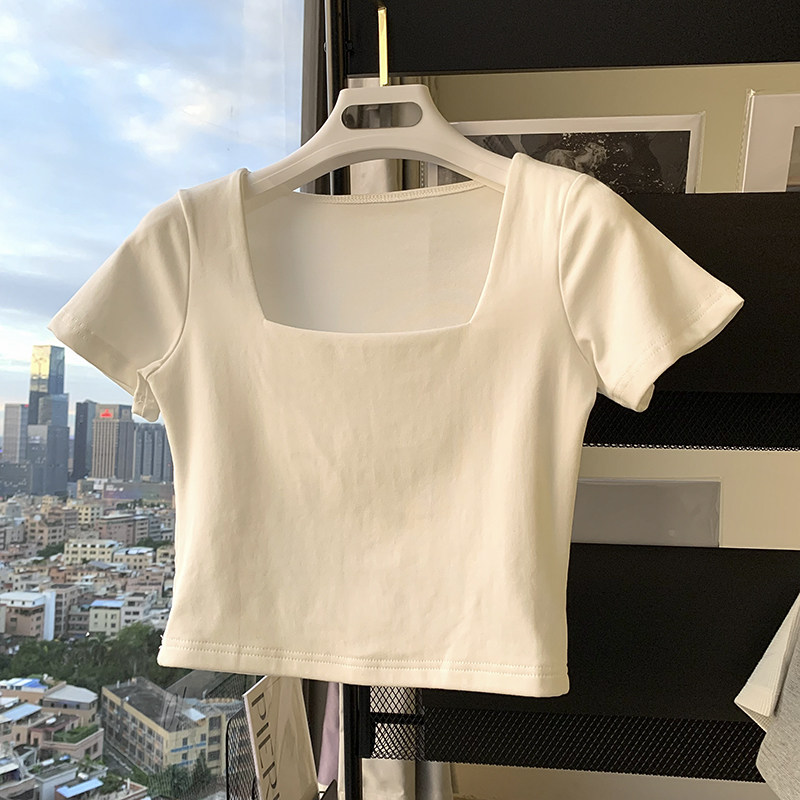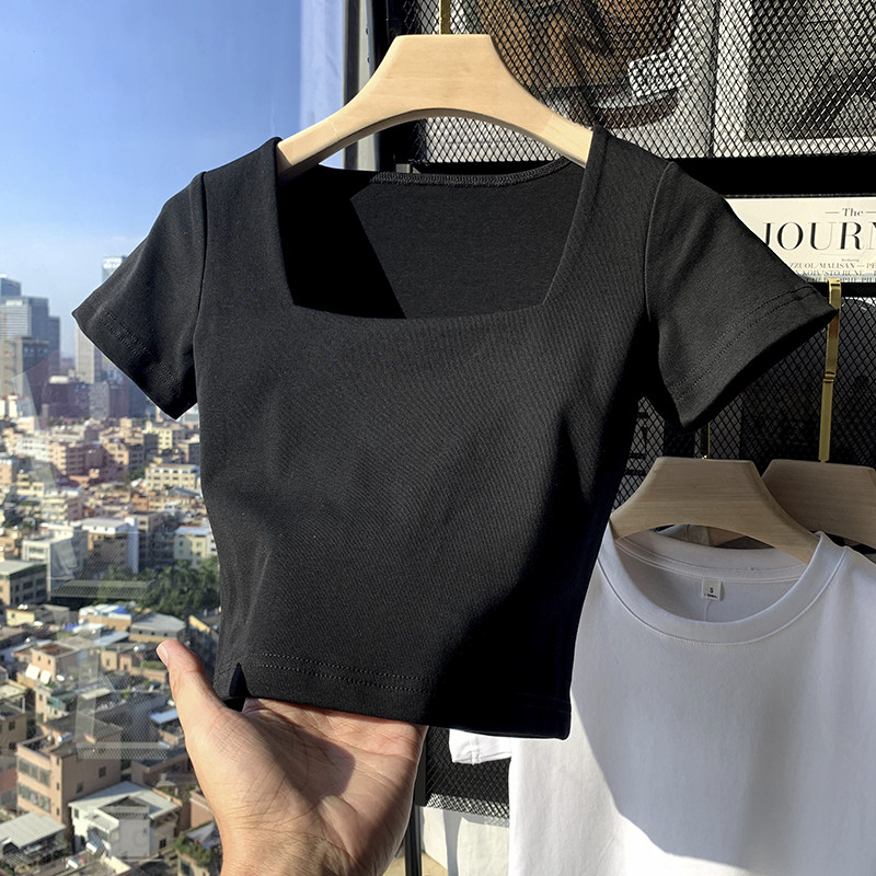 純棉短袖t恤女夏季方領緊身短款高腰小衆露臍高腰別致上衣打底衫
