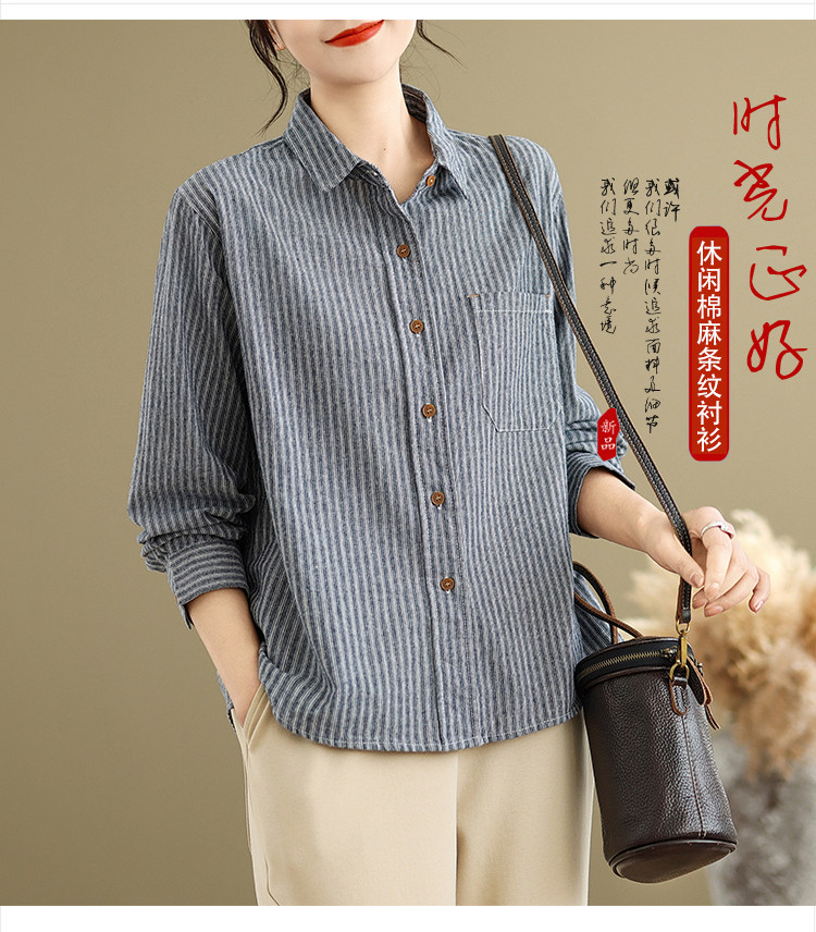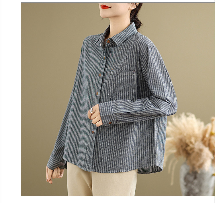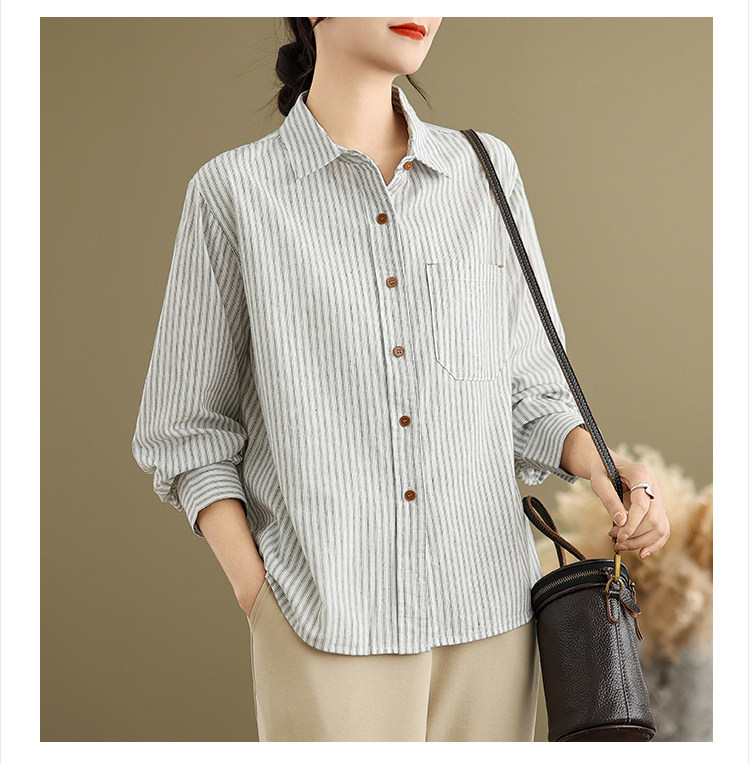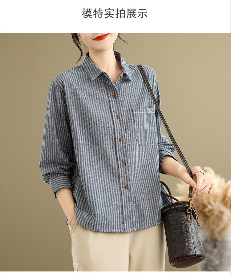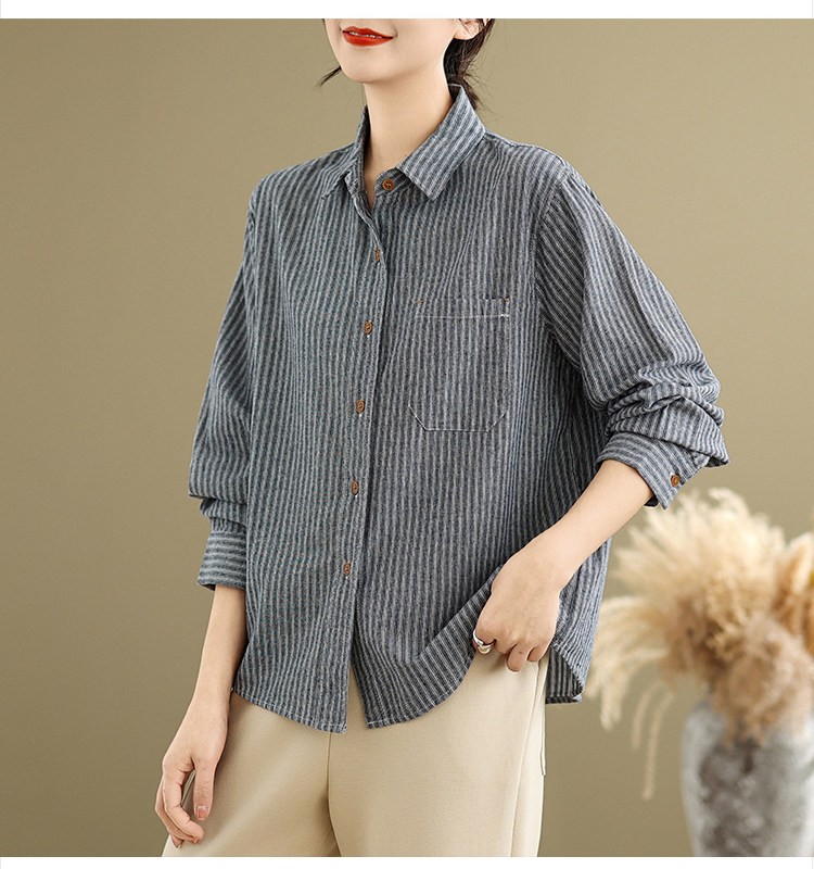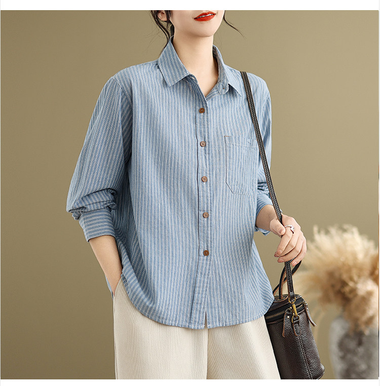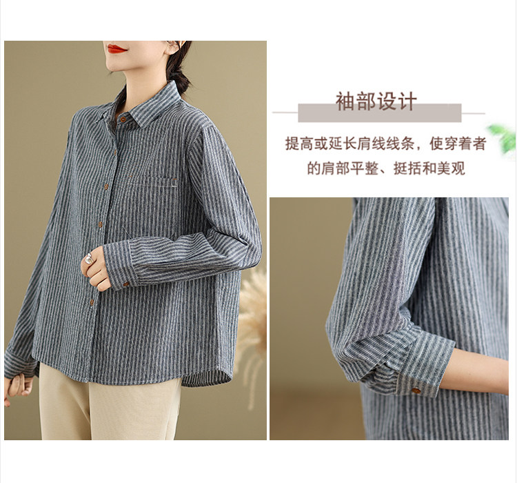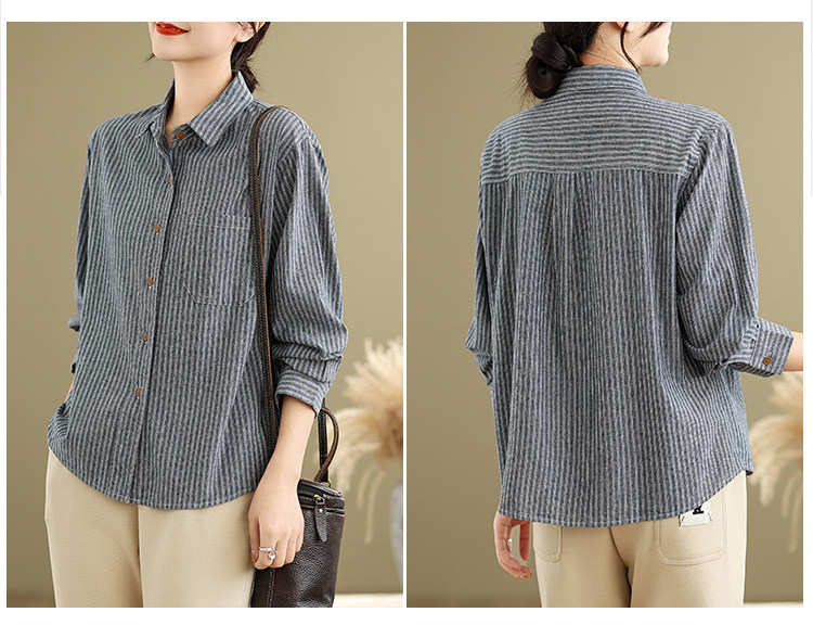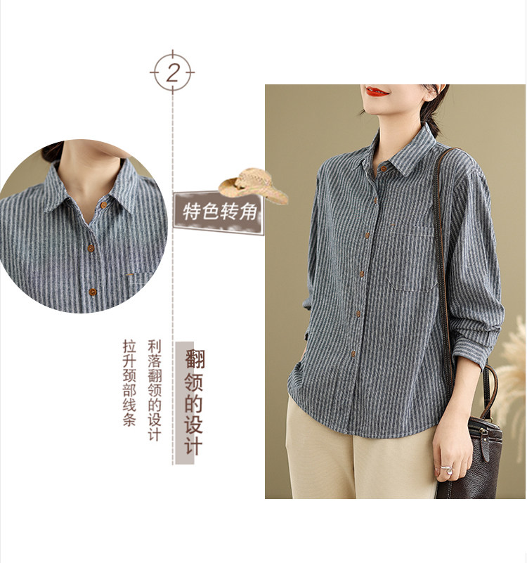 商場折釦~專櫃撤廻大碼春季純棉條紋襯衫女休閒寬鬆顯瘦長袖襯衣
