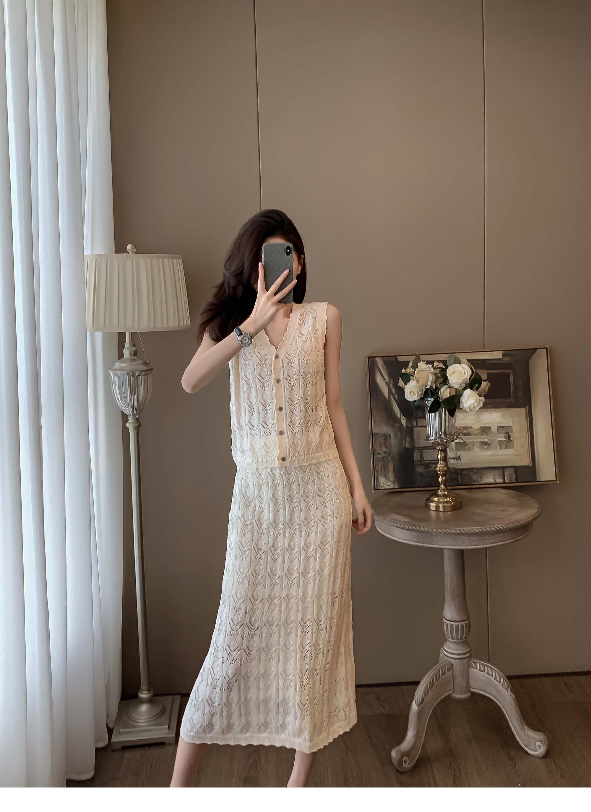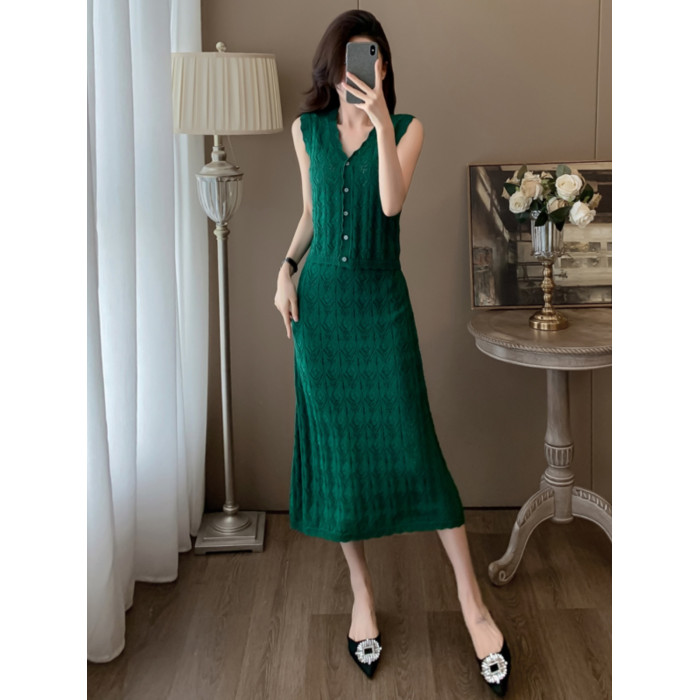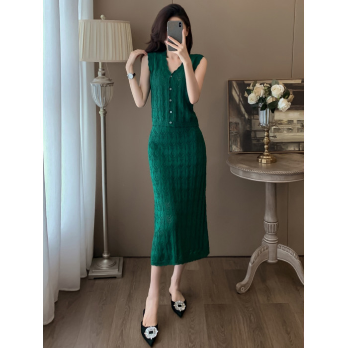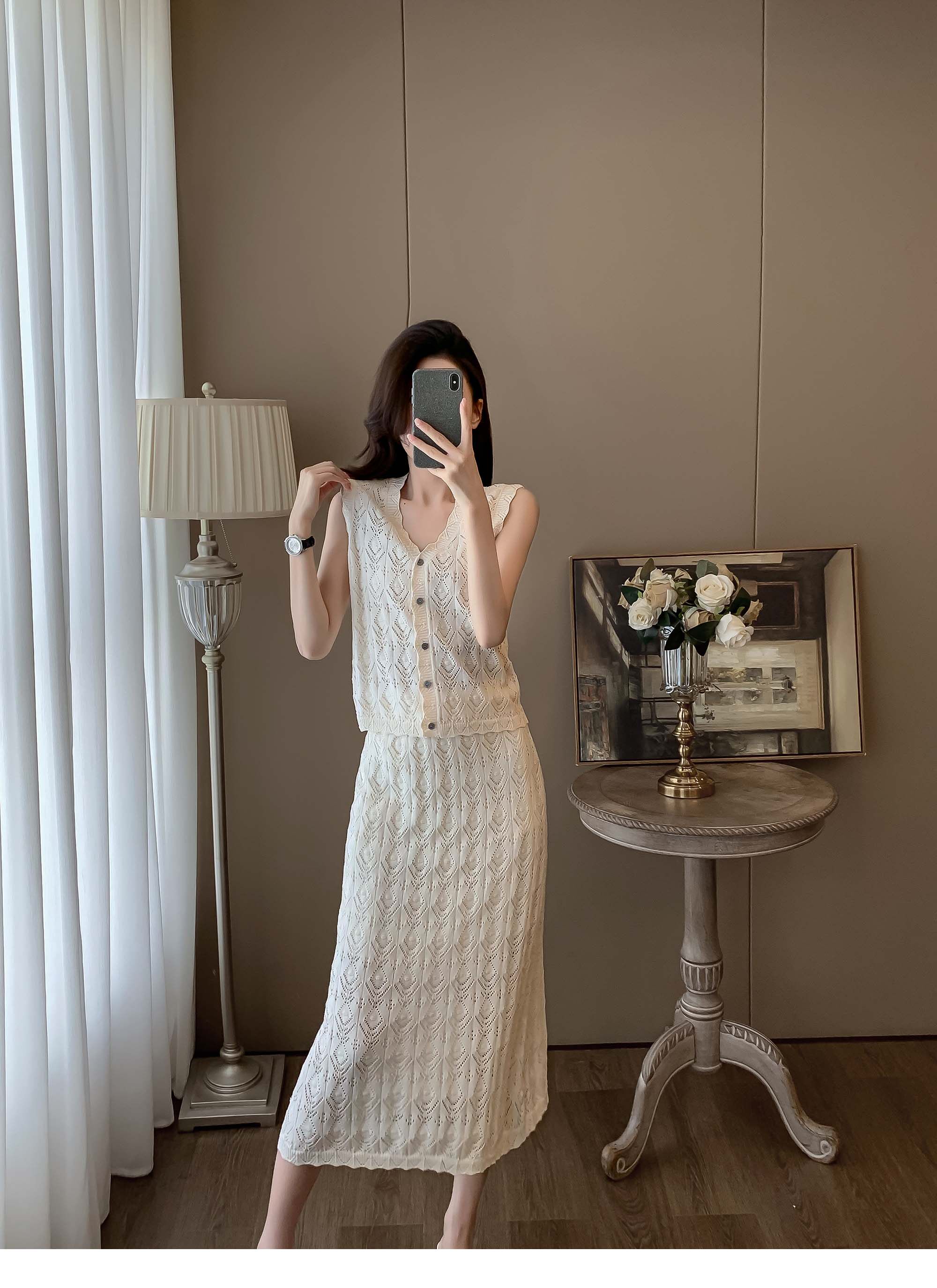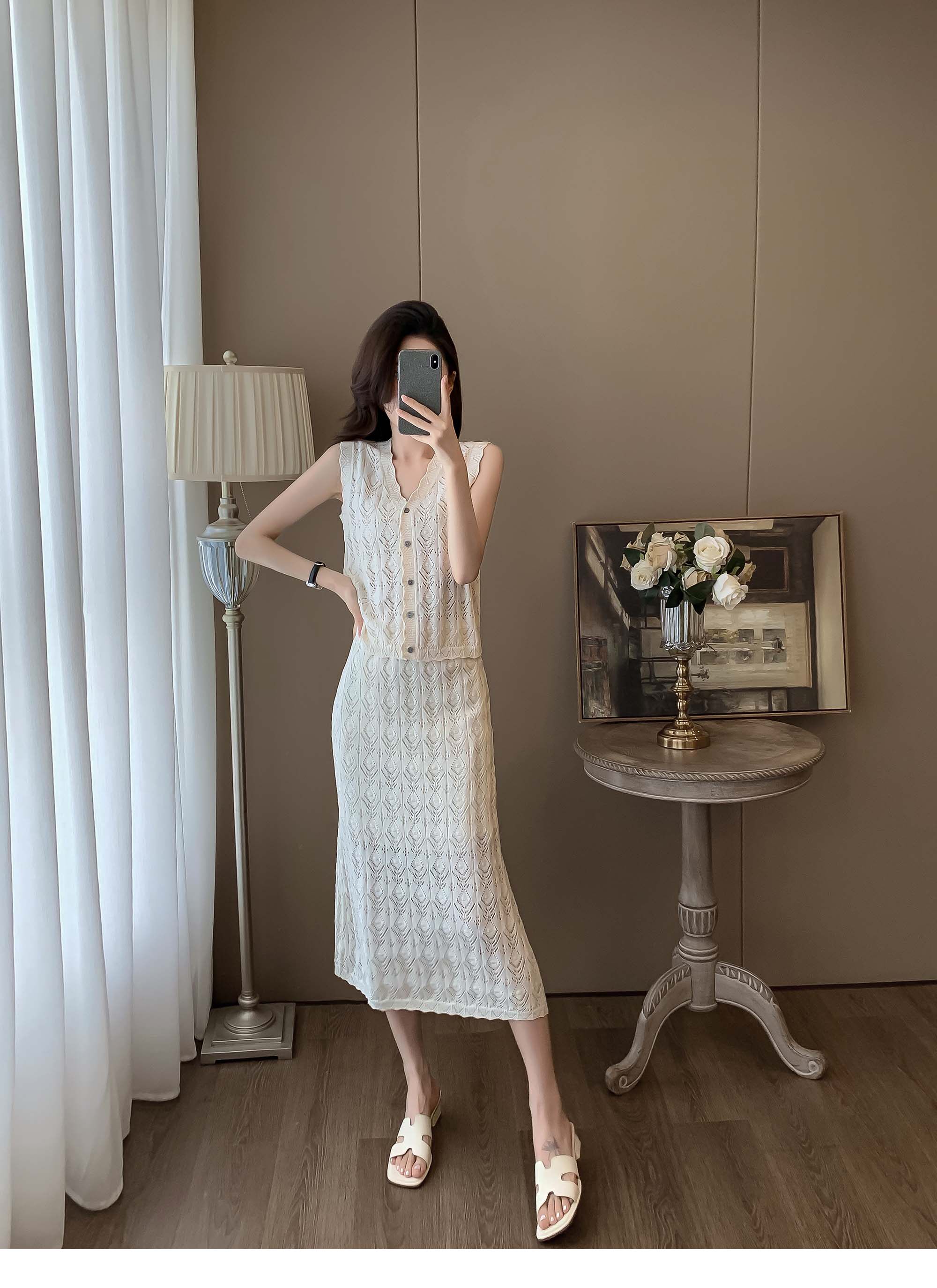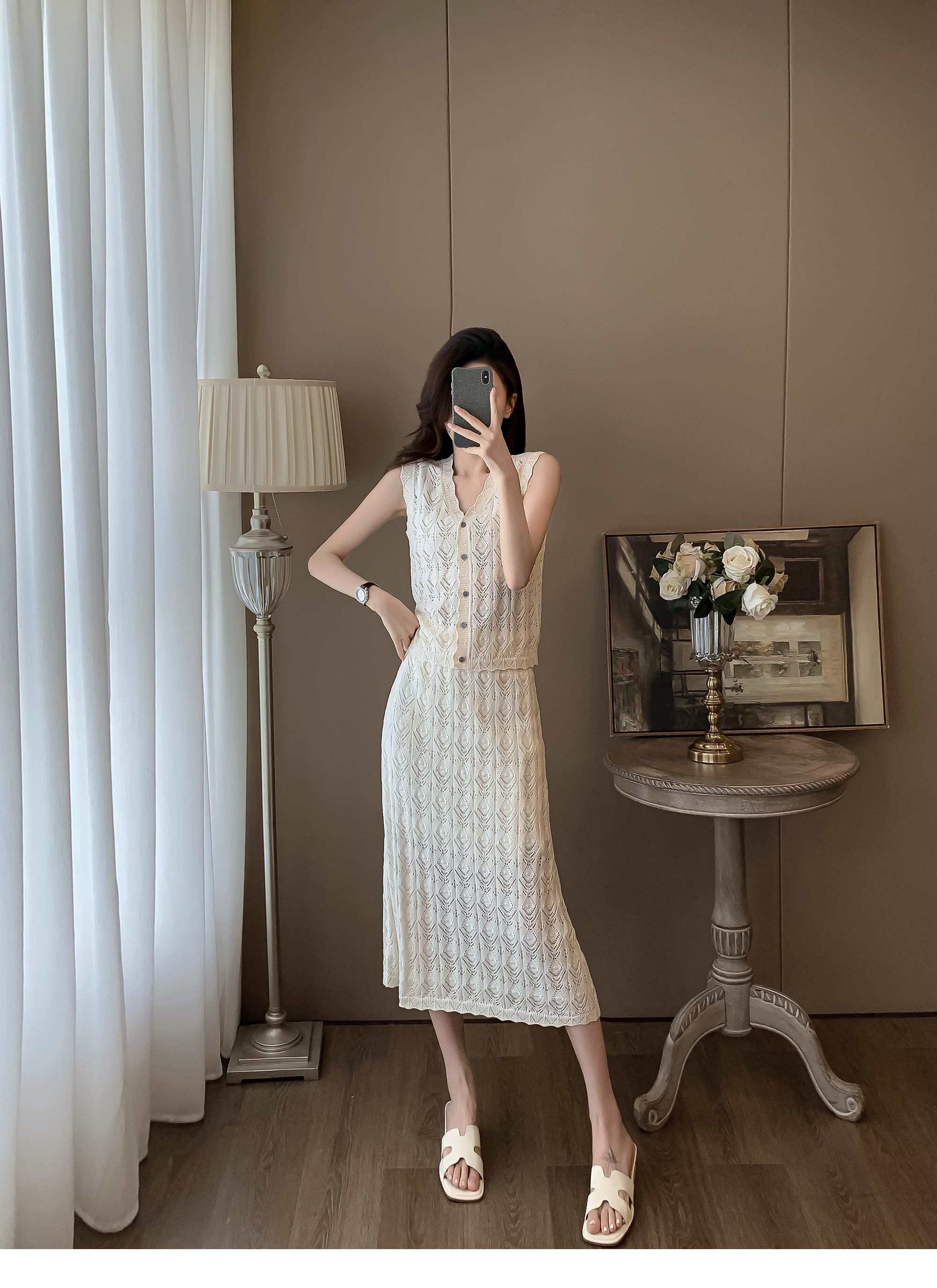度假風設計感小心機鏤空背心冰絲針織套裝裙女V領針織衫半身a字裙