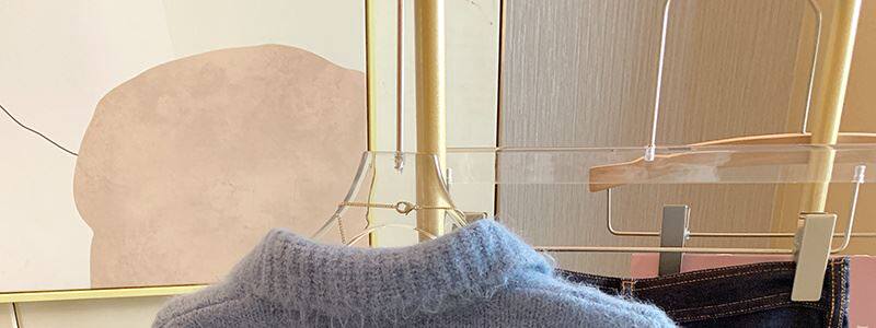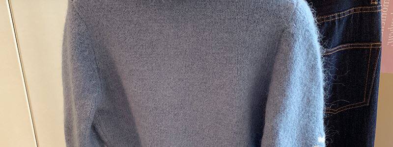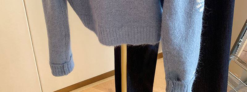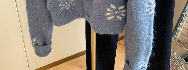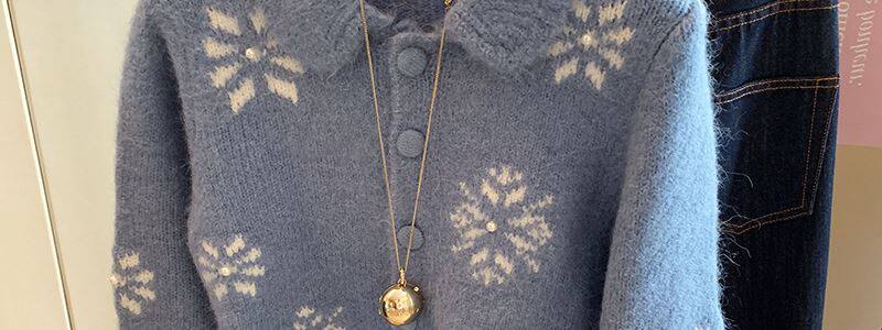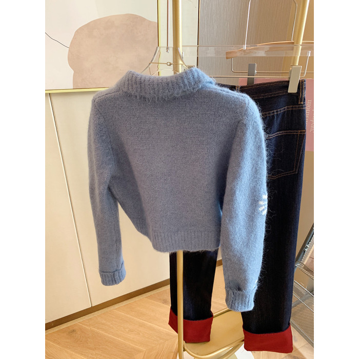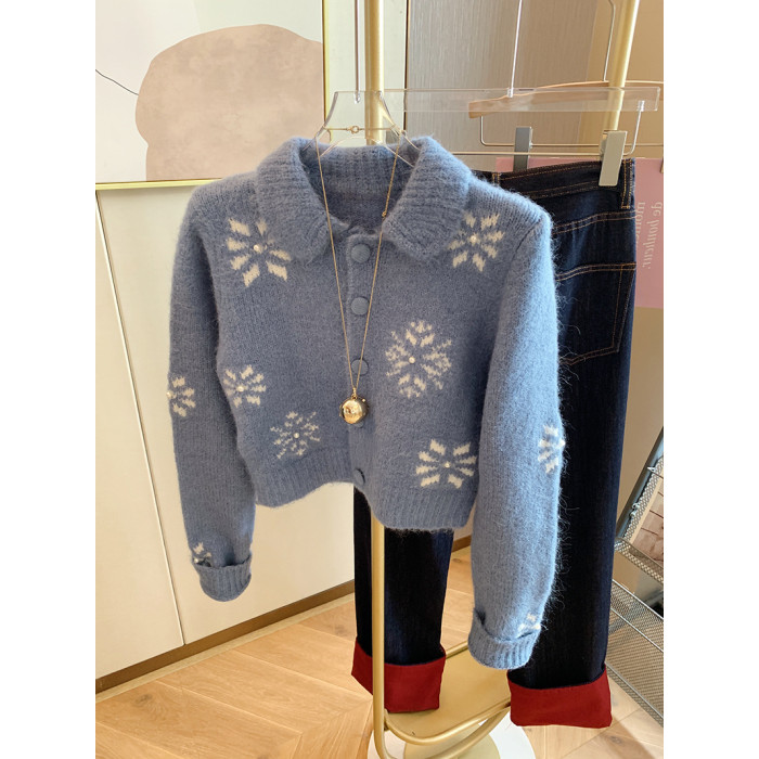 大牌專櫃撤廻藍色提花娃娃領針織開衫女冬季新款百搭軟糯毛衣
