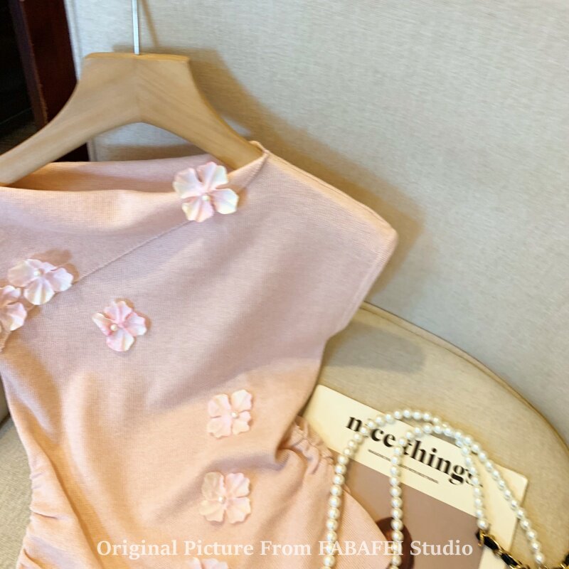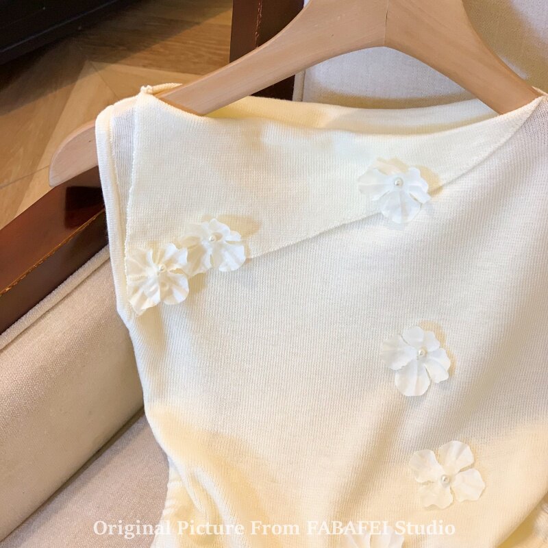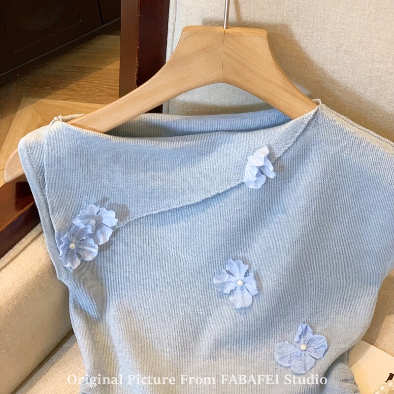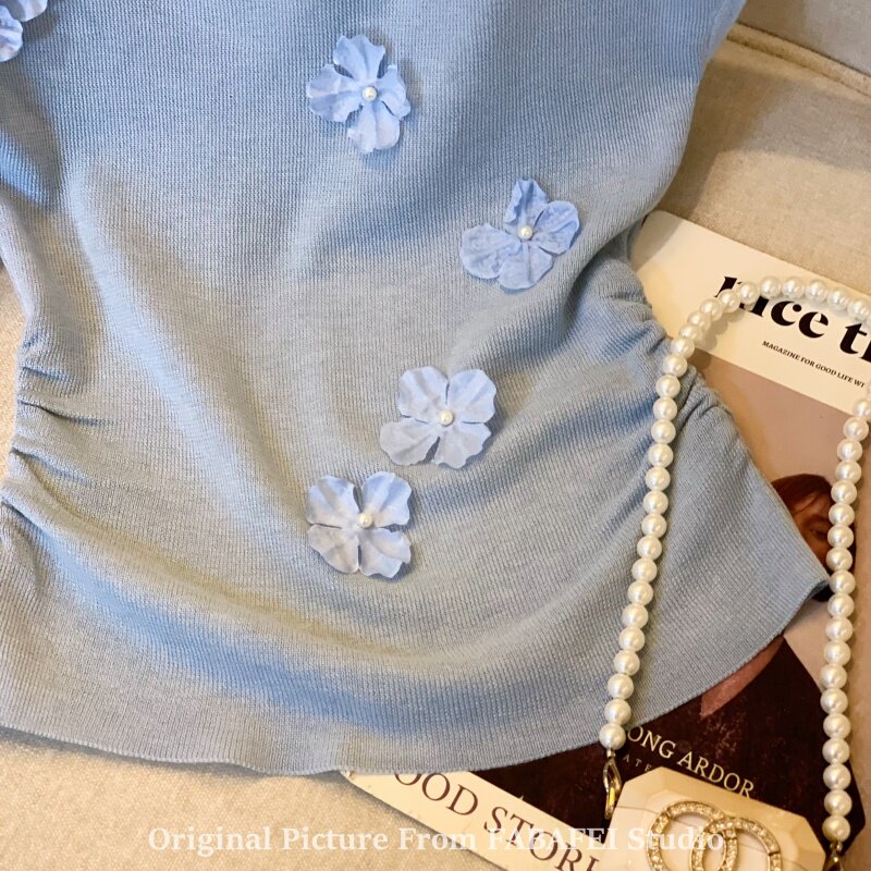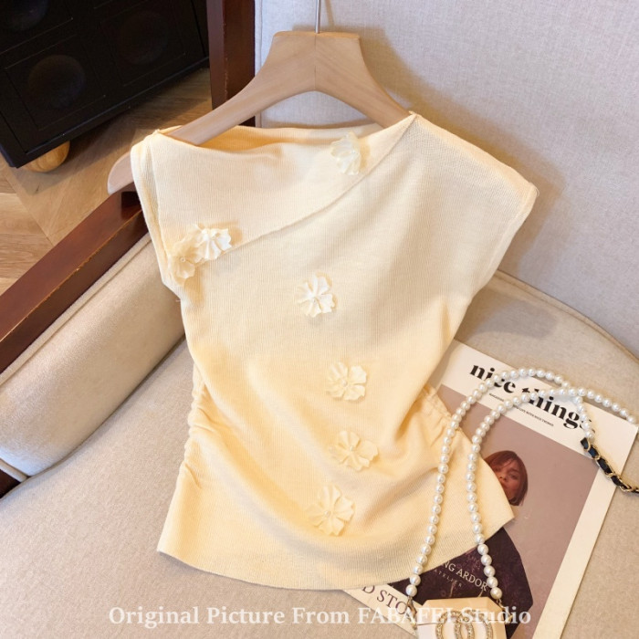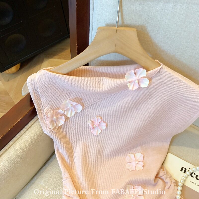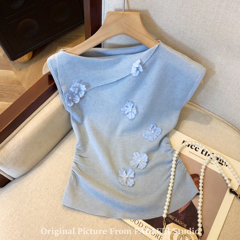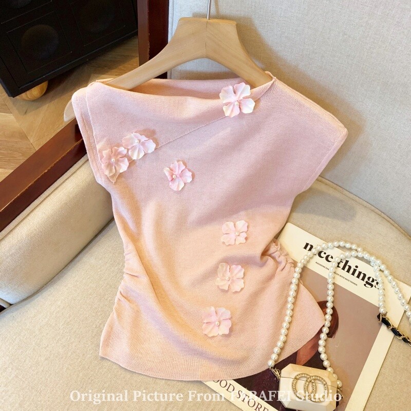 自畱爆款推薦~一字肩立體花朵針織衫t恤女夏季2026辣妹掐腰小上衣