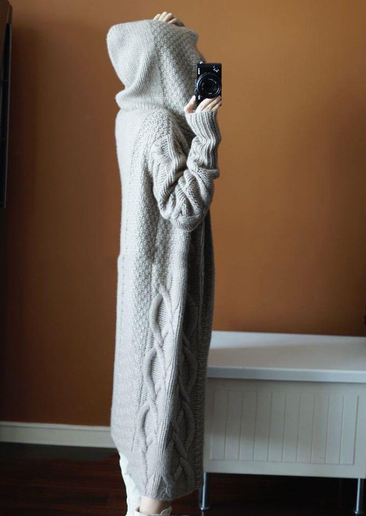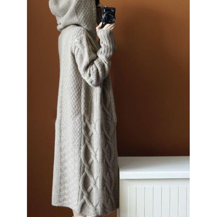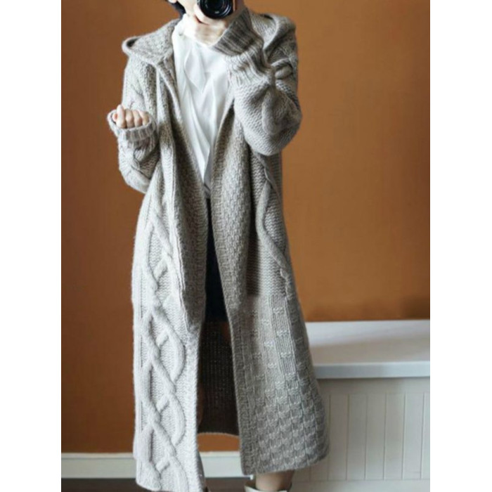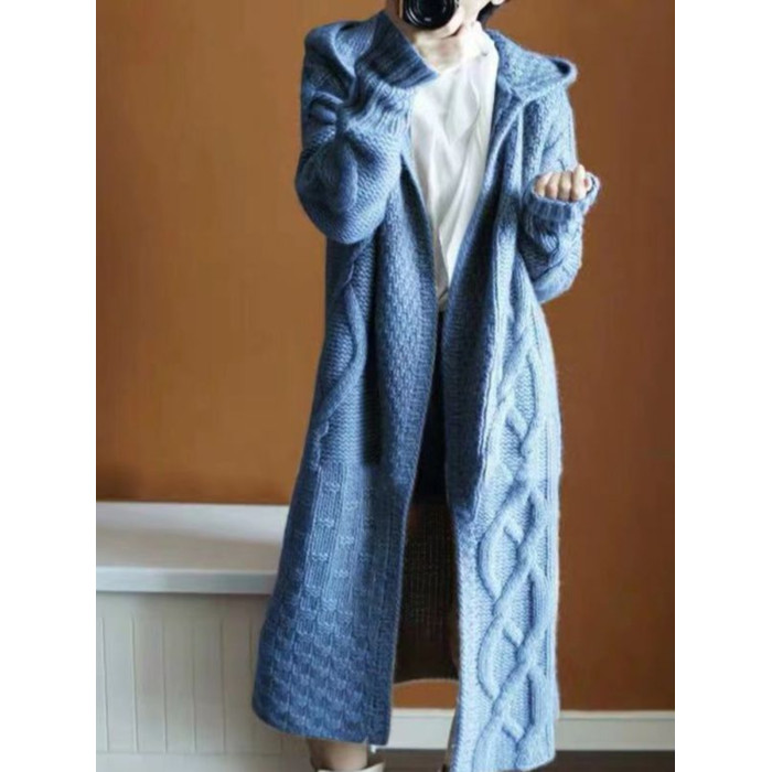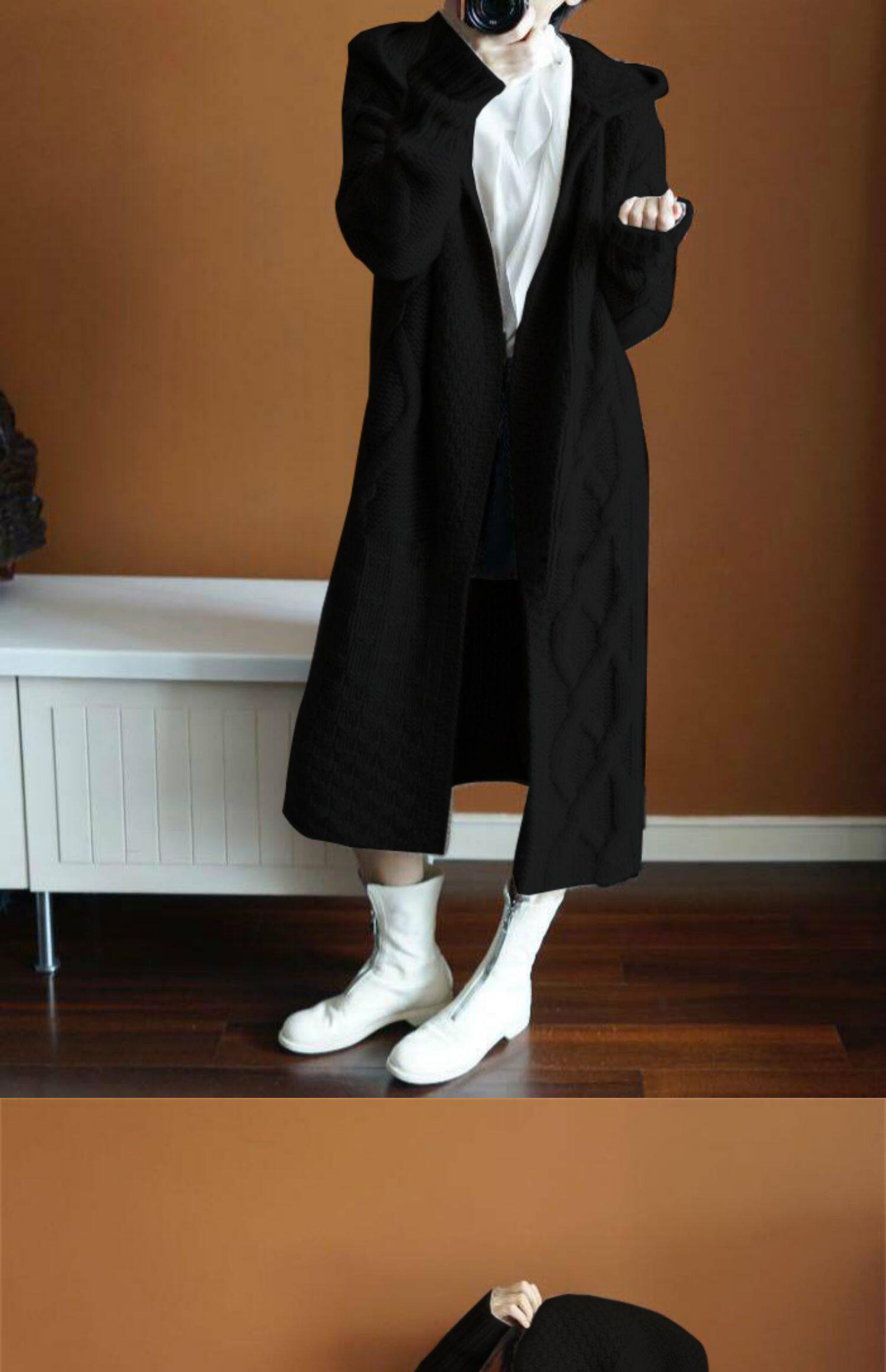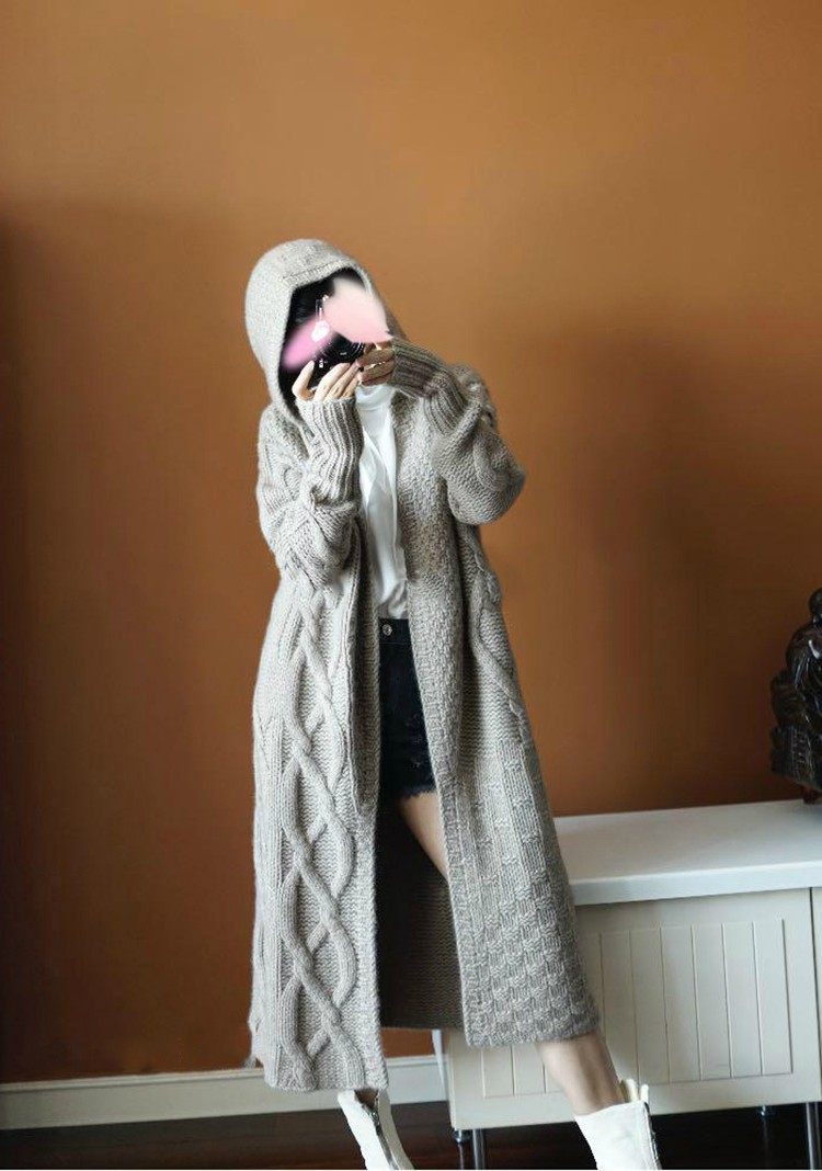 25歐洲站麻花長款連帽大衣女秋冬時尚加厚帶帽針織開衫慵懶風