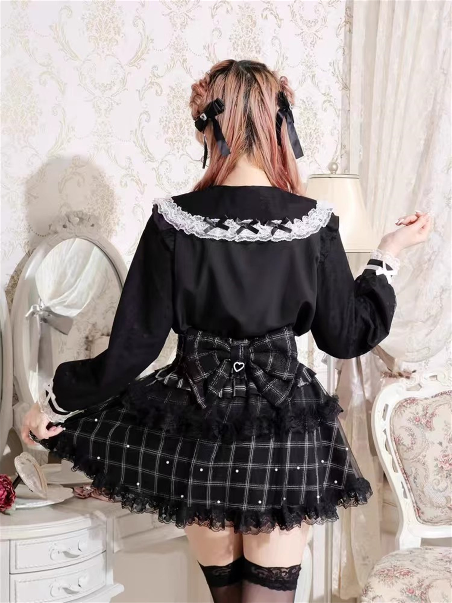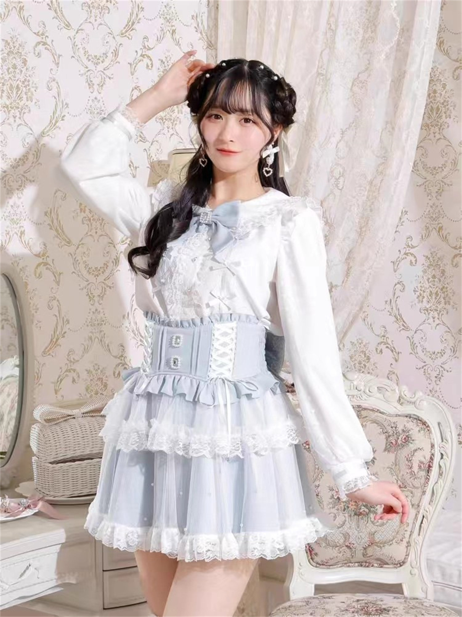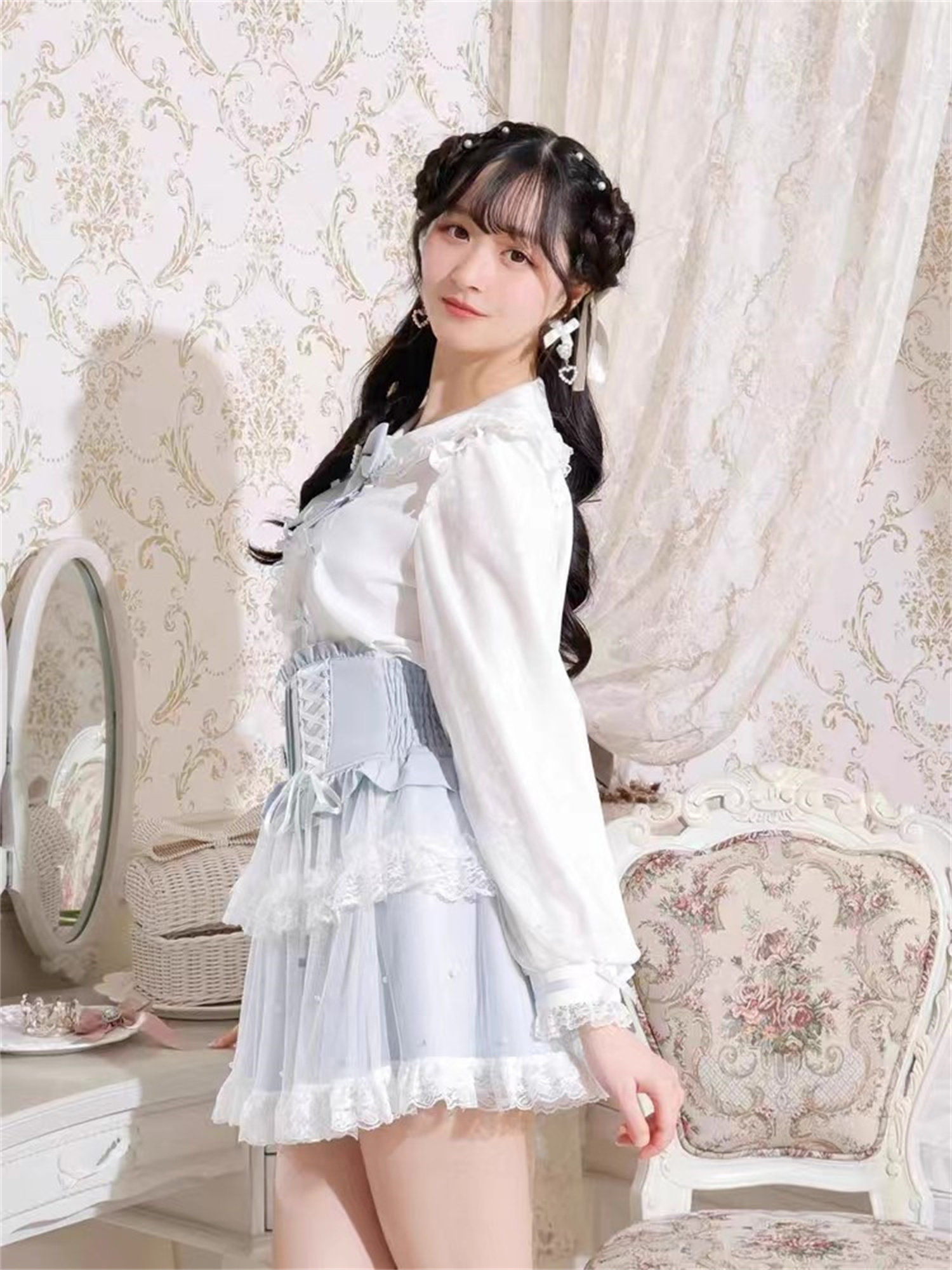 J6-2日本原單新品蕾服甜美女士可愛蕾絲蝴蝶結量産蘿莉長袖襯衫
