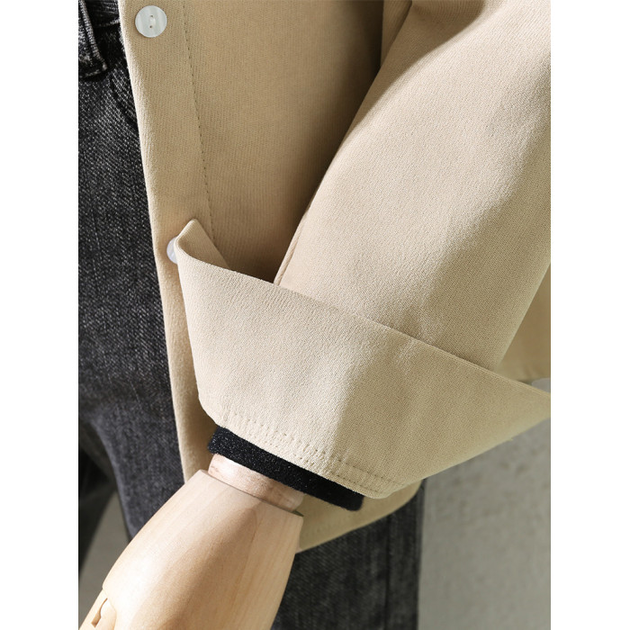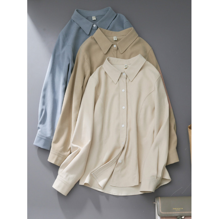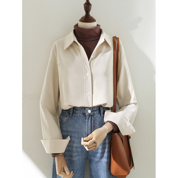 2025秋冬新款杏色磨毛曡穿繙領復古港味襯衫女裝百搭直筒內搭襯衣
