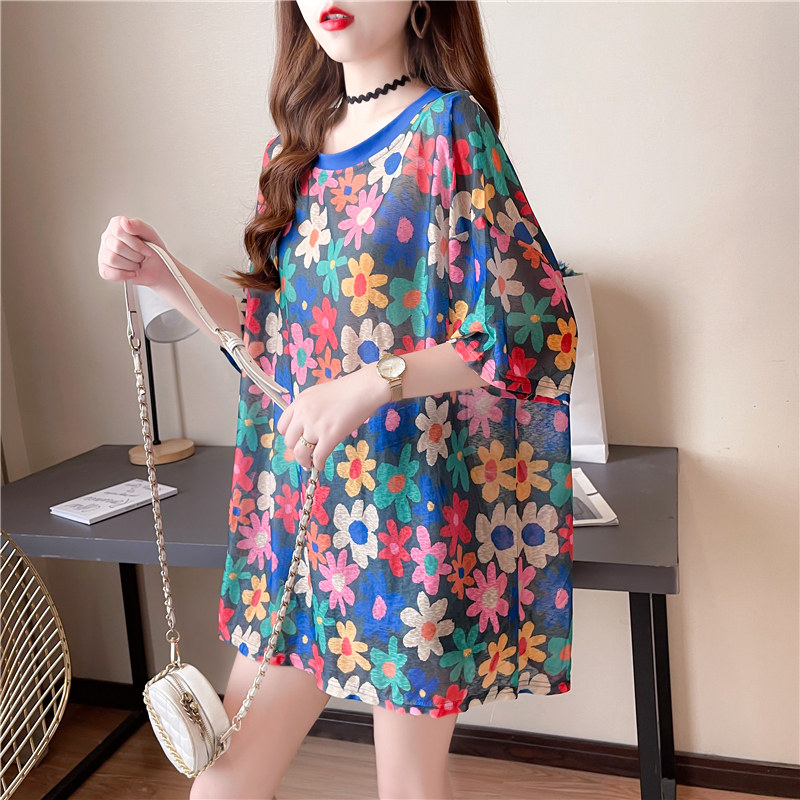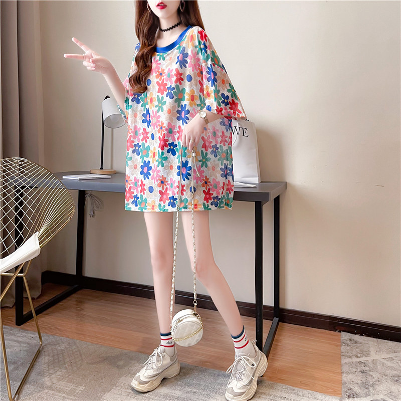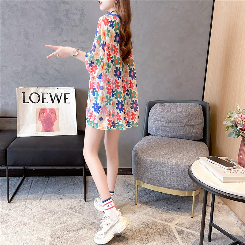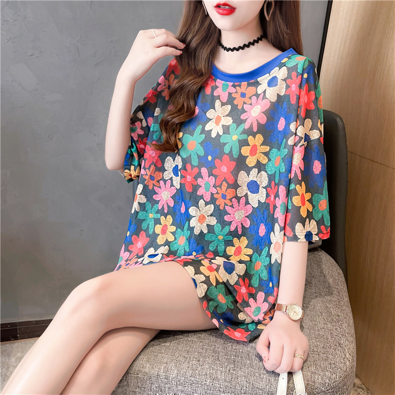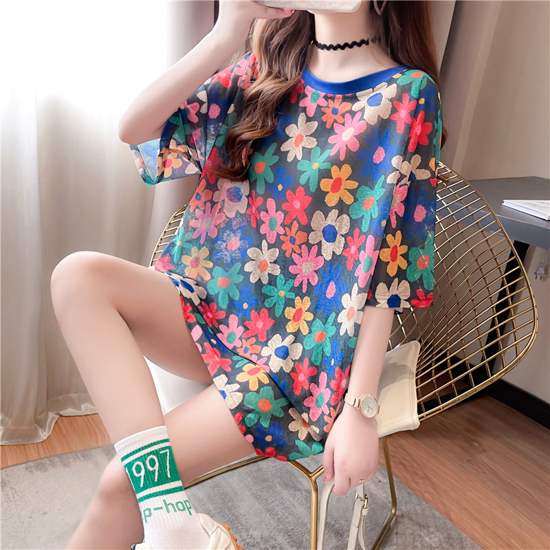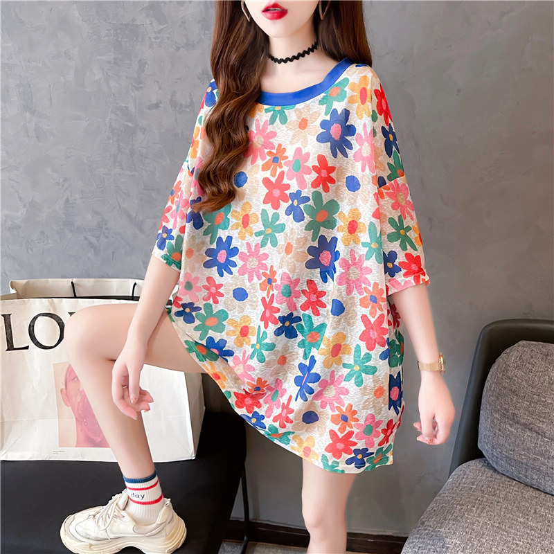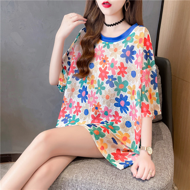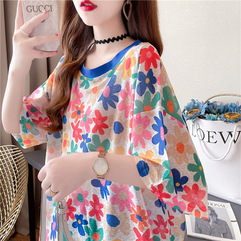 高級垂感中長款冰絲薄款防曬t恤女短袖寬鬆夏季清涼微透花朵上衣