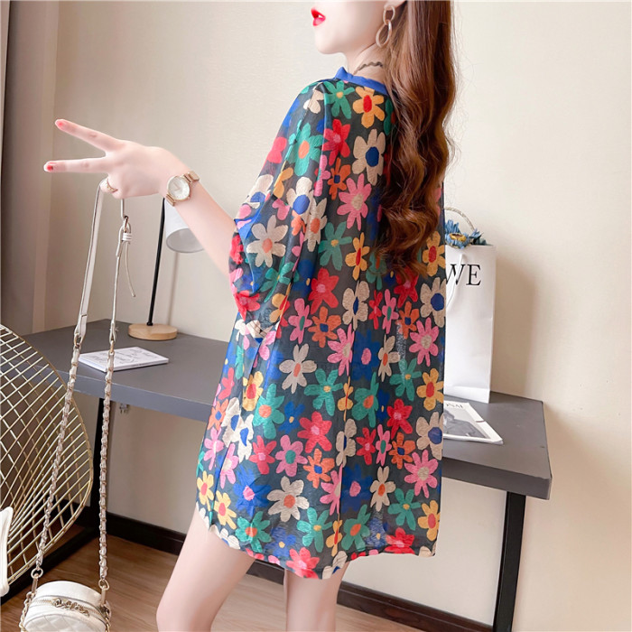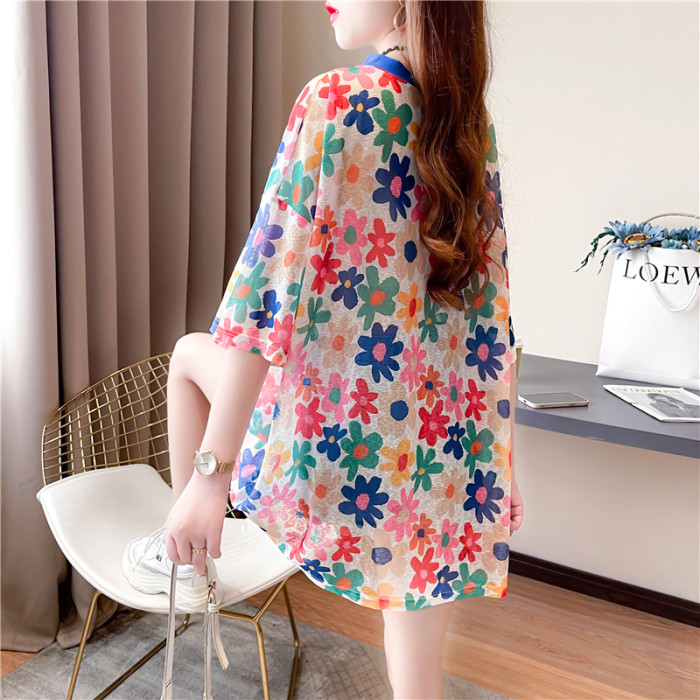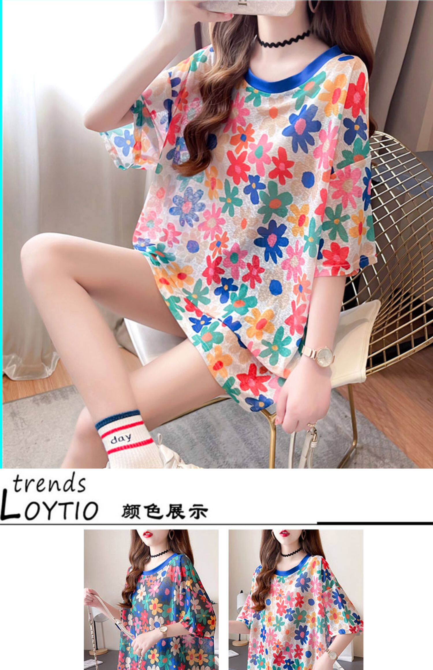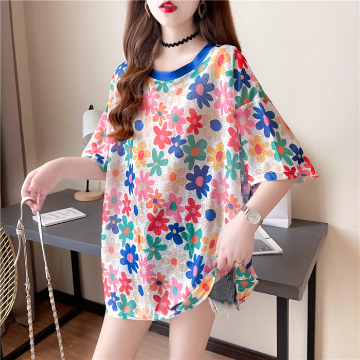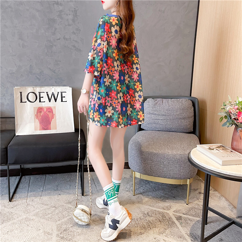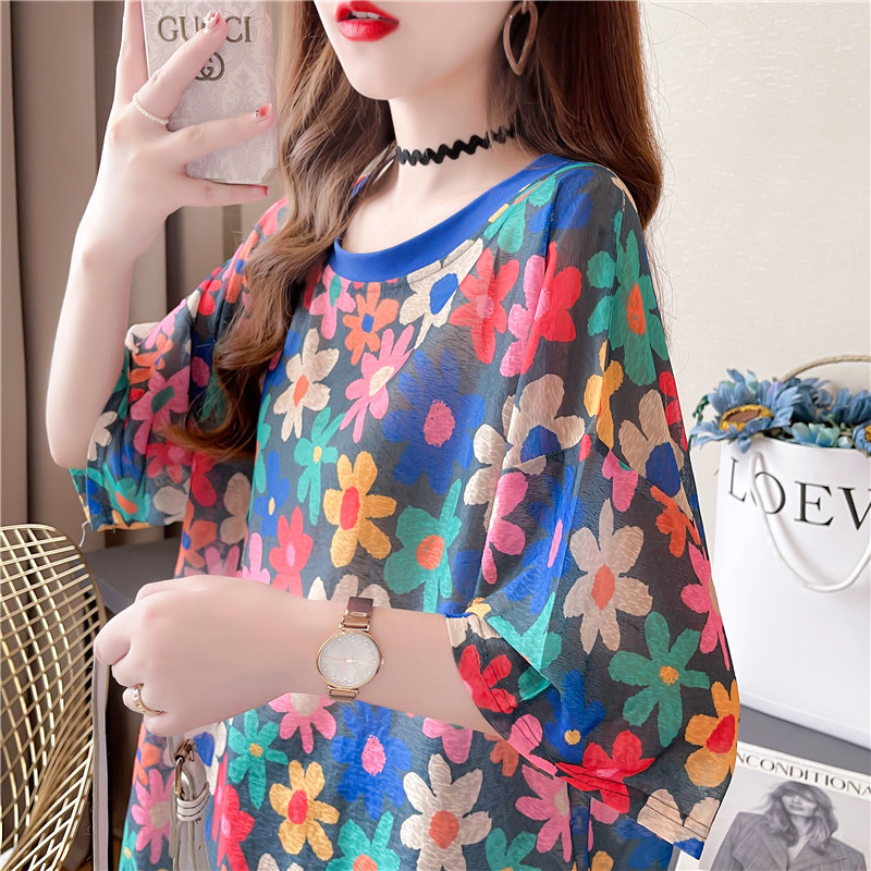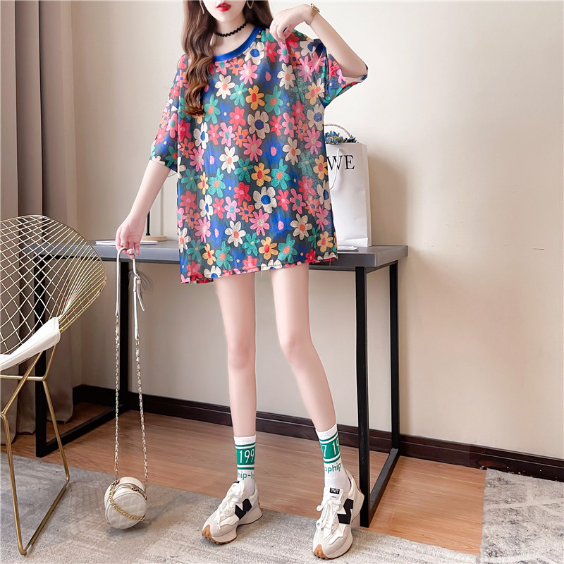 高級垂感中長款冰絲薄款防曬t恤女短袖寬鬆夏季清涼微透花朵上衣