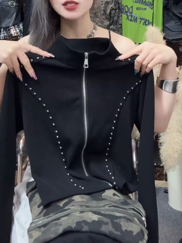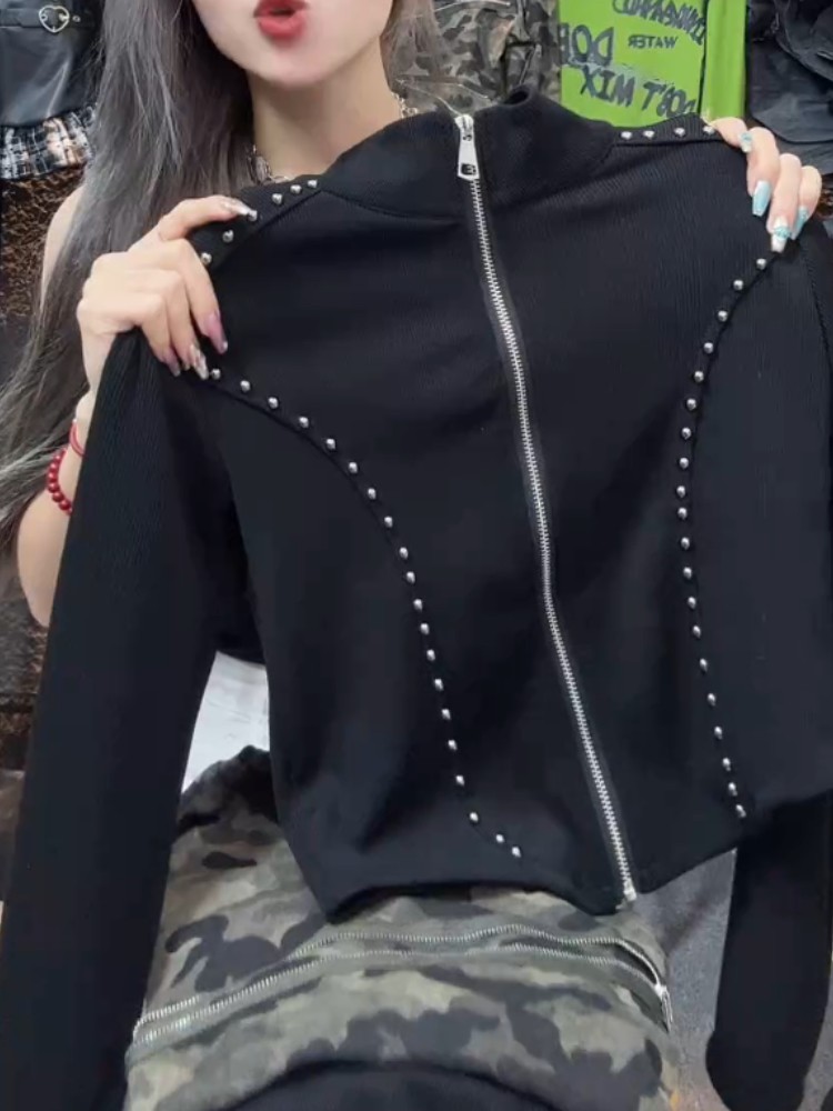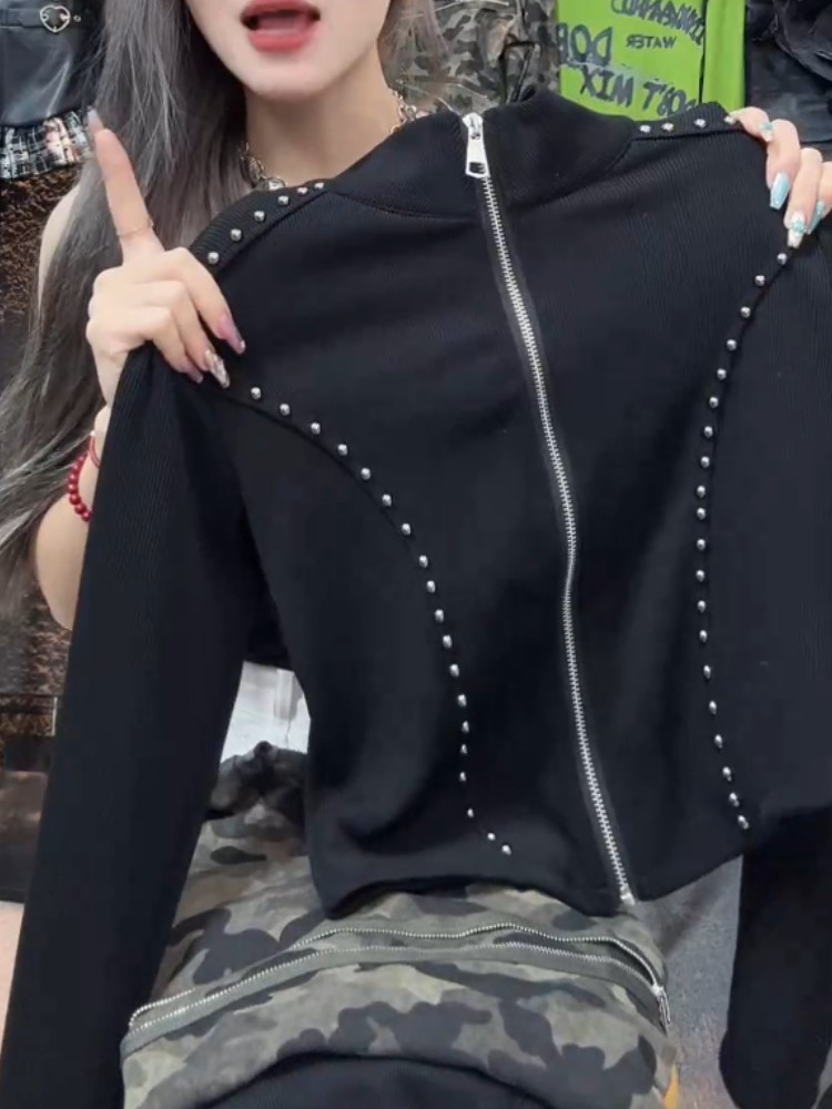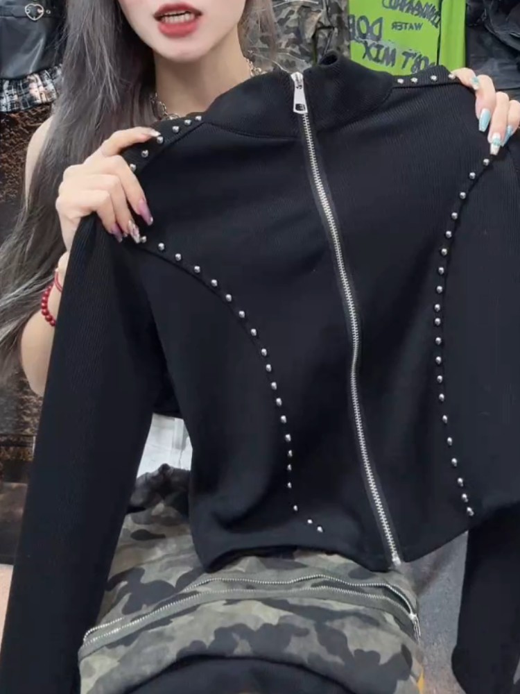 今年新款2026秋季美式高級感韓版小個子拉鍊立領短款黑色時尚上衣