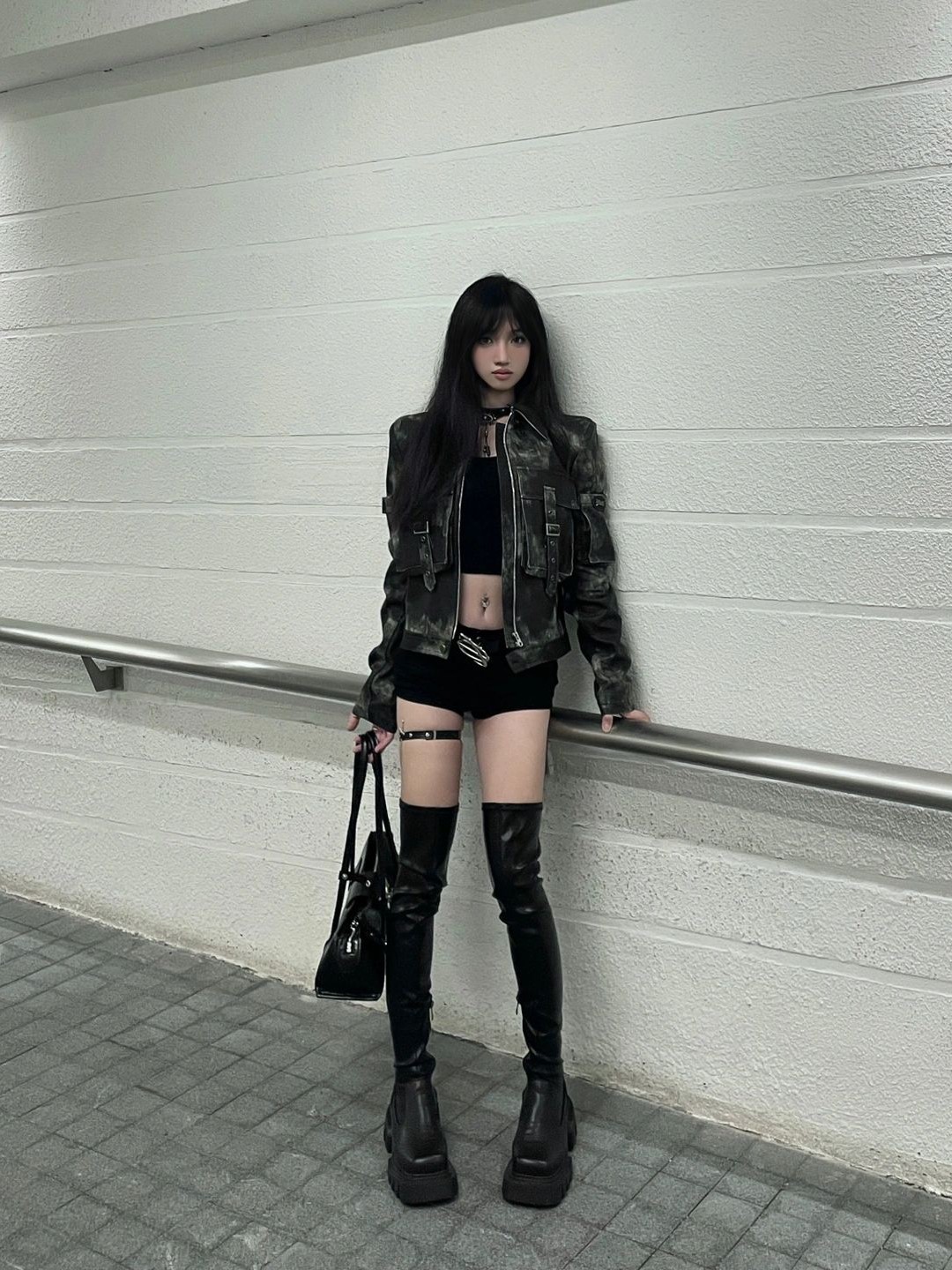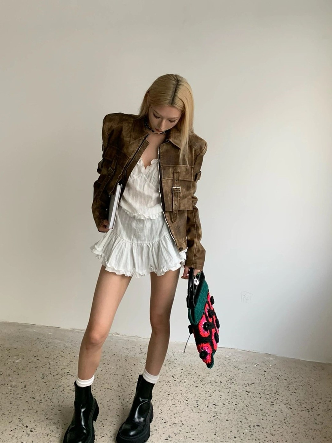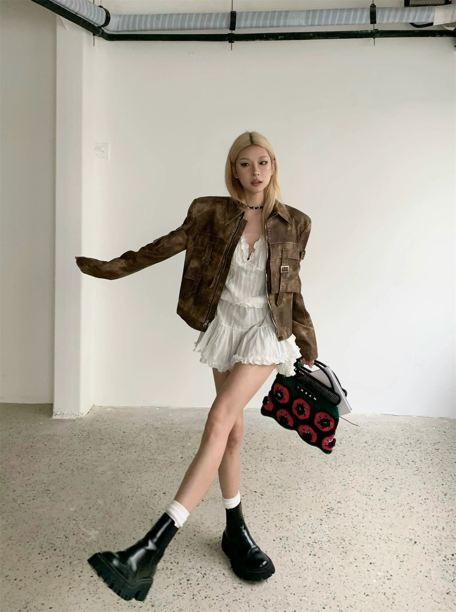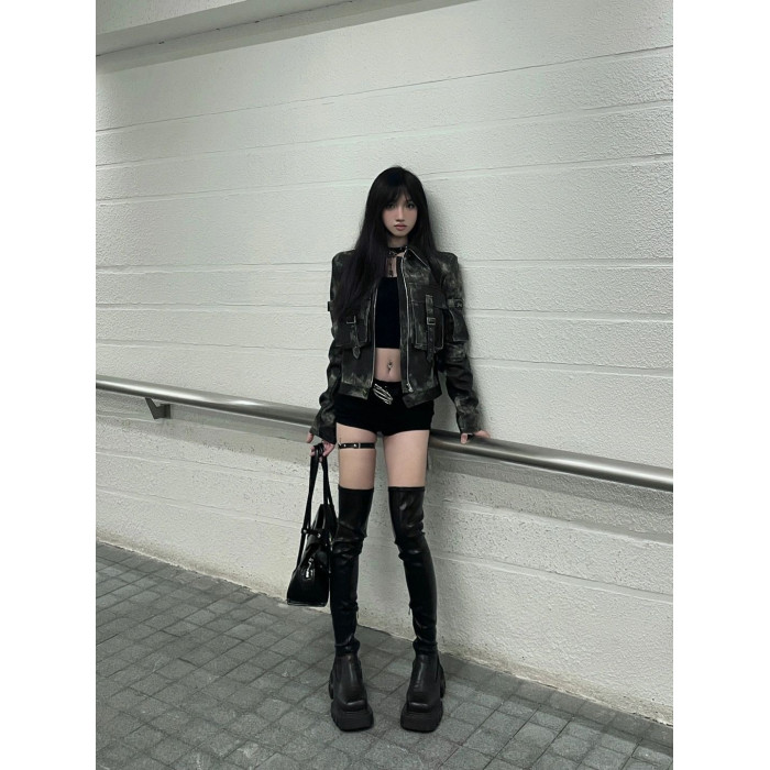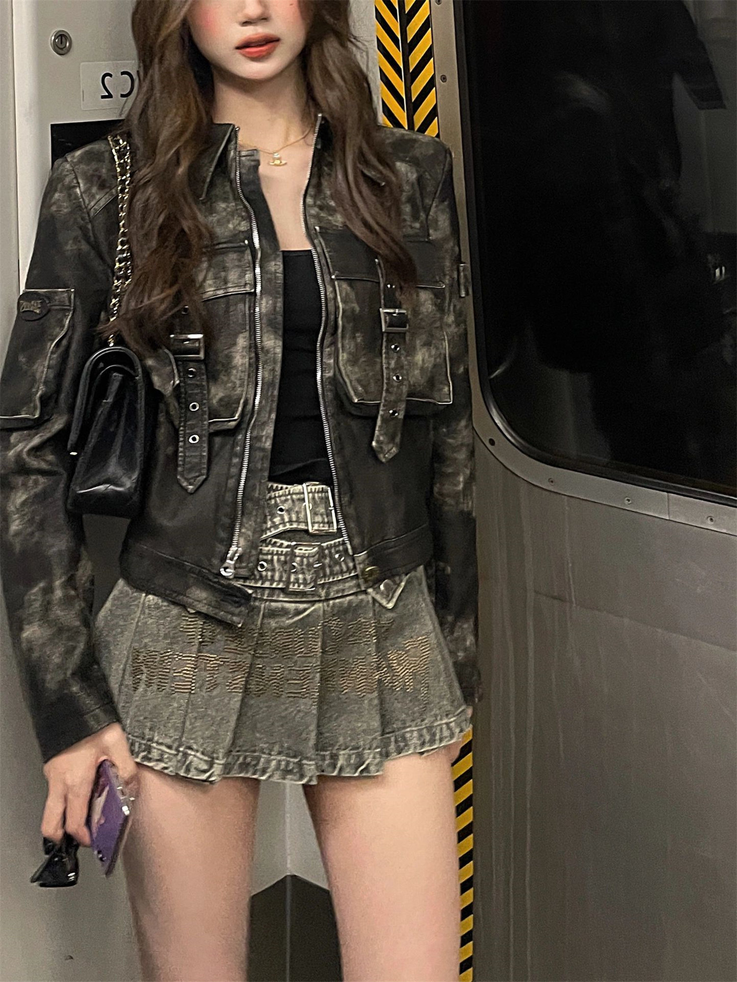 7iAe 輕punk皮衣美式街頭復古做舊辣妹外套女秋冬季機車夾克上衣