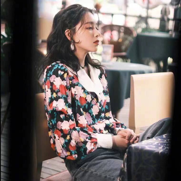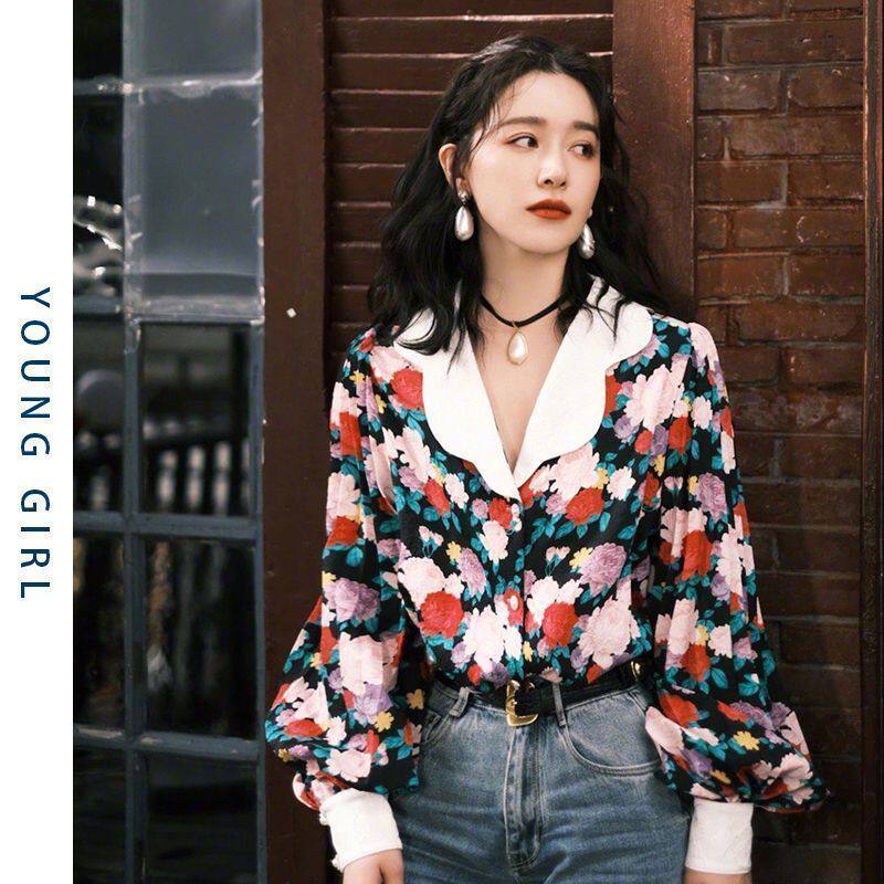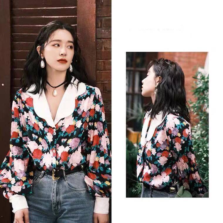 復古港風碎花燈籠袖襯衫女春秋季新款法式港味設計感小衆長袖上衣