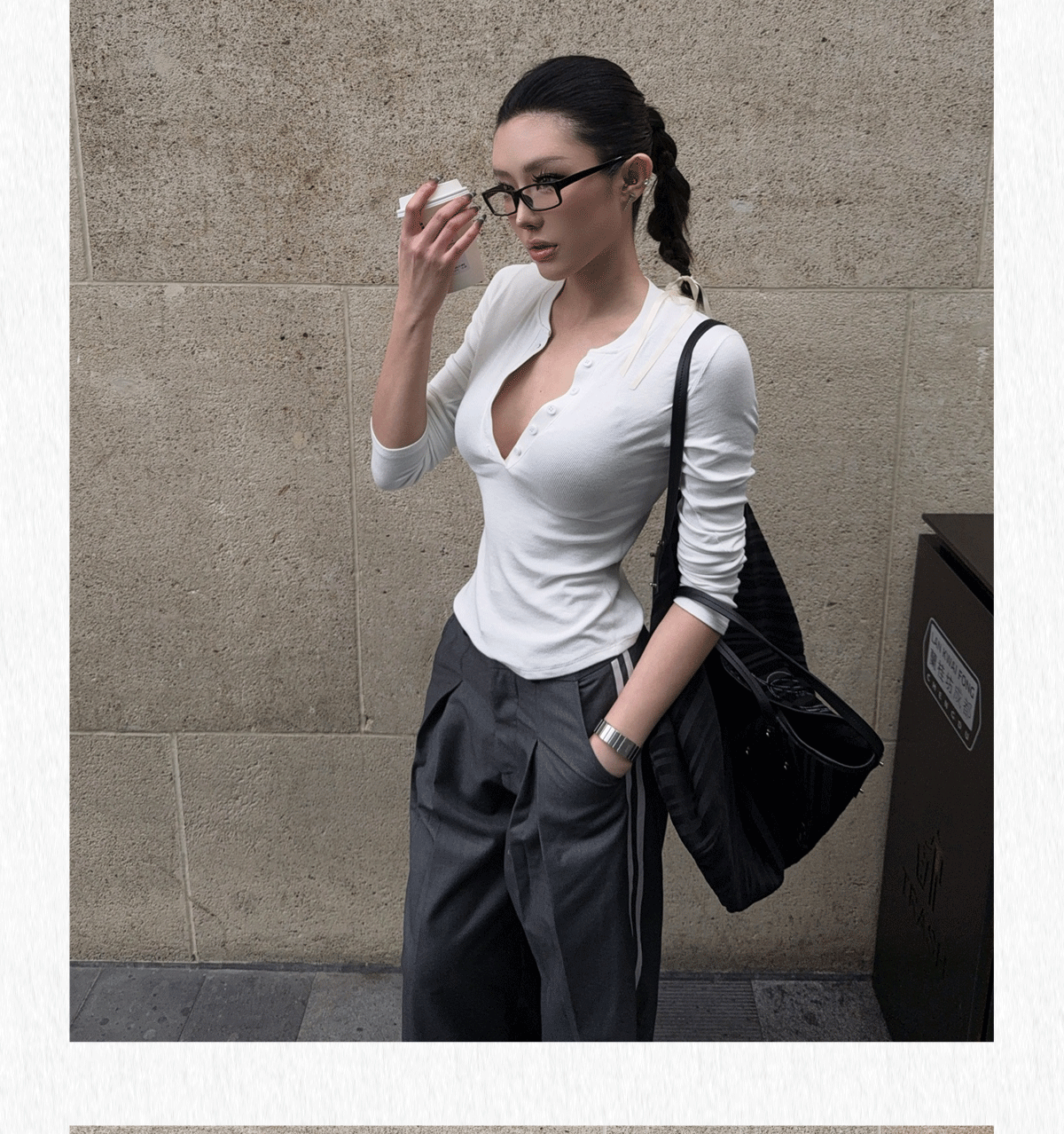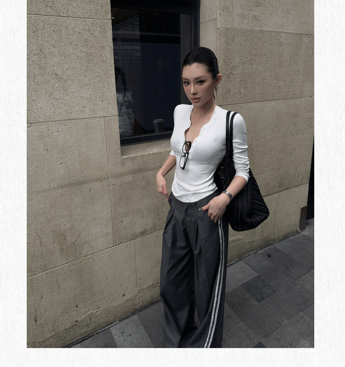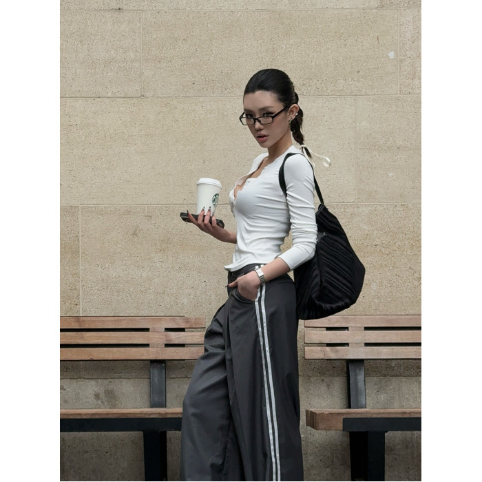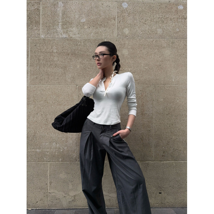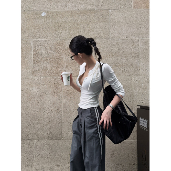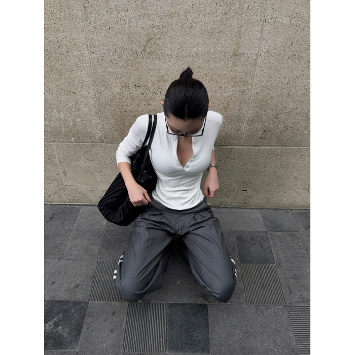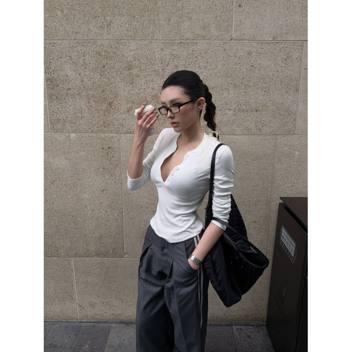 HunterGirl 格雷系排釦亨利衫高級美式簡約顯瘦彈力打底上衣長袖