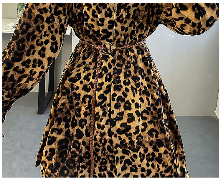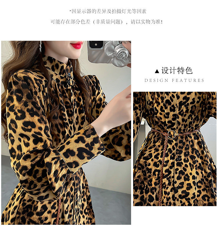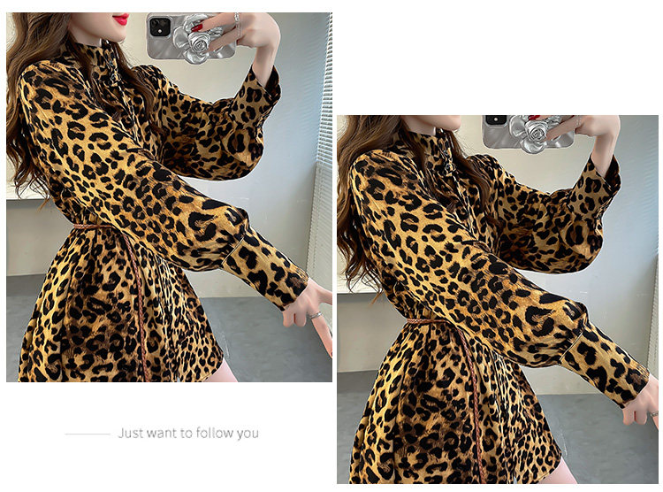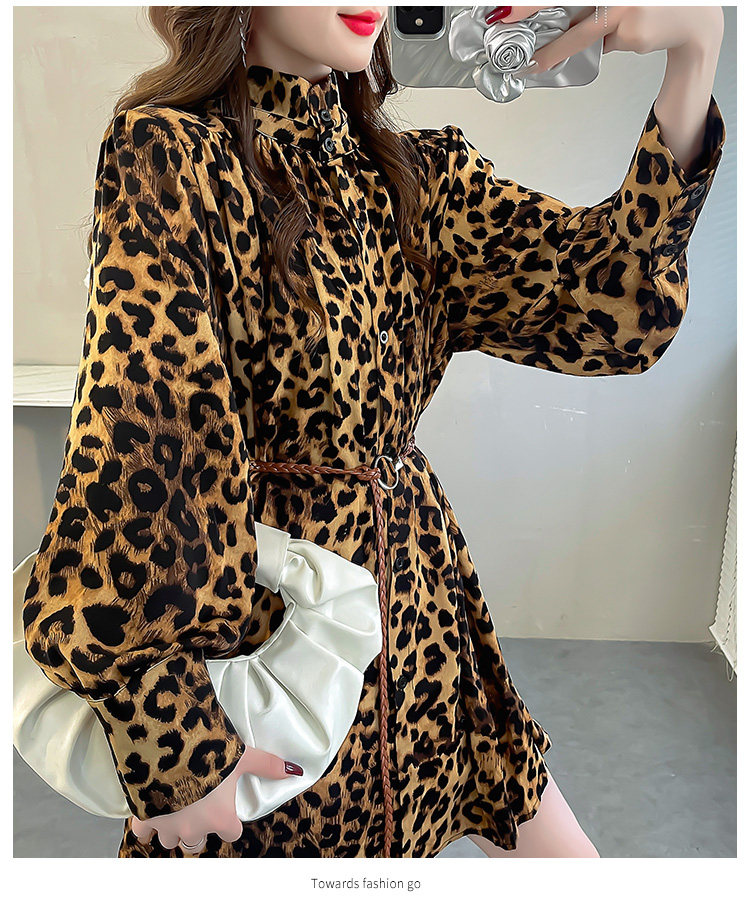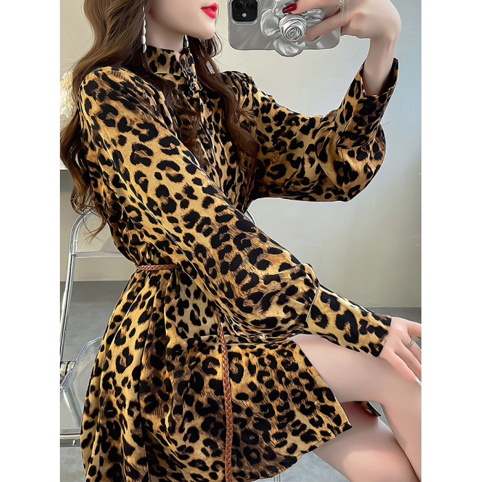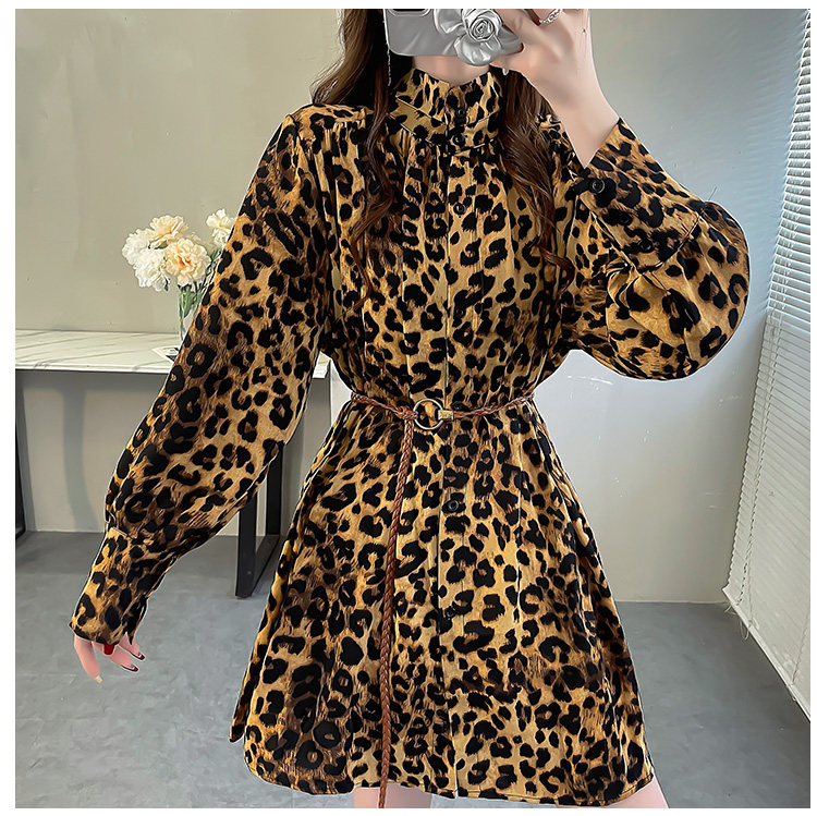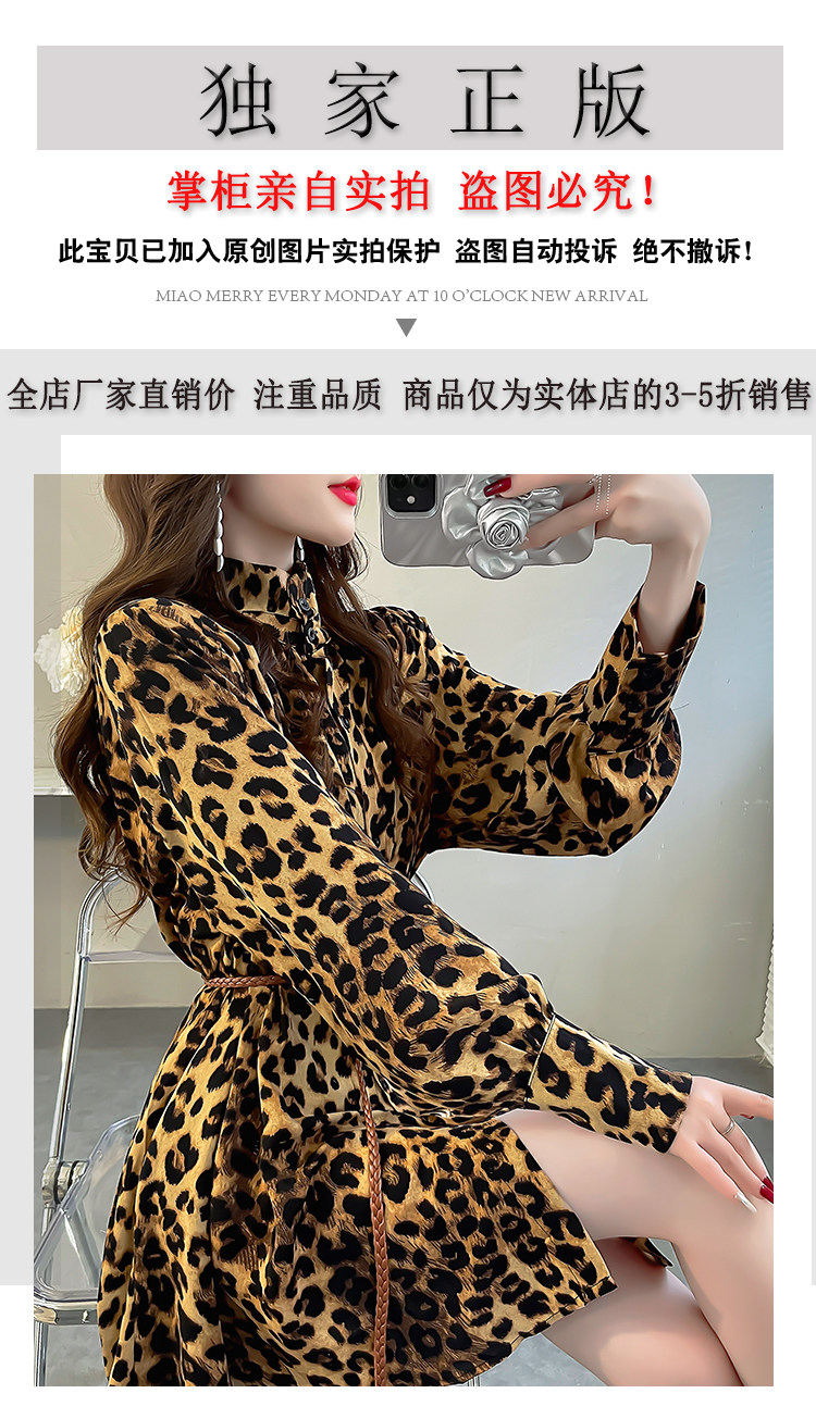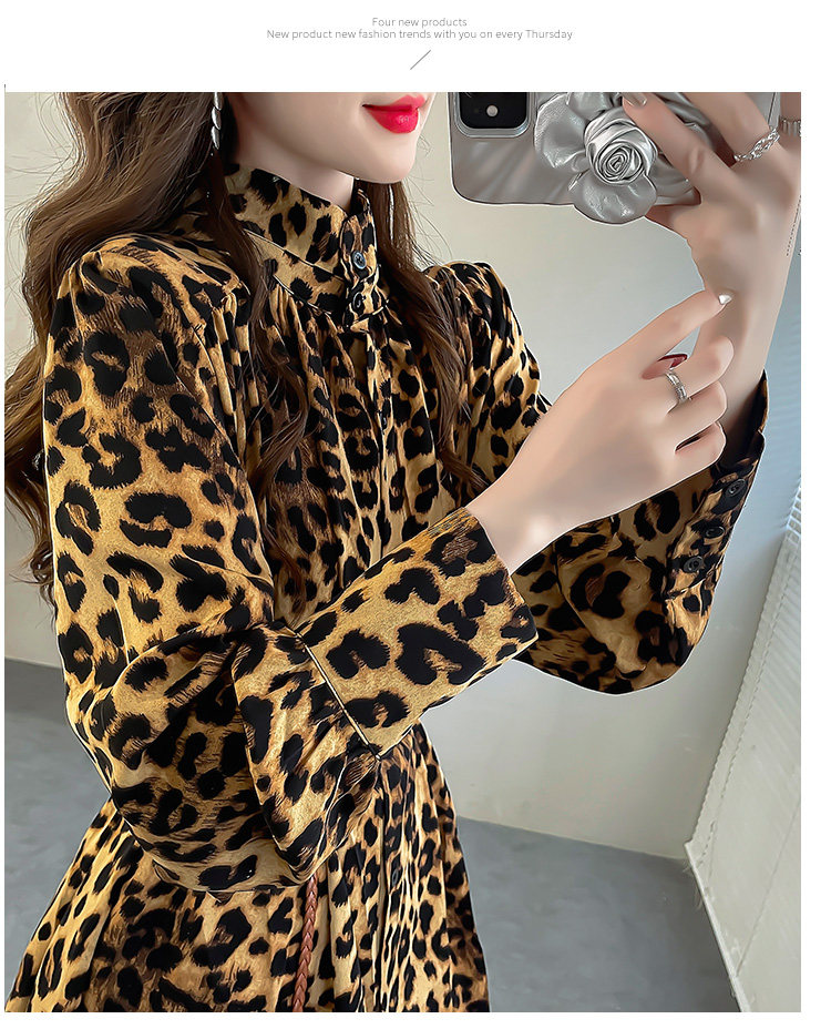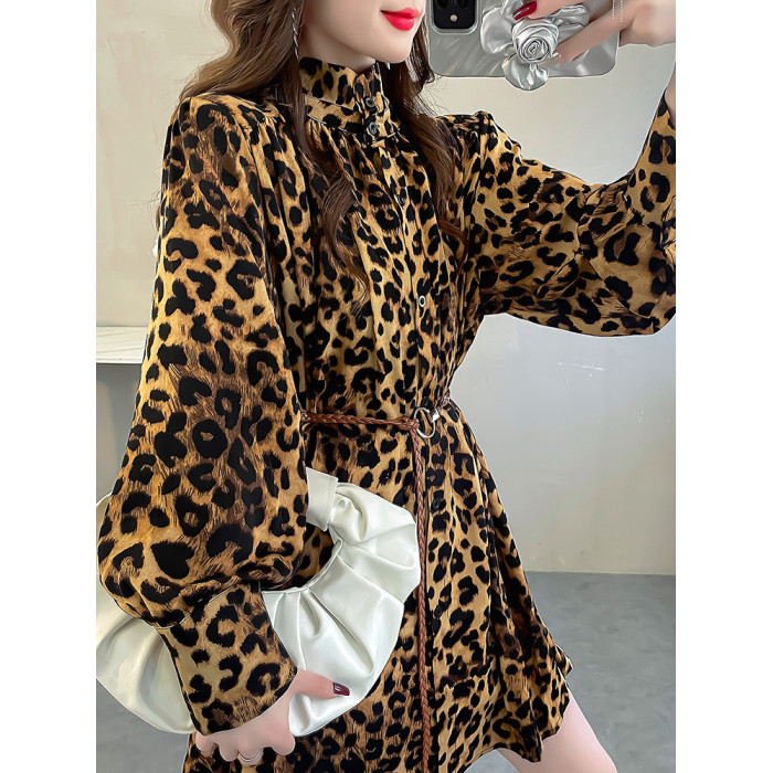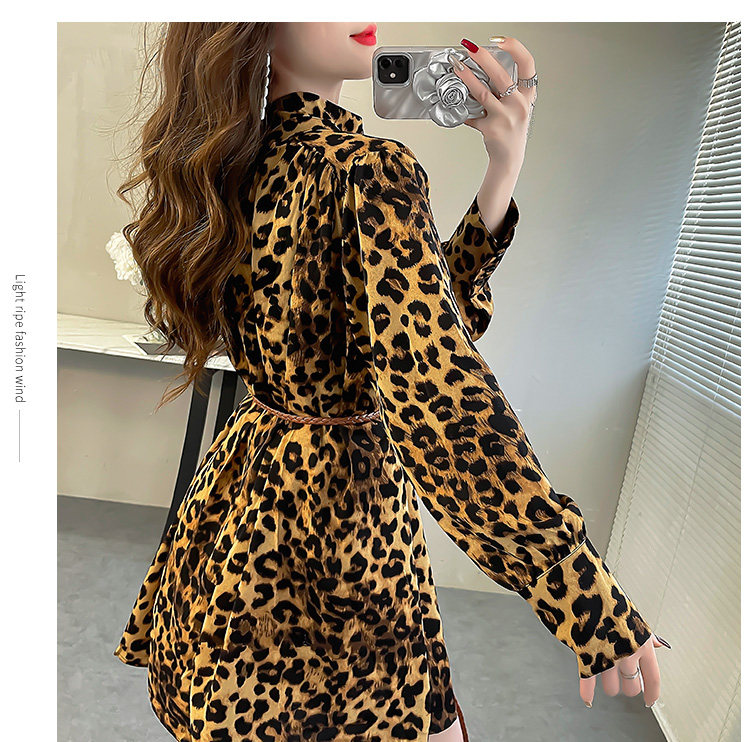 豹紋立領時尚襯衫女2024新款上衣顯瘦編繩系帶收腰長袖洋氣小衫秋