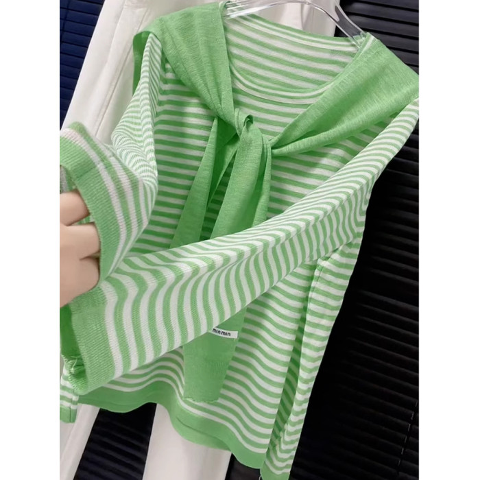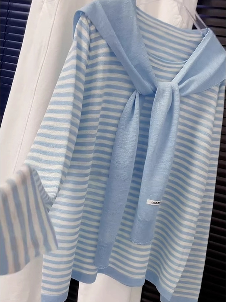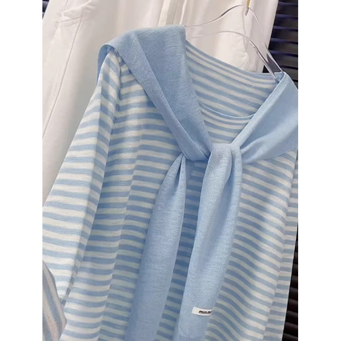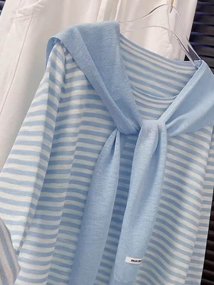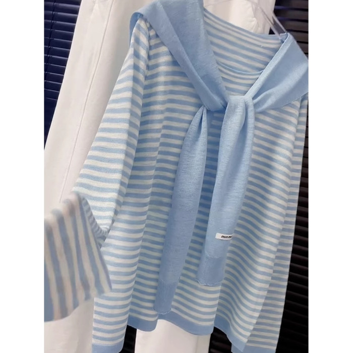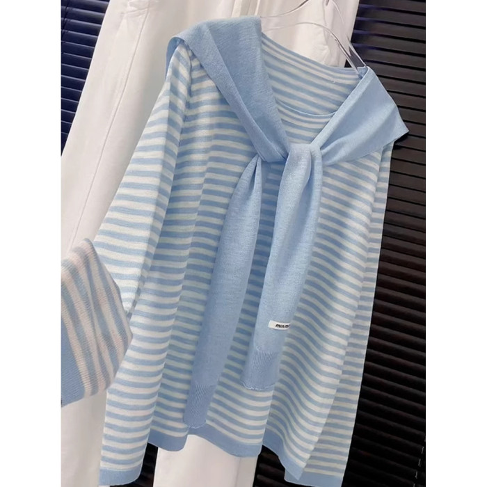 多巴胺藍色條紋披肩長袖罩衫女2025早秋新款韓系穿搭薄款防曬上衣