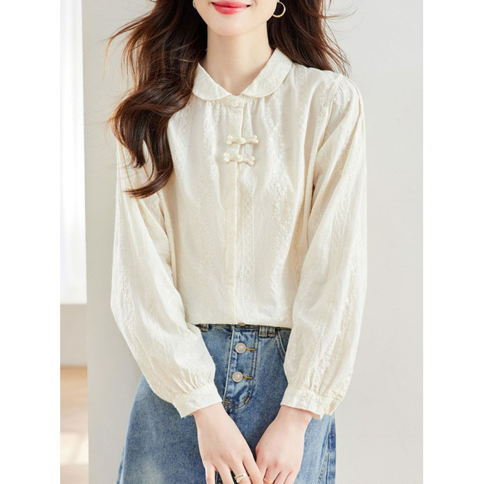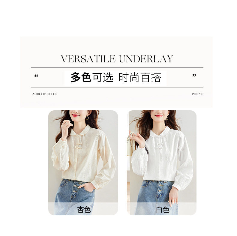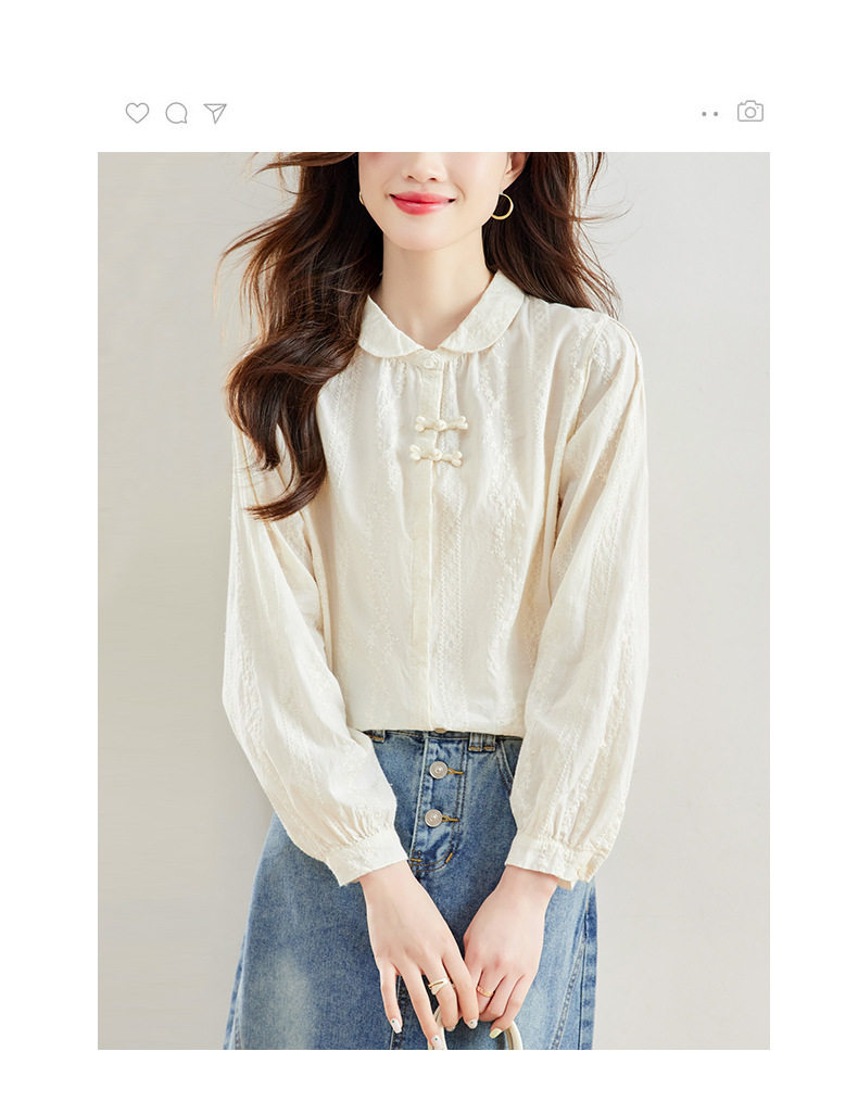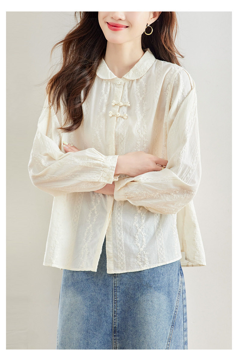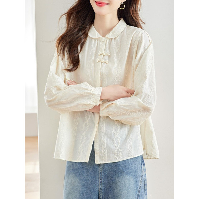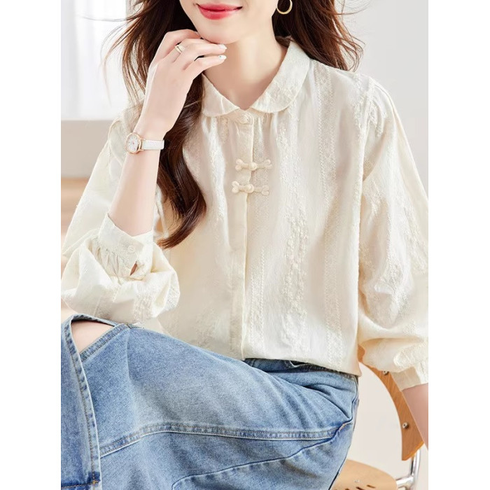 寬鬆國風新中式綉花杏色襯衫遮肉顯瘦盤釦漂亮小衫2025年秋季新款