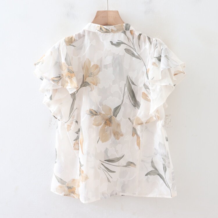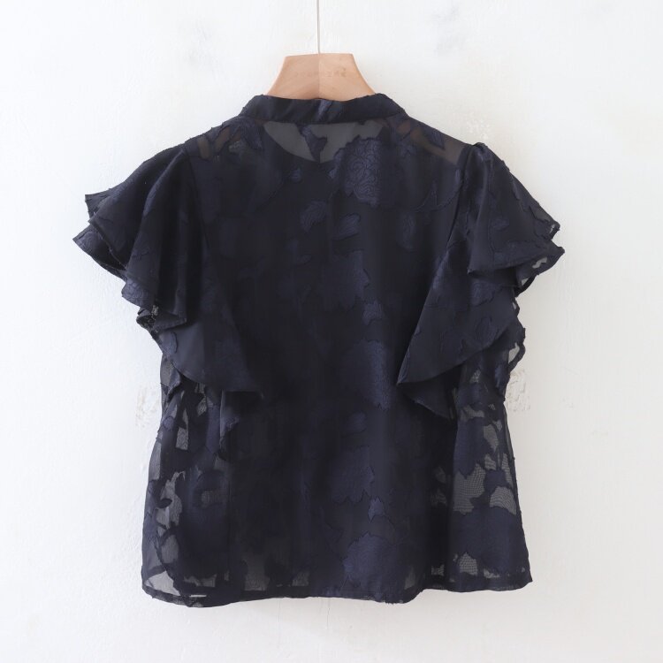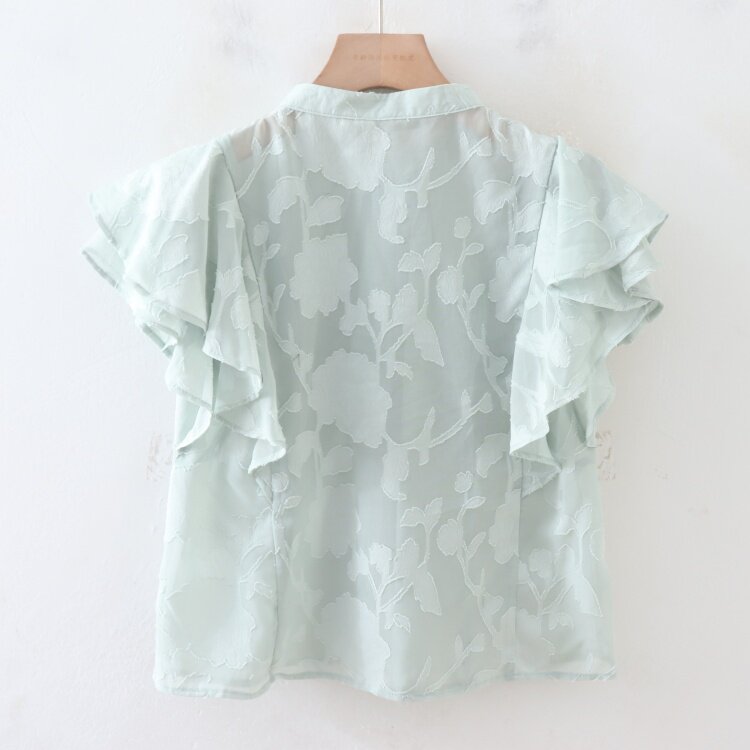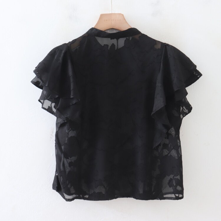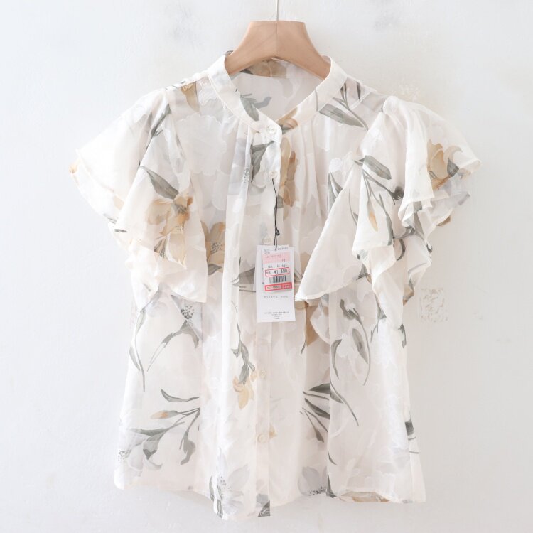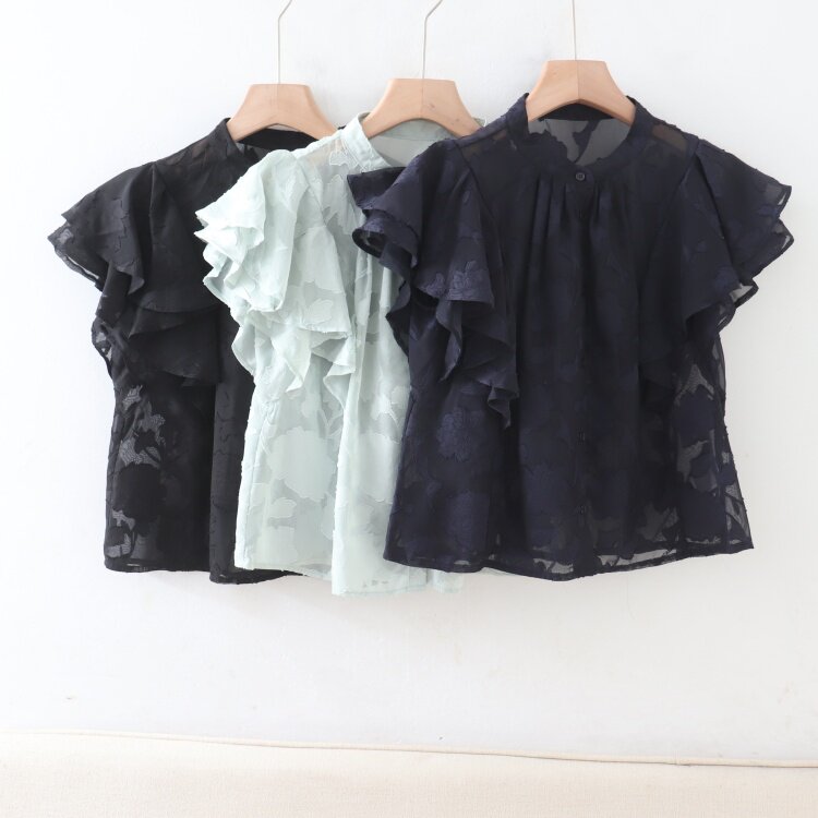 C08083日單夏新款單排釦圓領顯瘦女睫毛花甜美氣質荷葉短袖襯衫