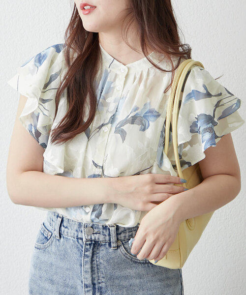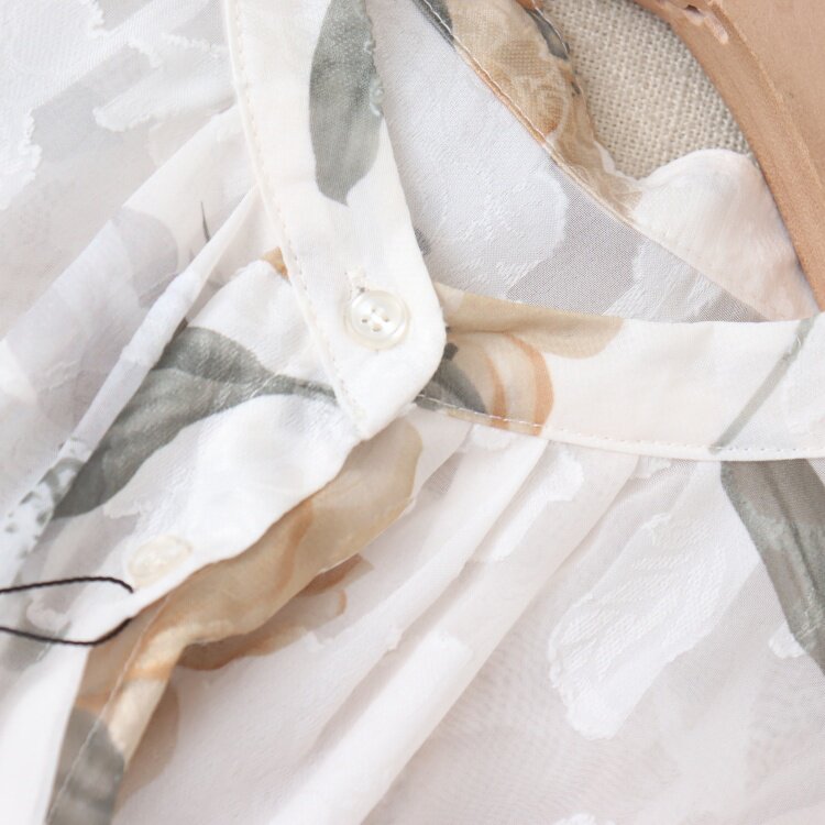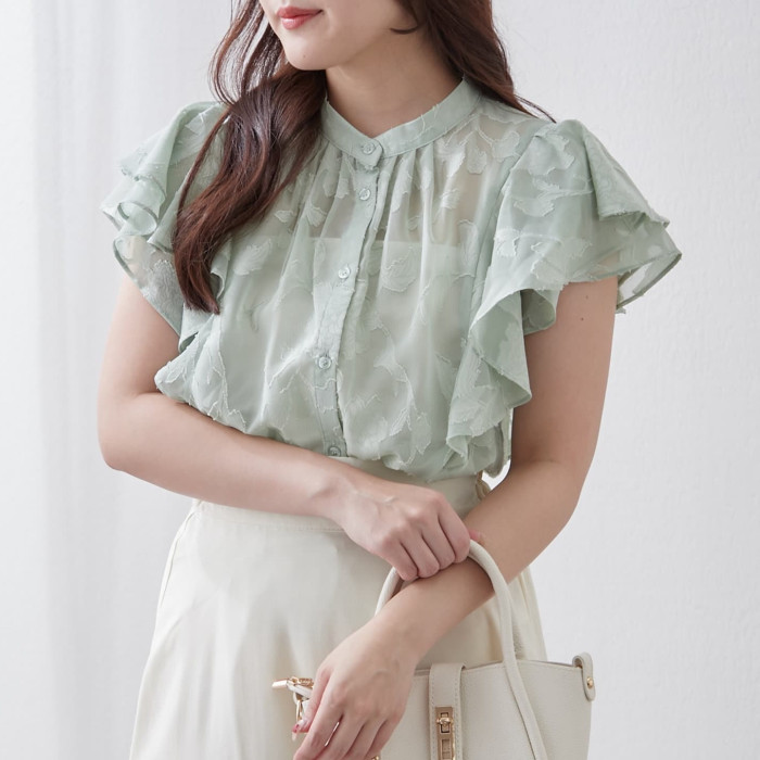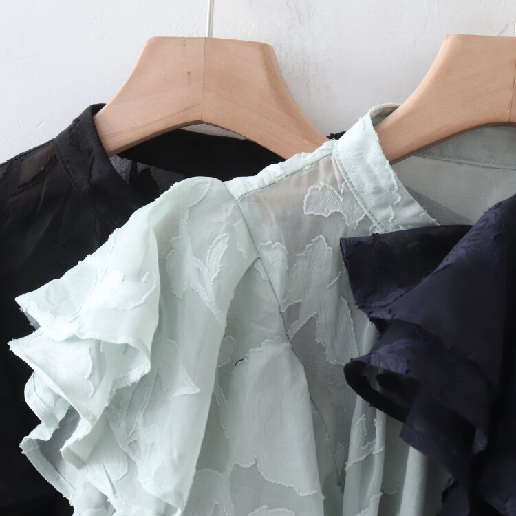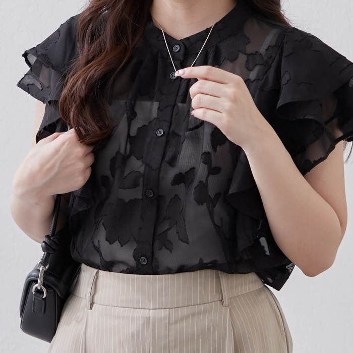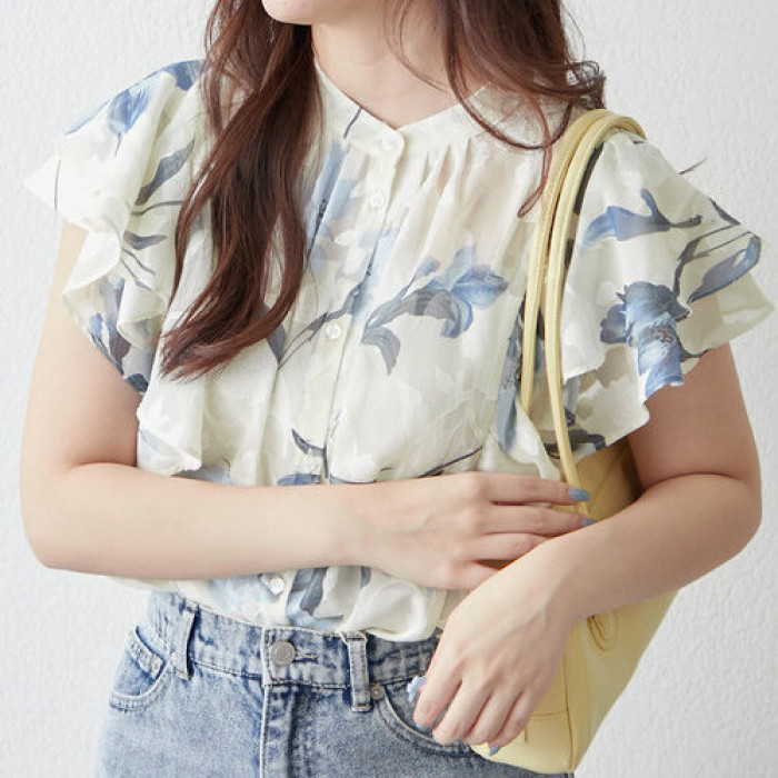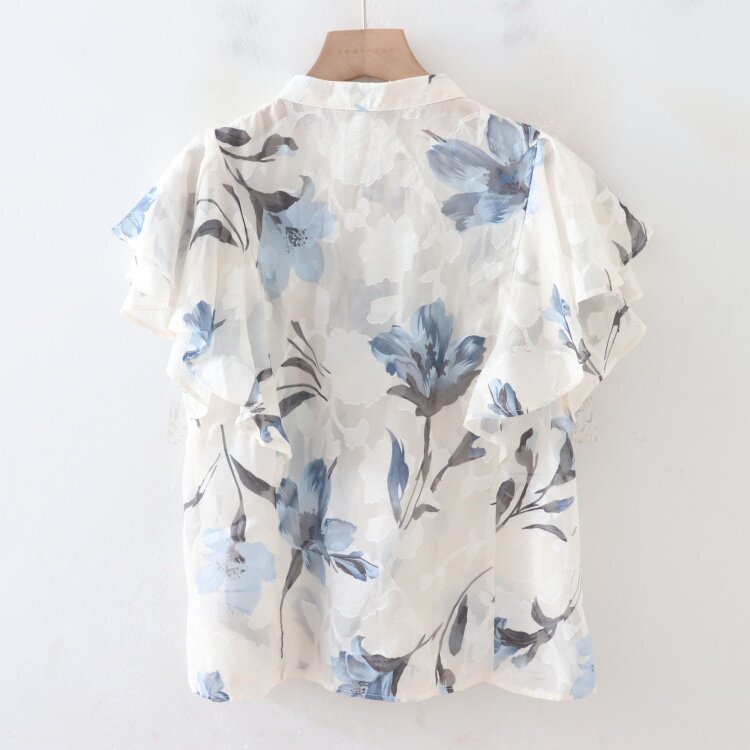 C08083日單夏新款單排釦圓領顯瘦女睫毛花甜美氣質荷葉短袖襯衫
