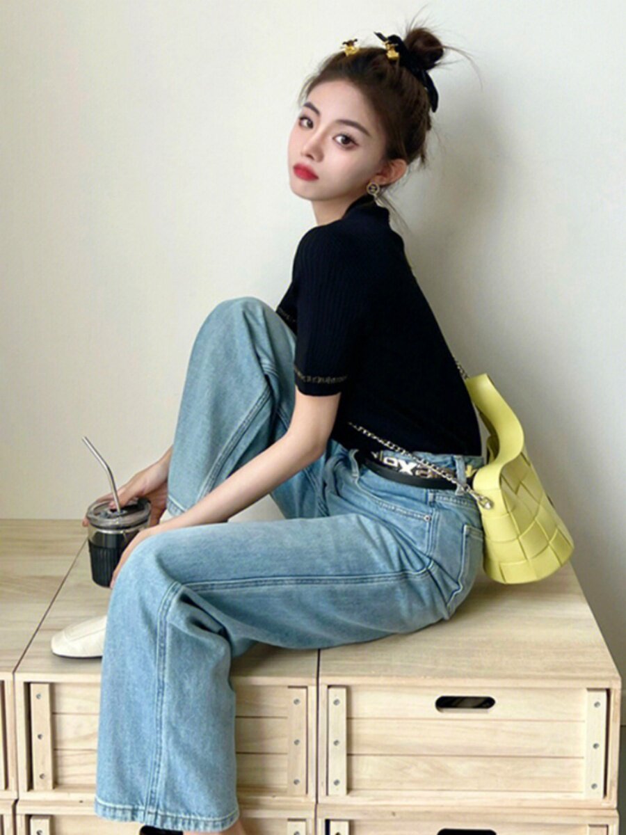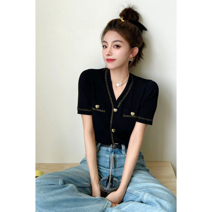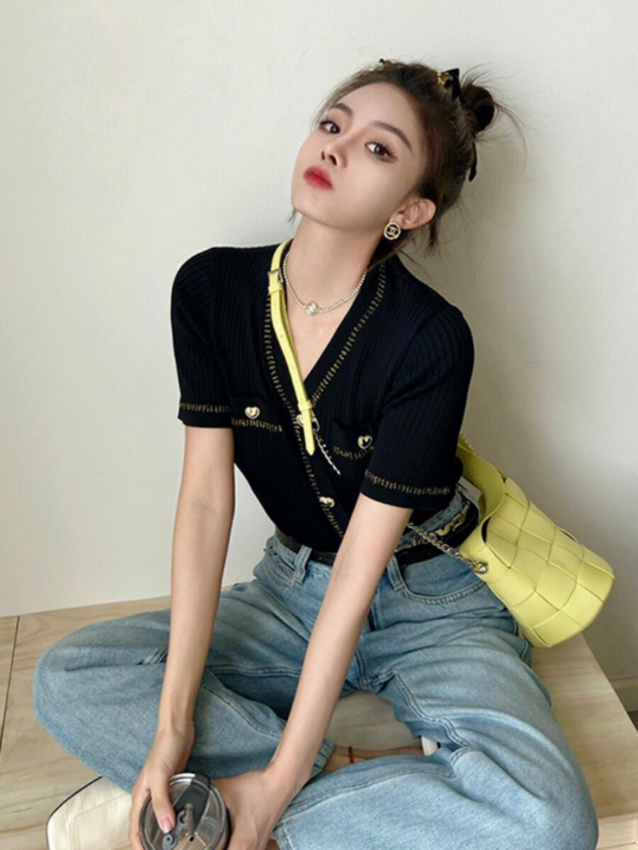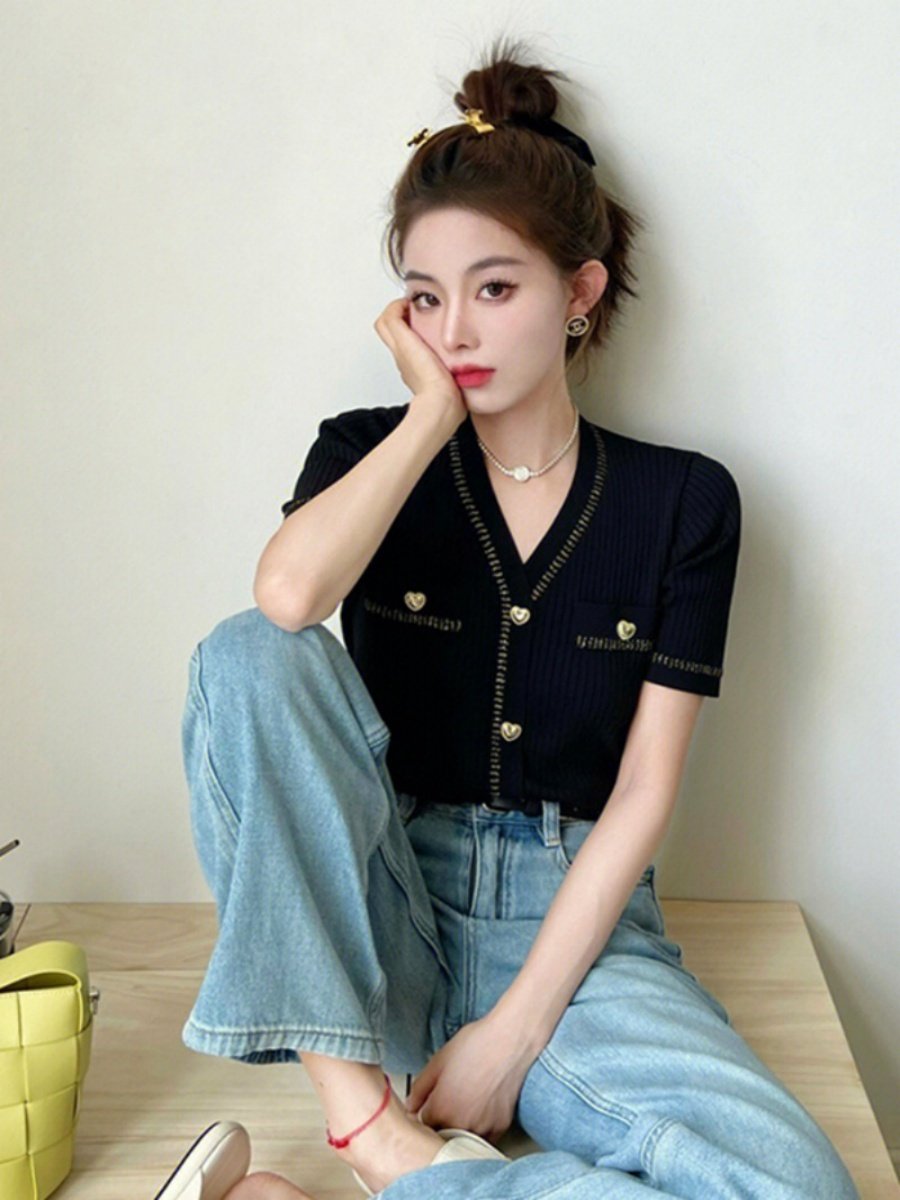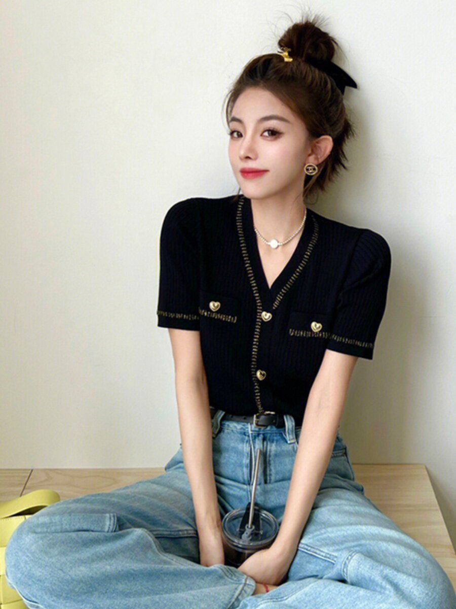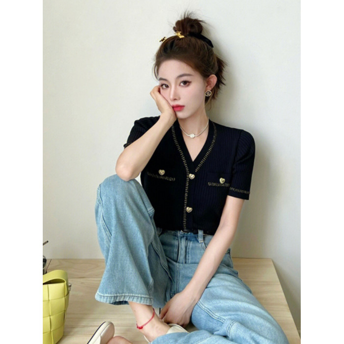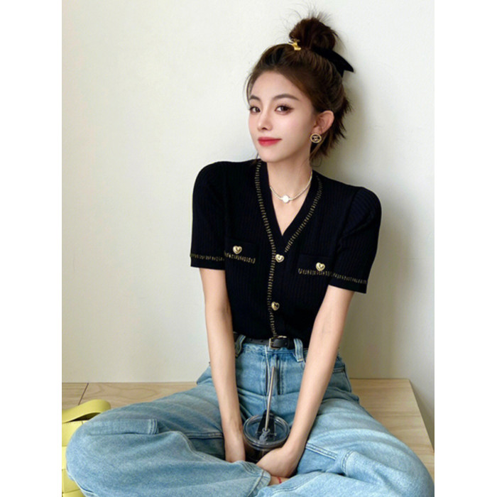 小香風v領正肩短袖t恤針織開衫女夏季2024年新款愛心鈕釦顯瘦上衣