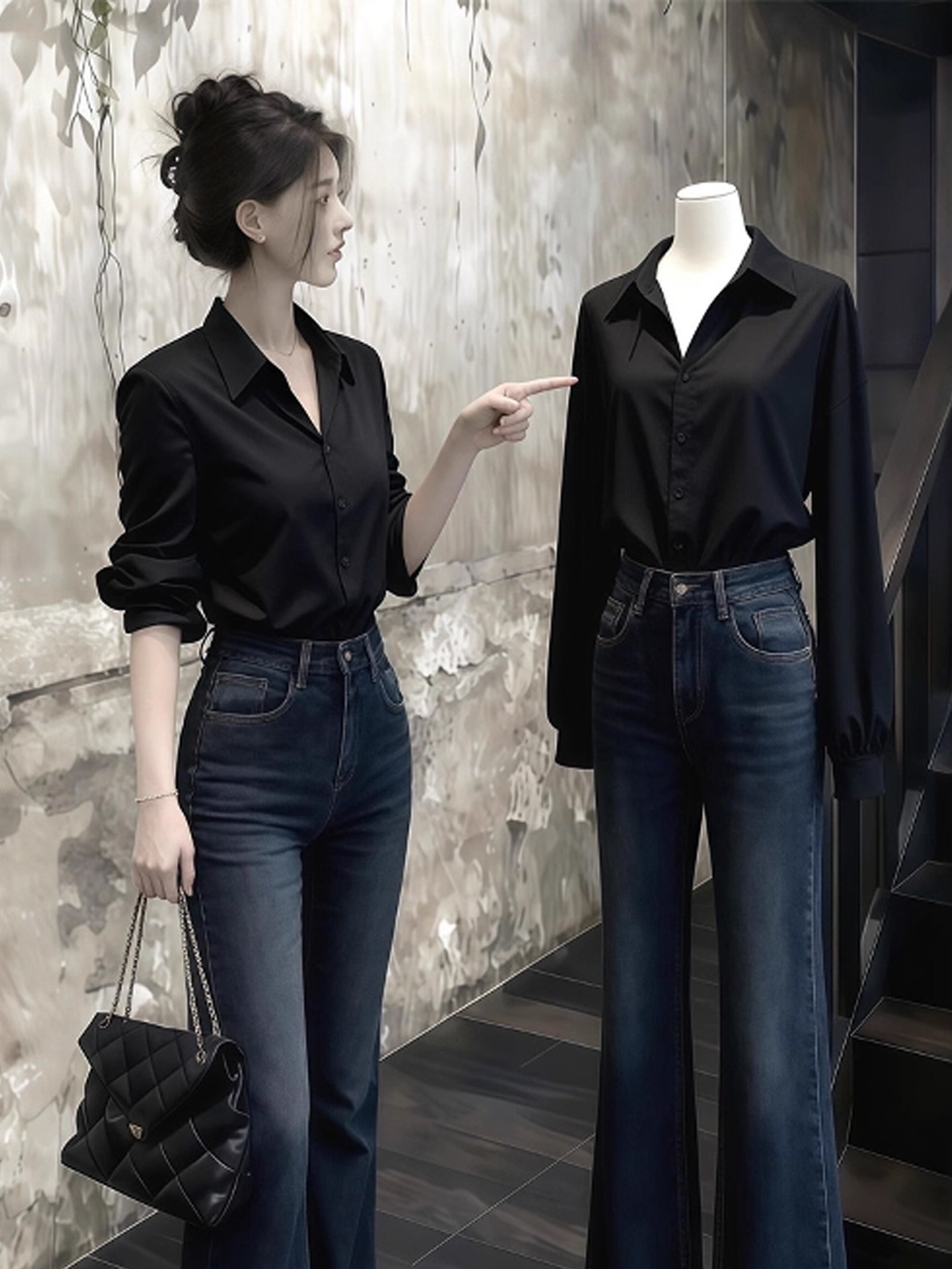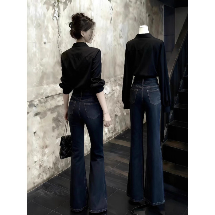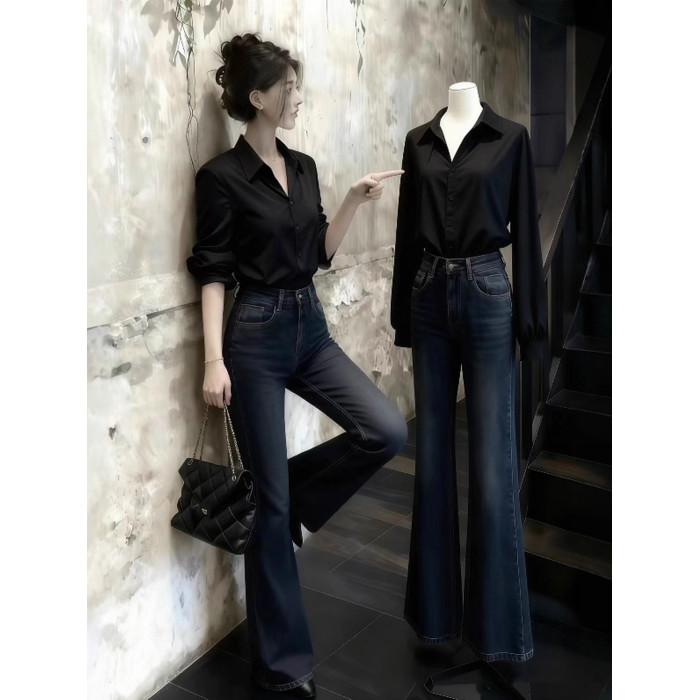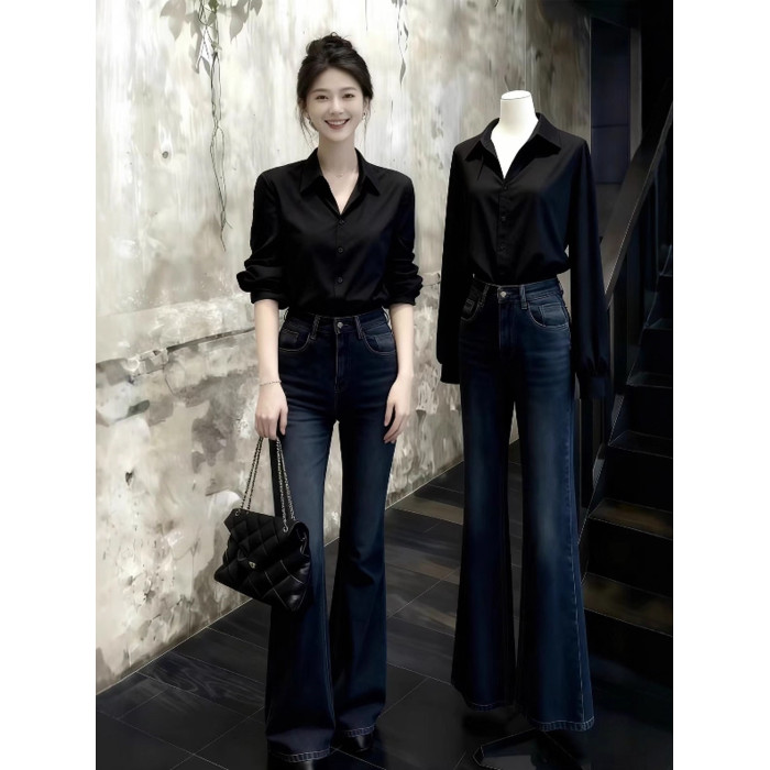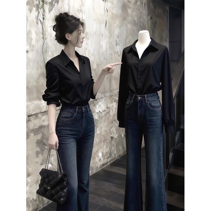 趙露思許妍同款黑色襯衫女春秋高級感繙領褶皺襯衣通勤風百搭上衣