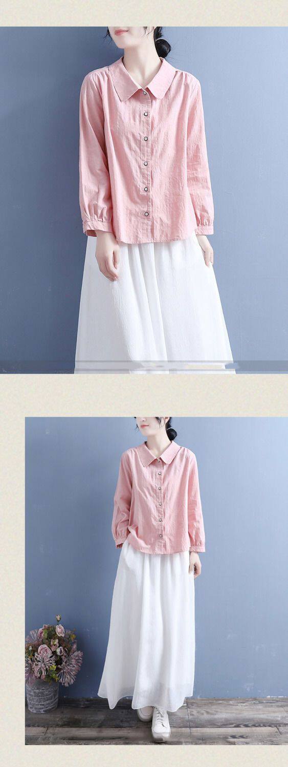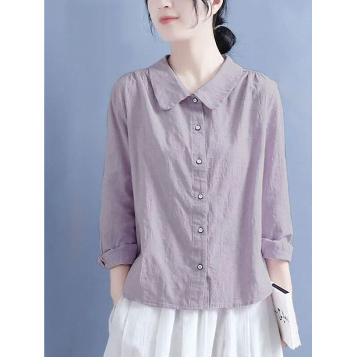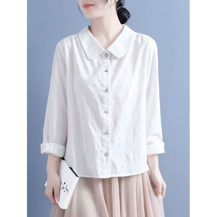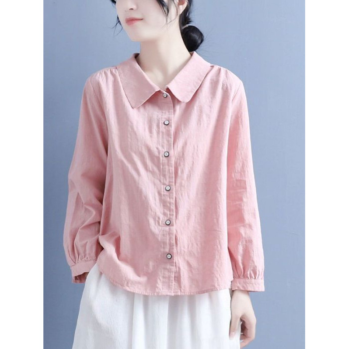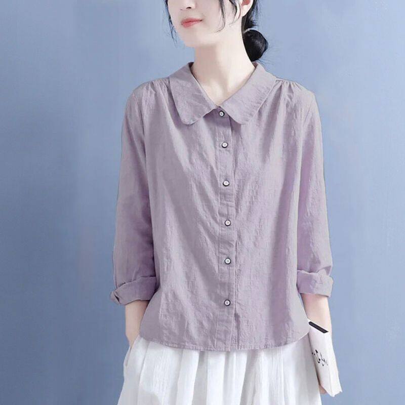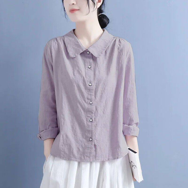 棉麻襯衫女2025春秋裝新款文藝復古風娃娃領休閒寬鬆大碼長袖上衣