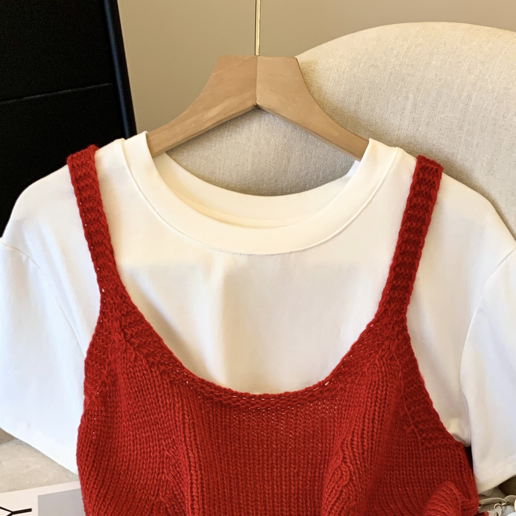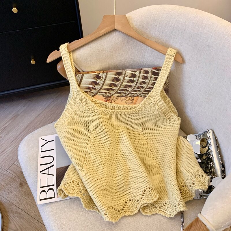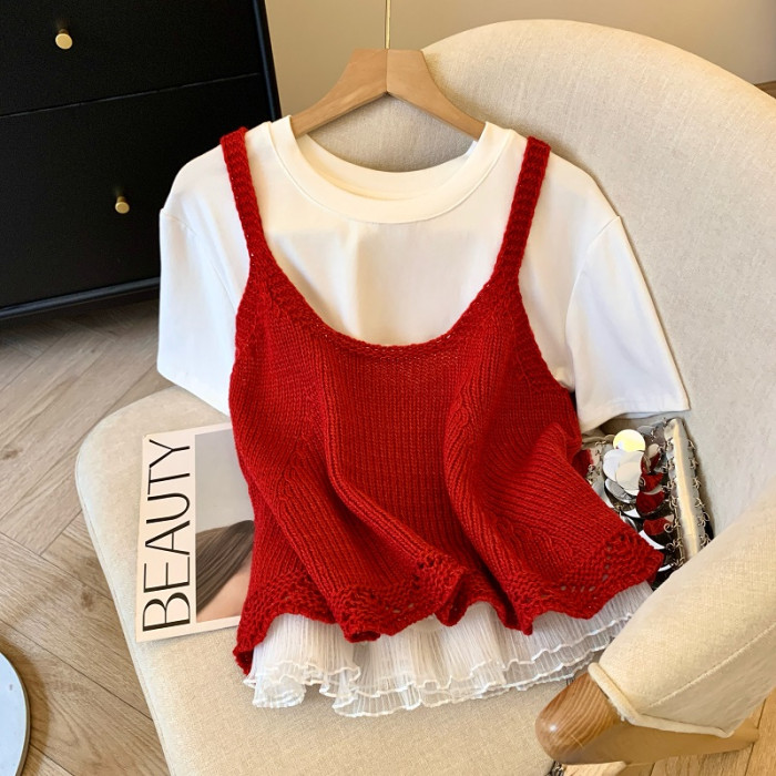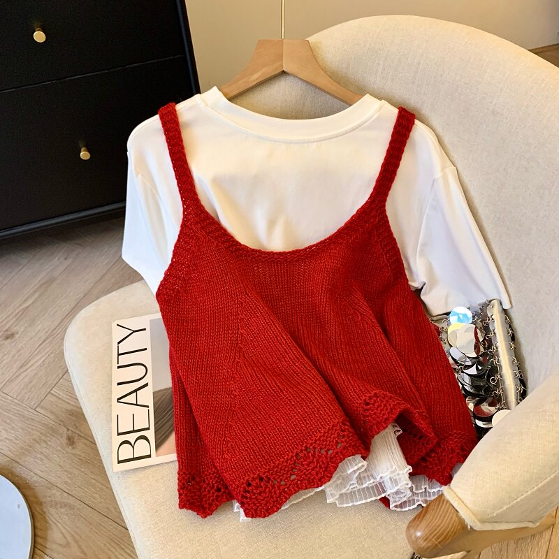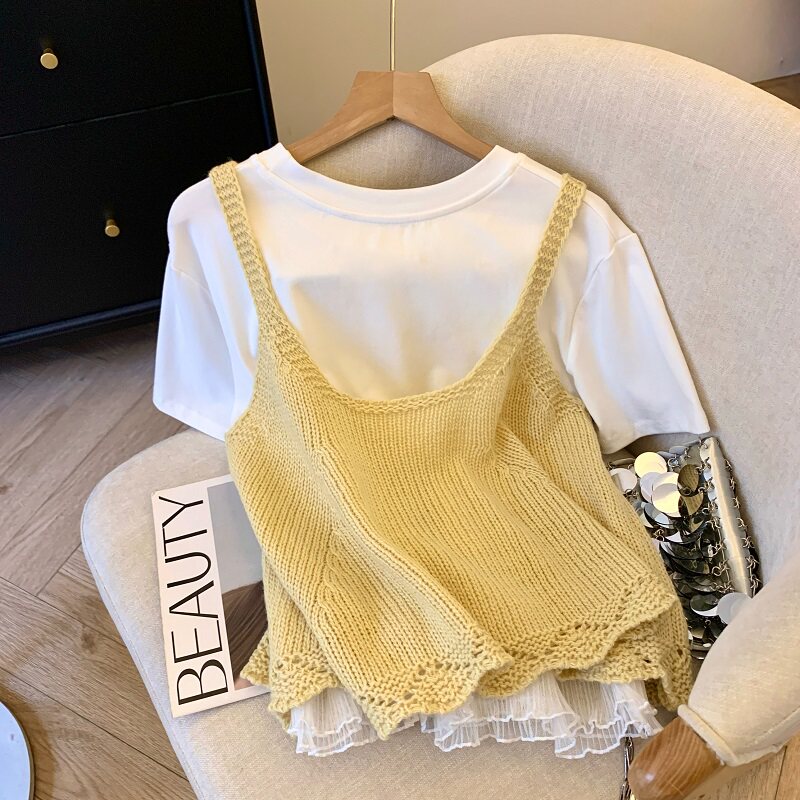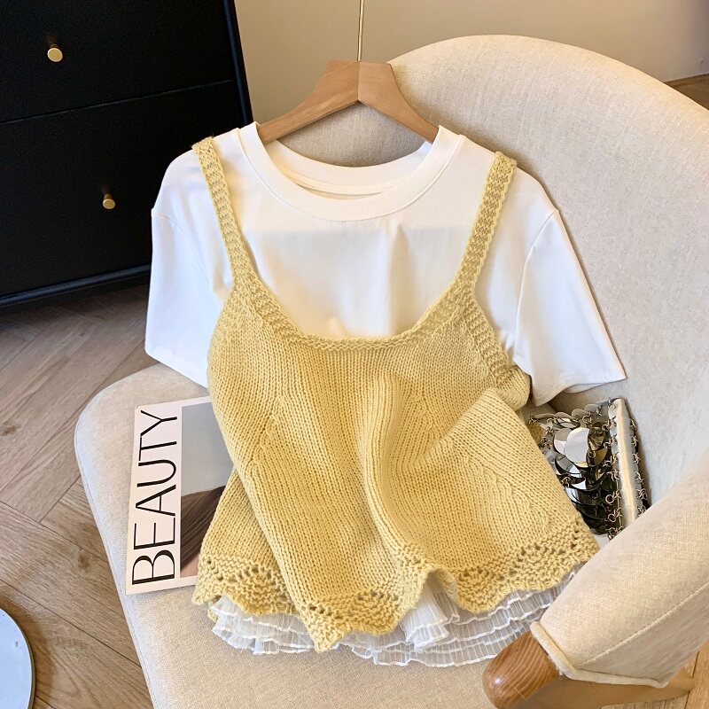 專櫃撤廻剪標韓系圓領針織曡穿吊帶背心女夏季新款甜美風顯瘦上衣