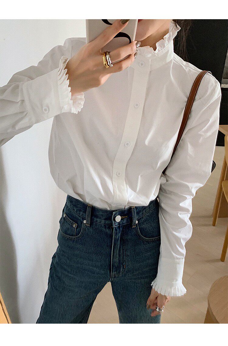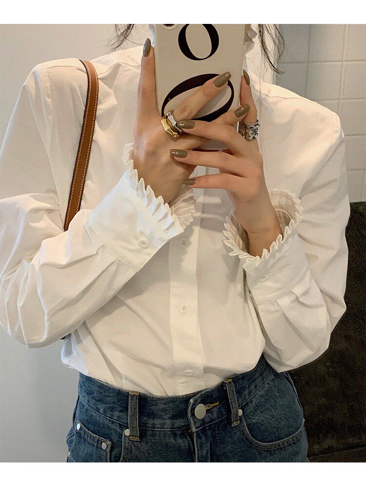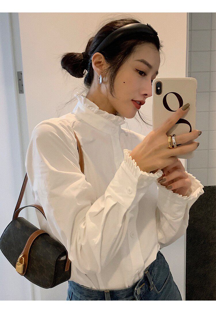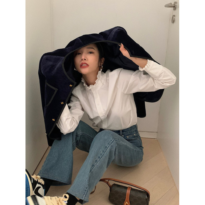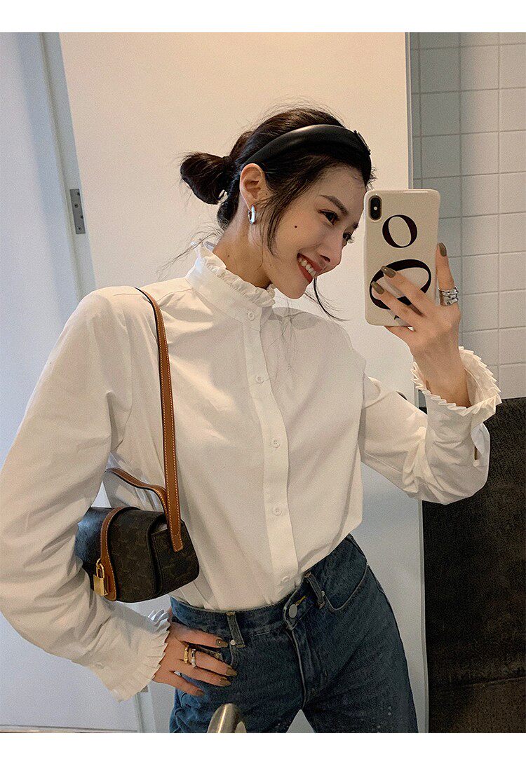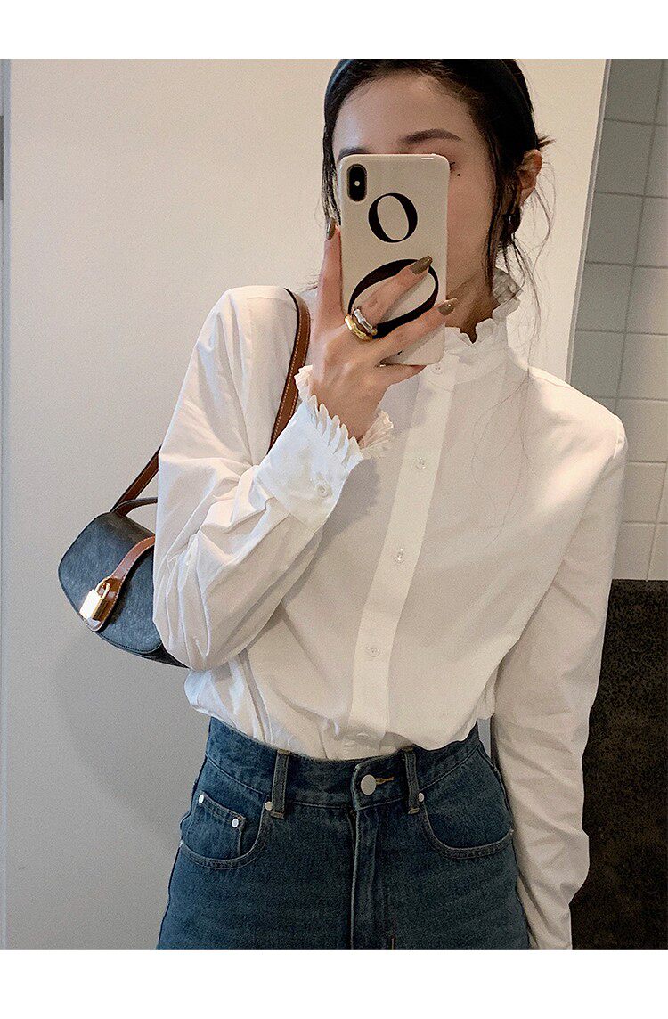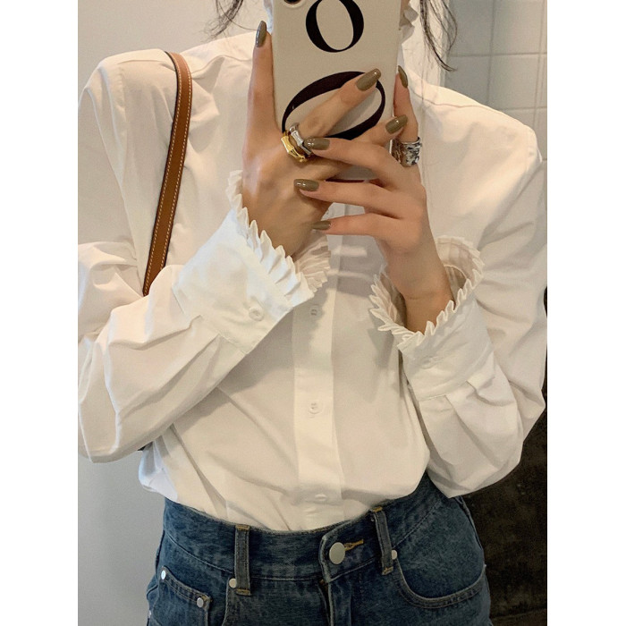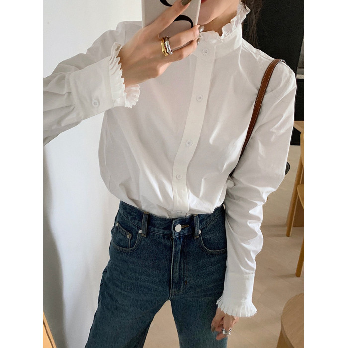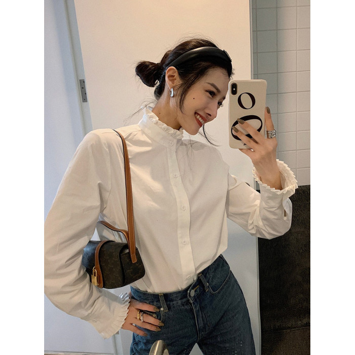 法式宮廷風漂亮花邊立領正肩白襯衫春季新款顯瘦打底純棉長袖襯衣