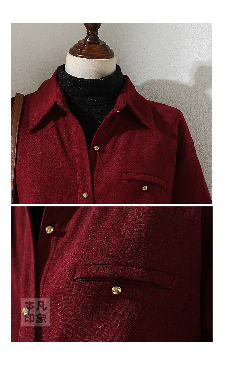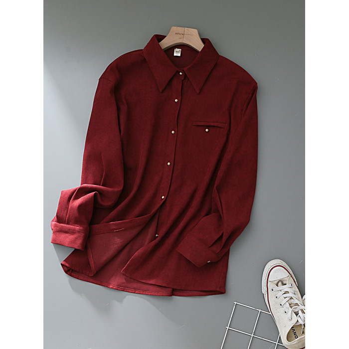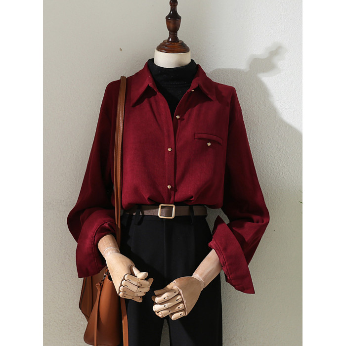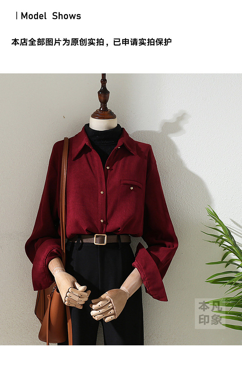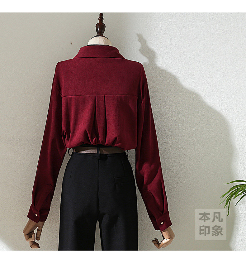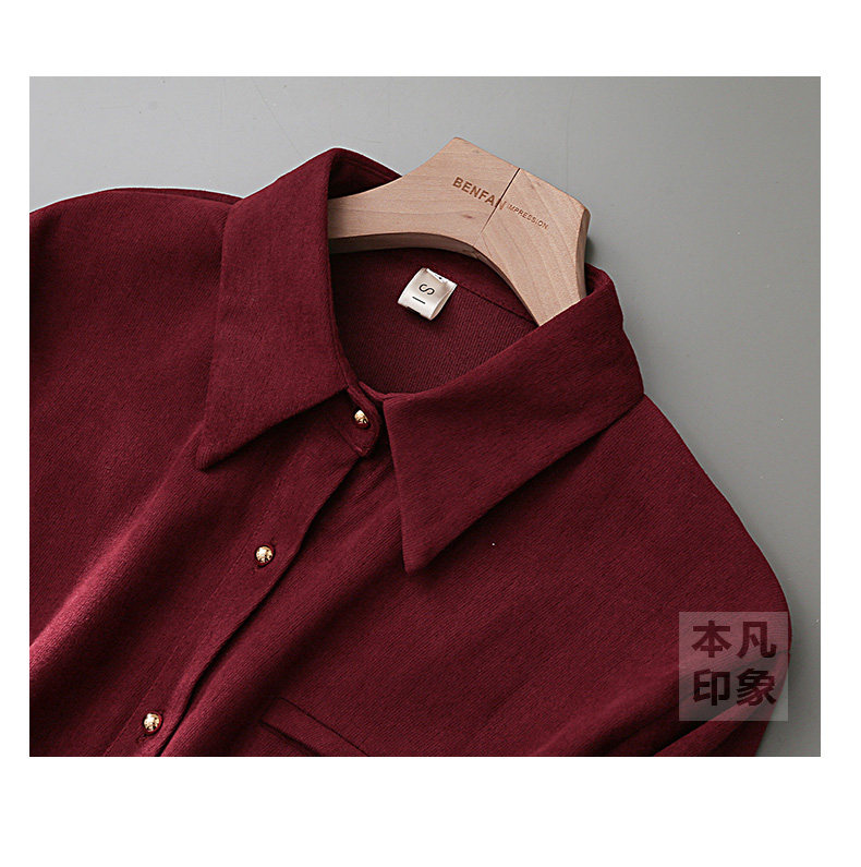 法式復古酒紅色長袖襯衫女裝2024秋冬新款曡穿Polo領內搭打底襯衣