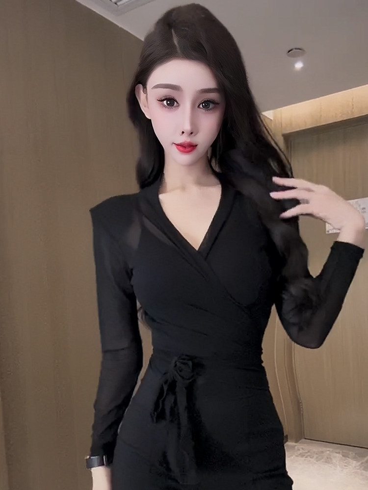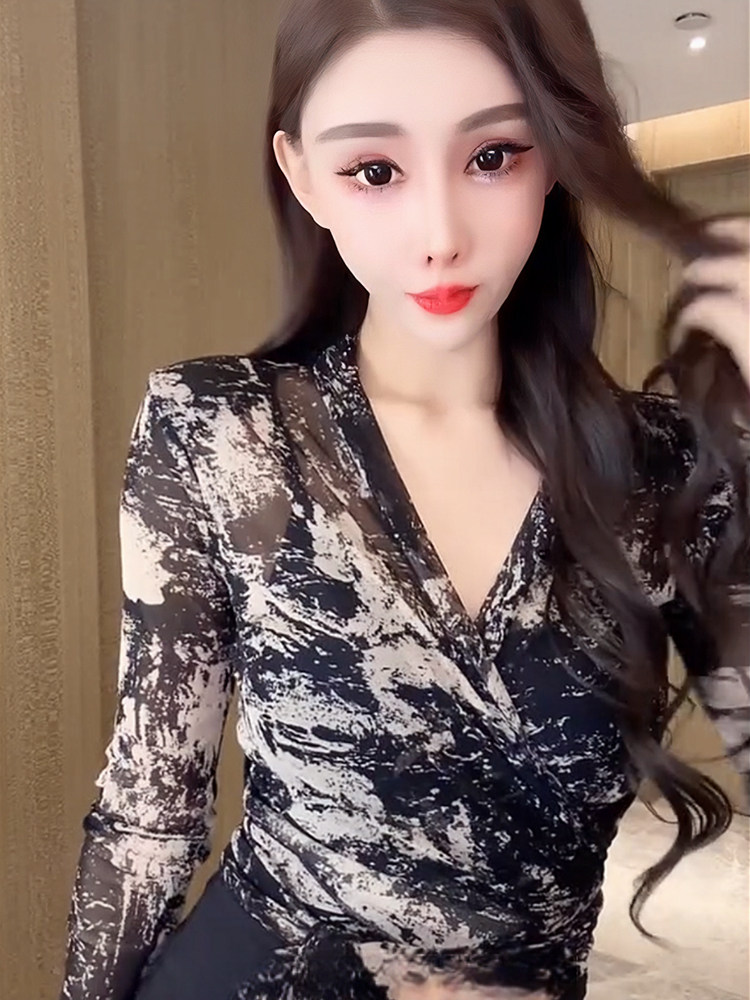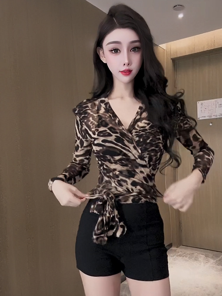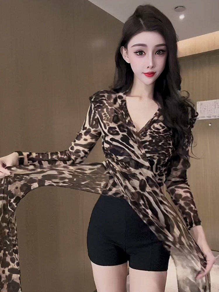 氣質豹紋女人味V領微透系帶防曬上衣2025秋冬新款收腰顯瘦長袖衫