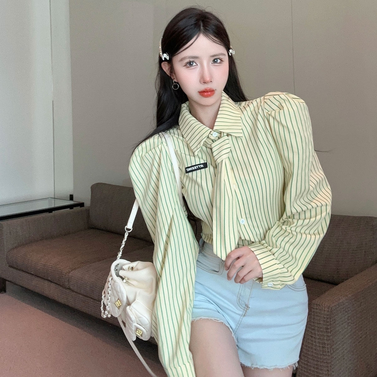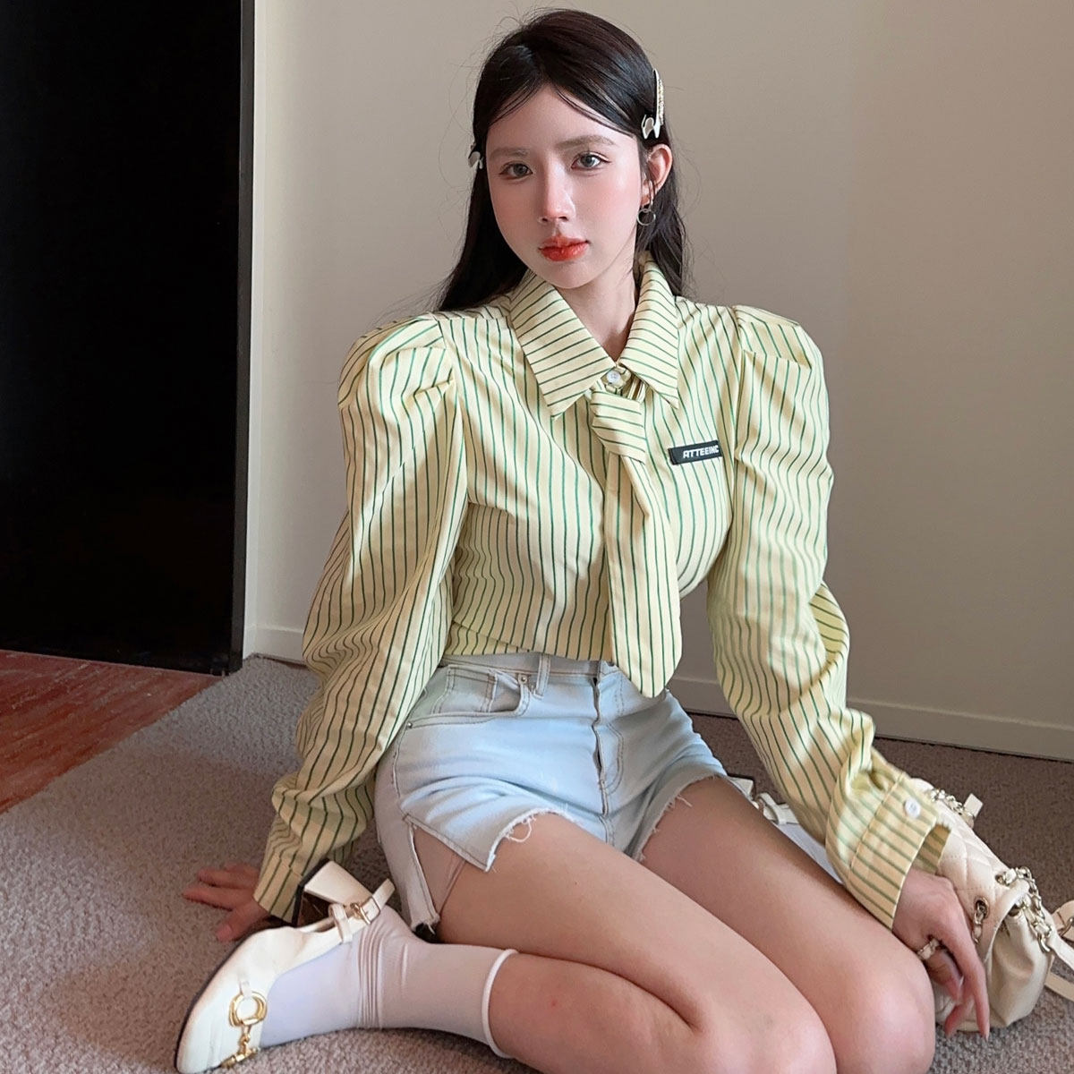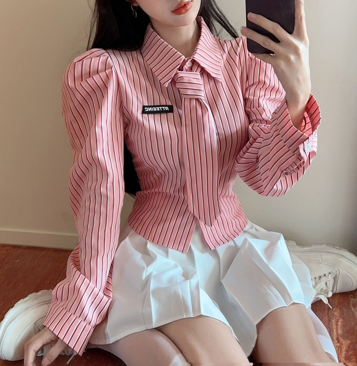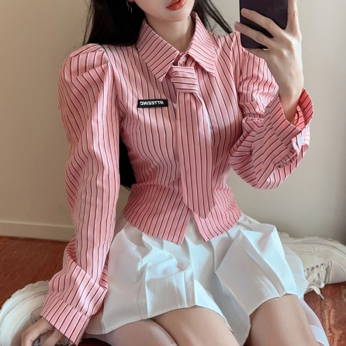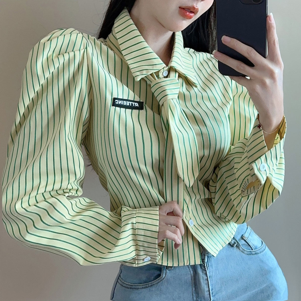 甜美條紋襯衫女氣質polo領帶時髦百搭韓系收腰顯瘦泡泡袖法式上衣