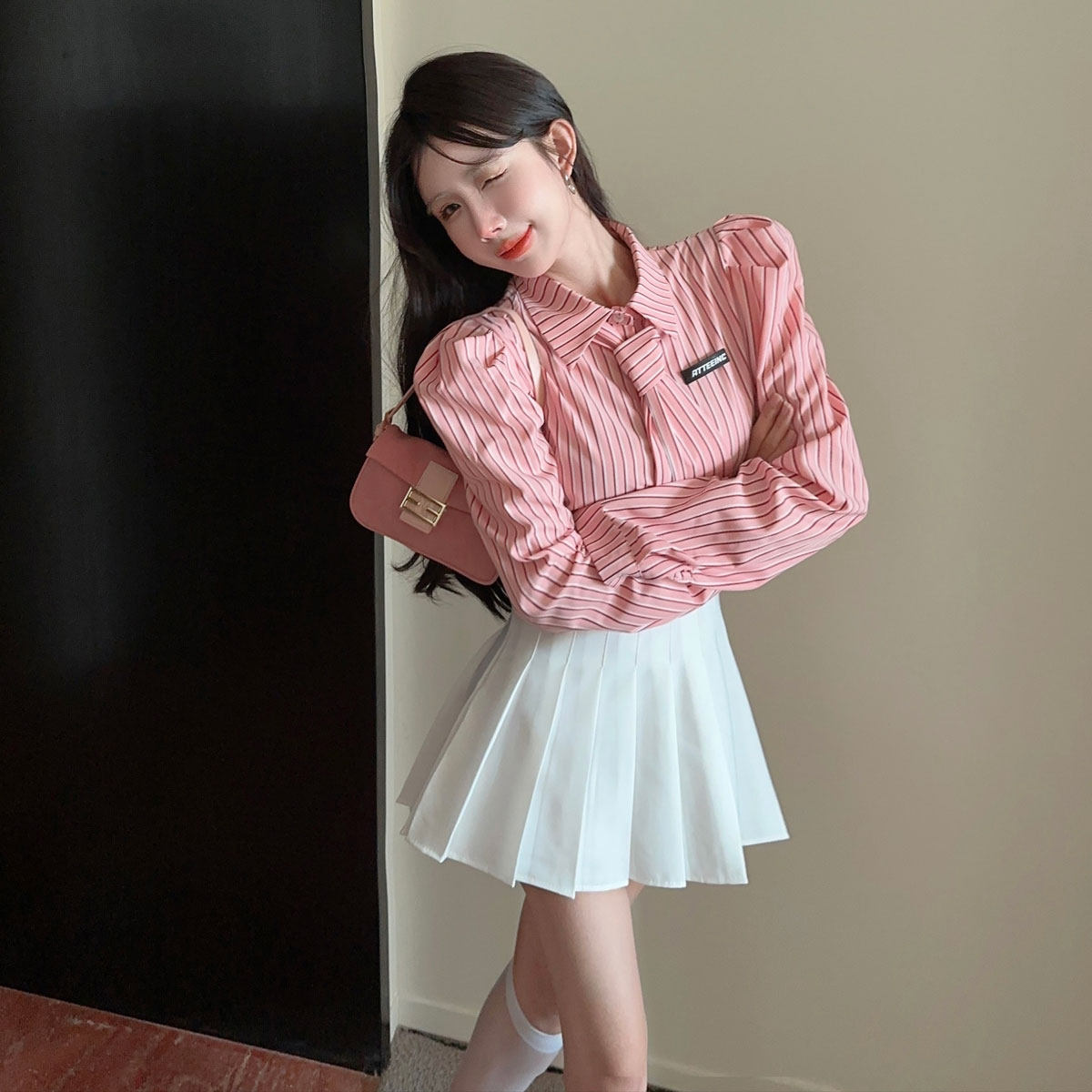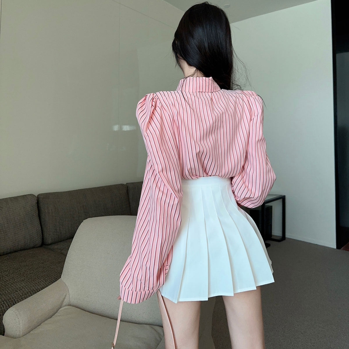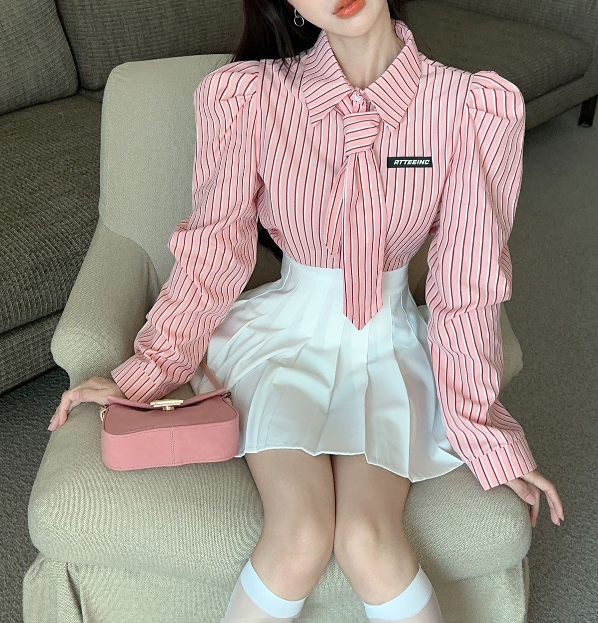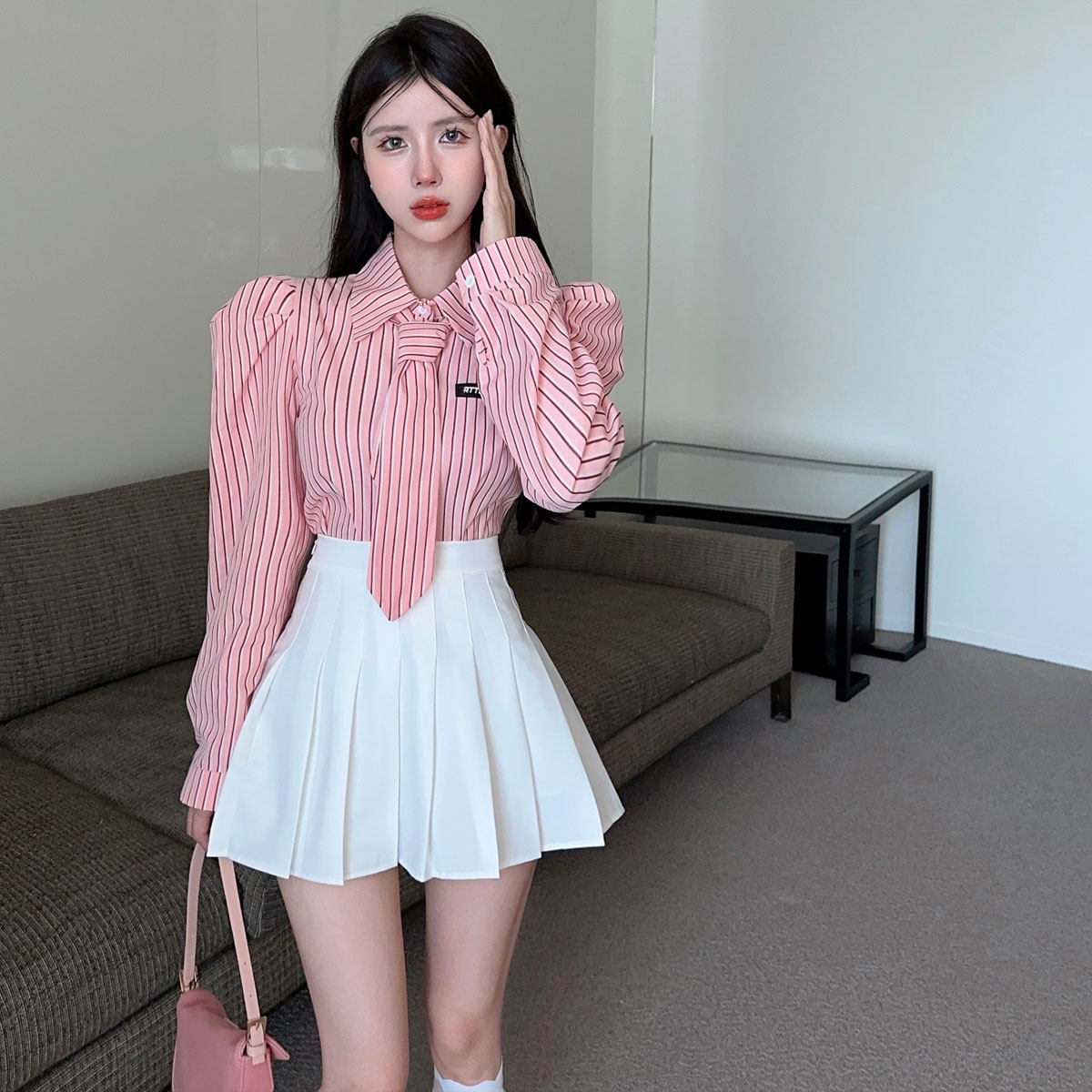 甜美條紋襯衫女氣質polo領帶時髦百搭韓系收腰顯瘦泡泡袖法式上衣