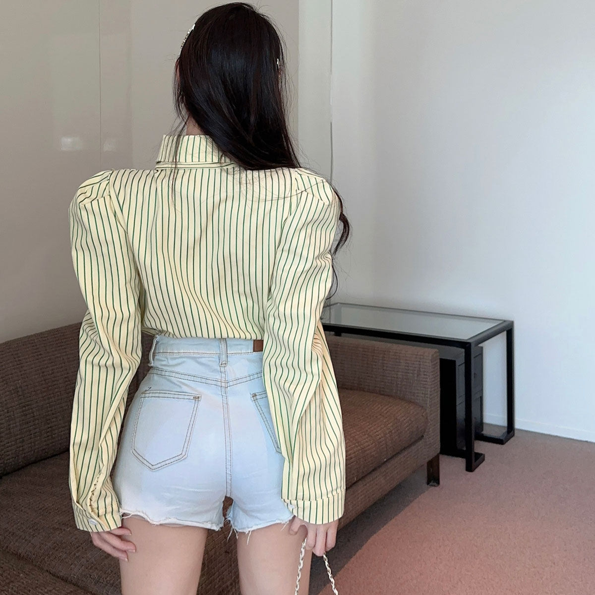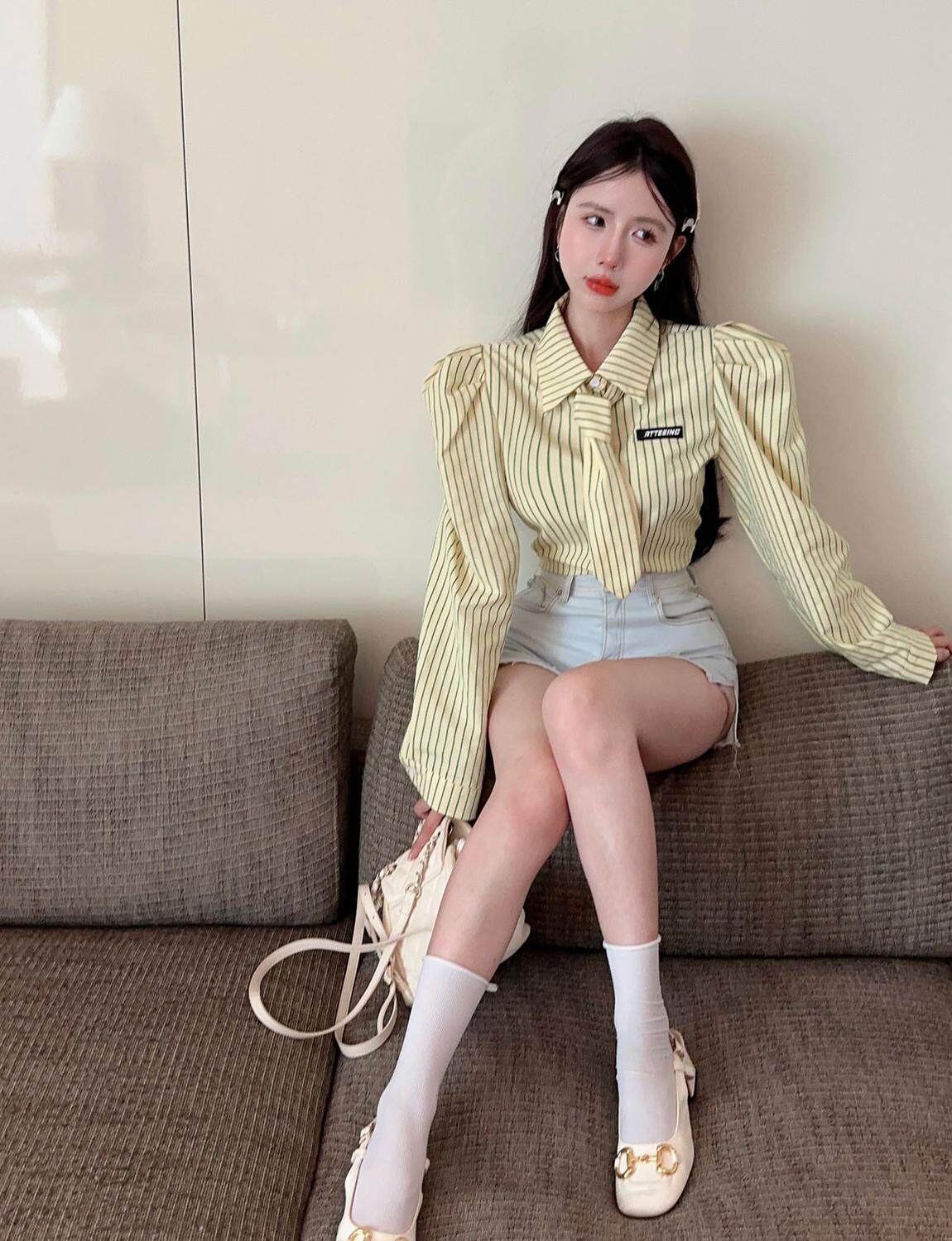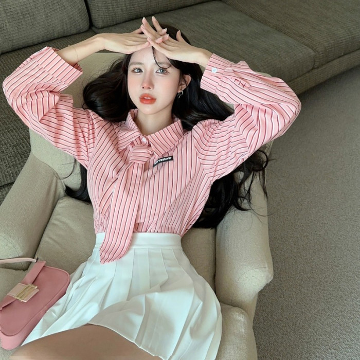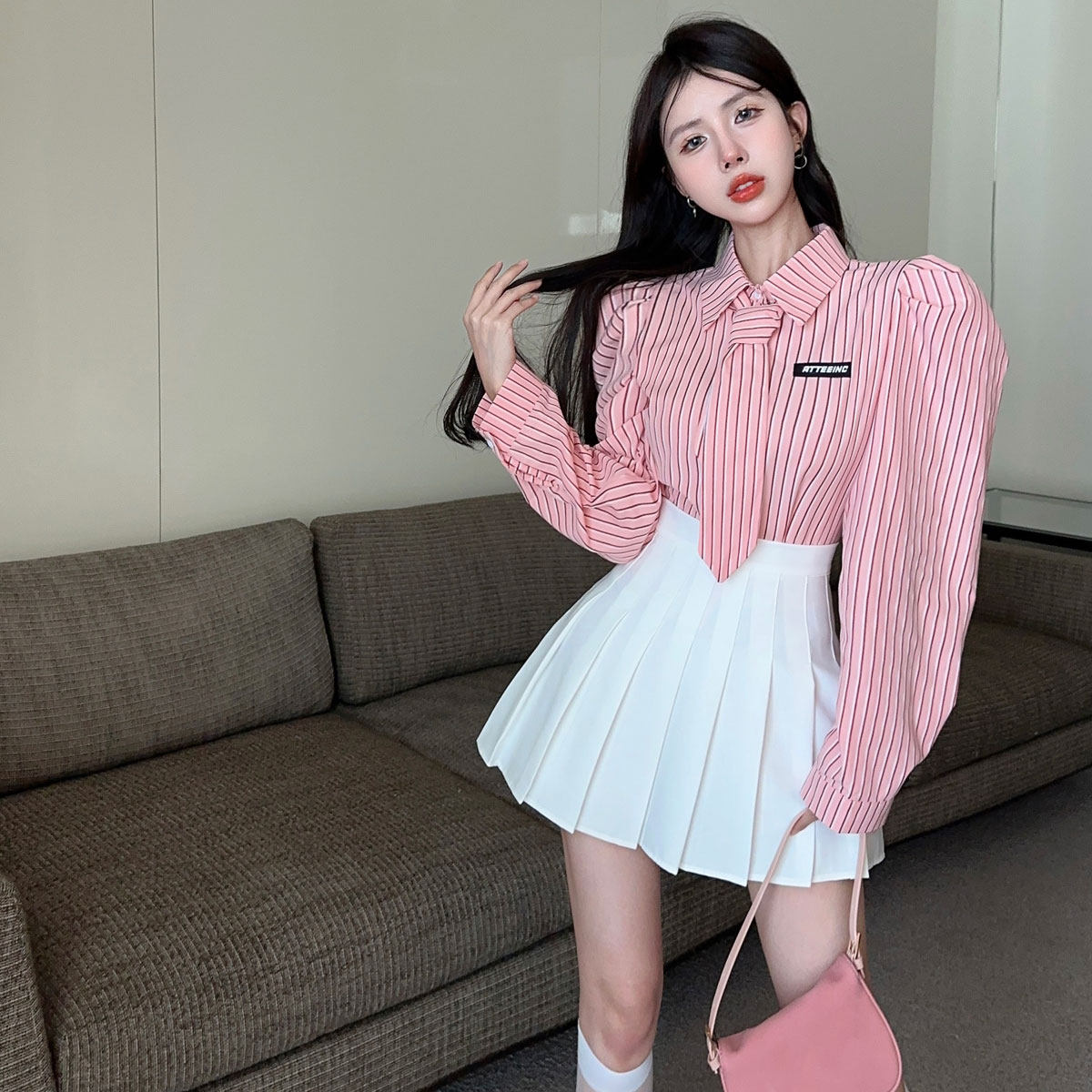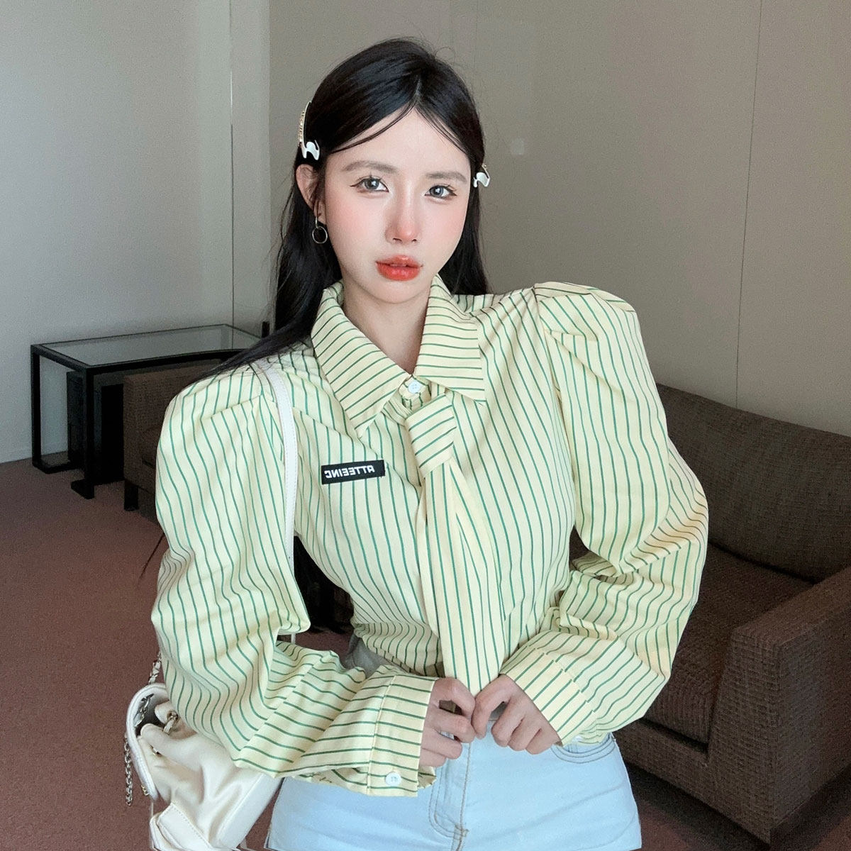 甜美條紋襯衫女氣質polo領帶時髦百搭韓系收腰顯瘦泡泡袖法式上衣