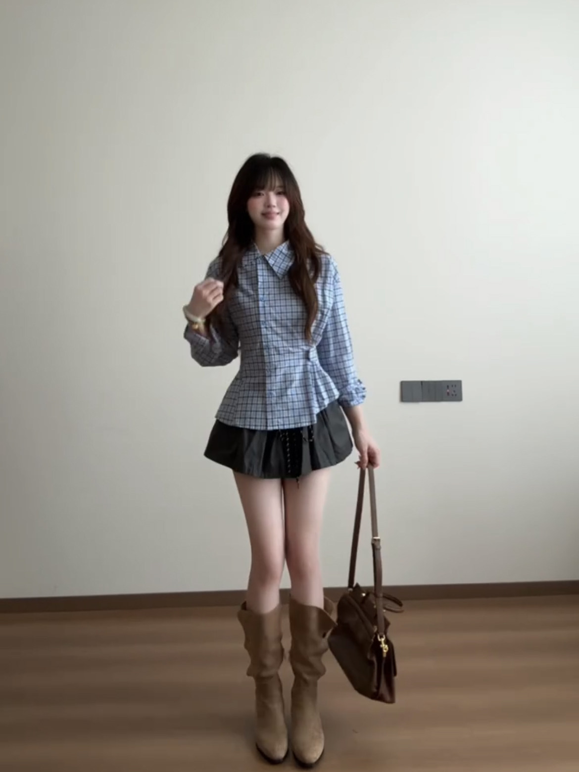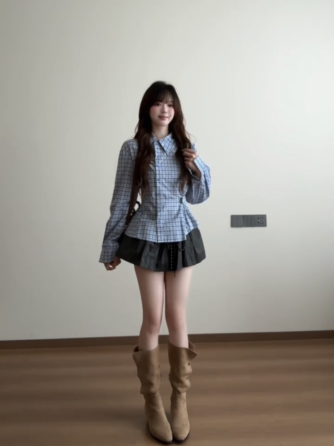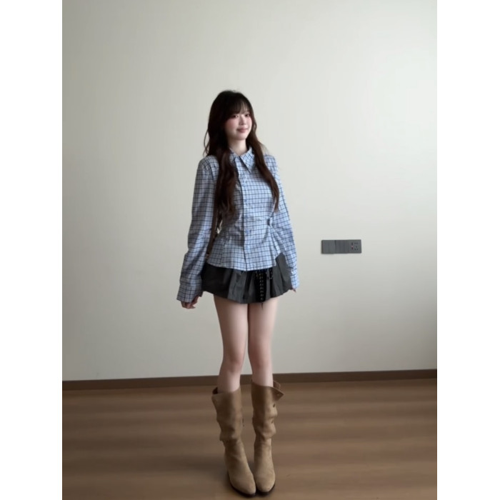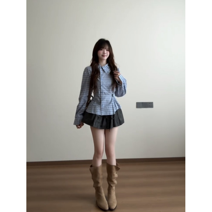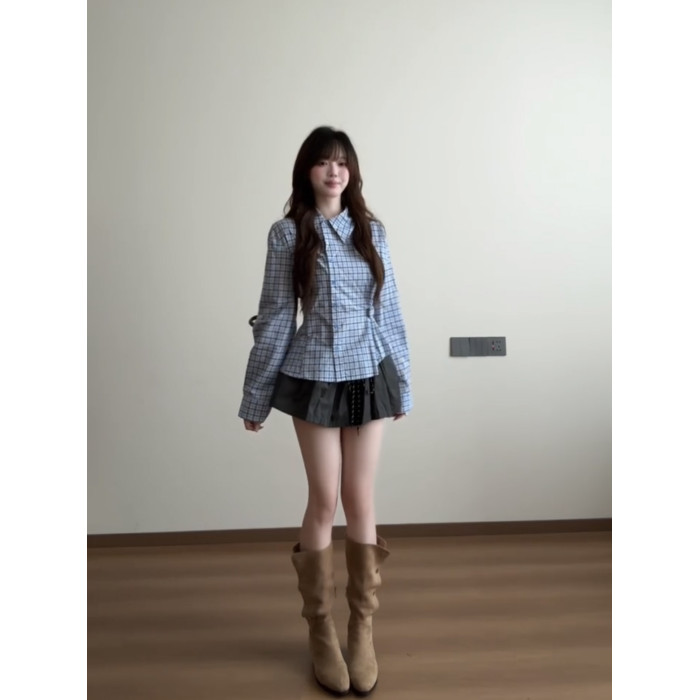 藍色格子收腰襯衫女款2025新款早秋季設計感小衆巨好看的長袖上衣