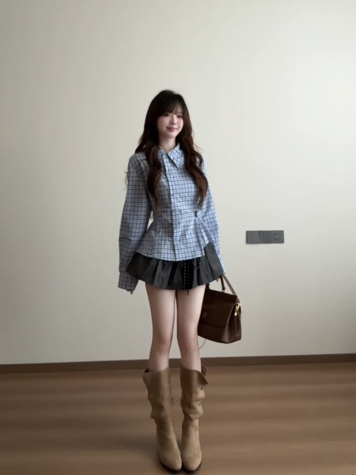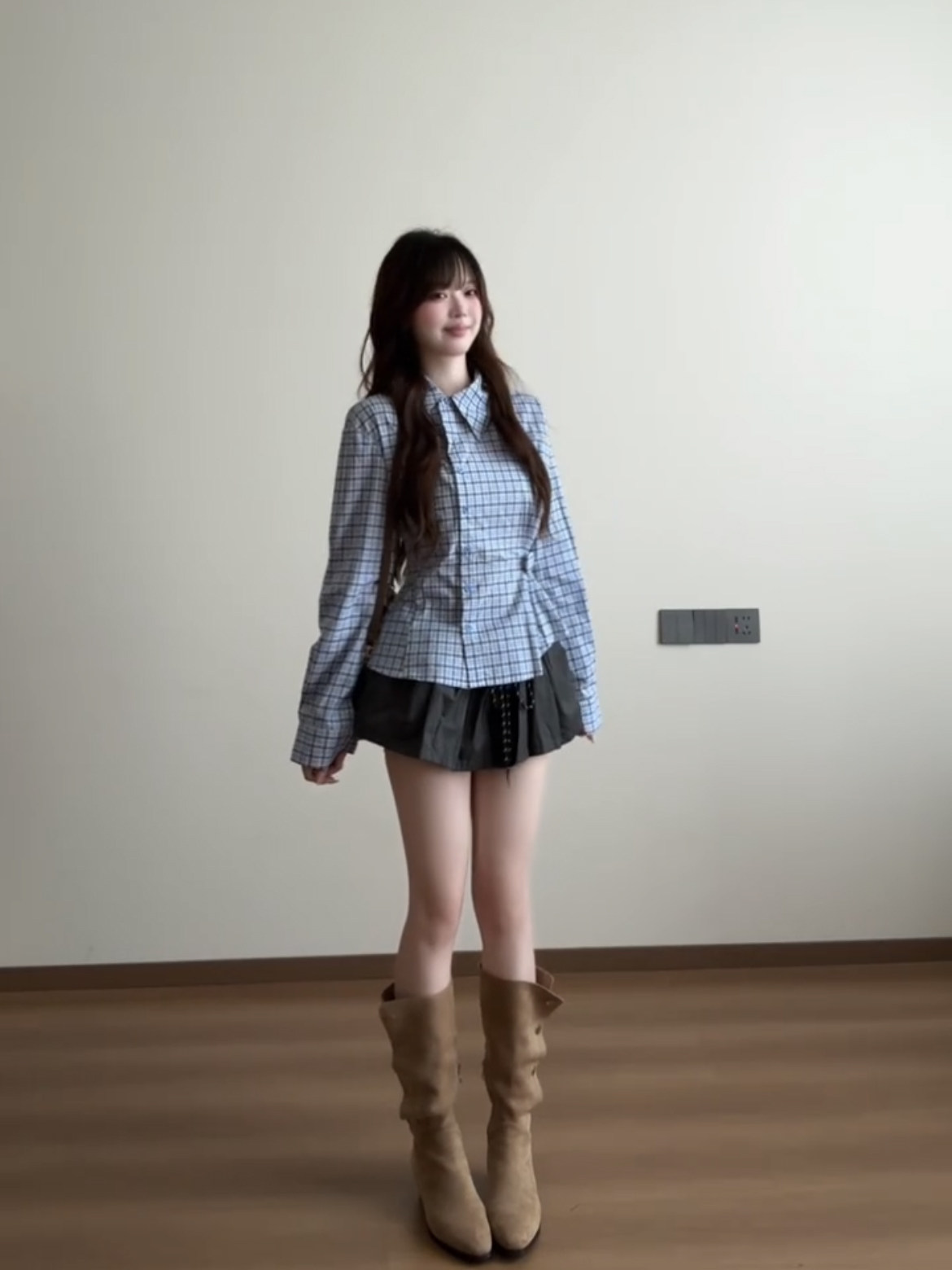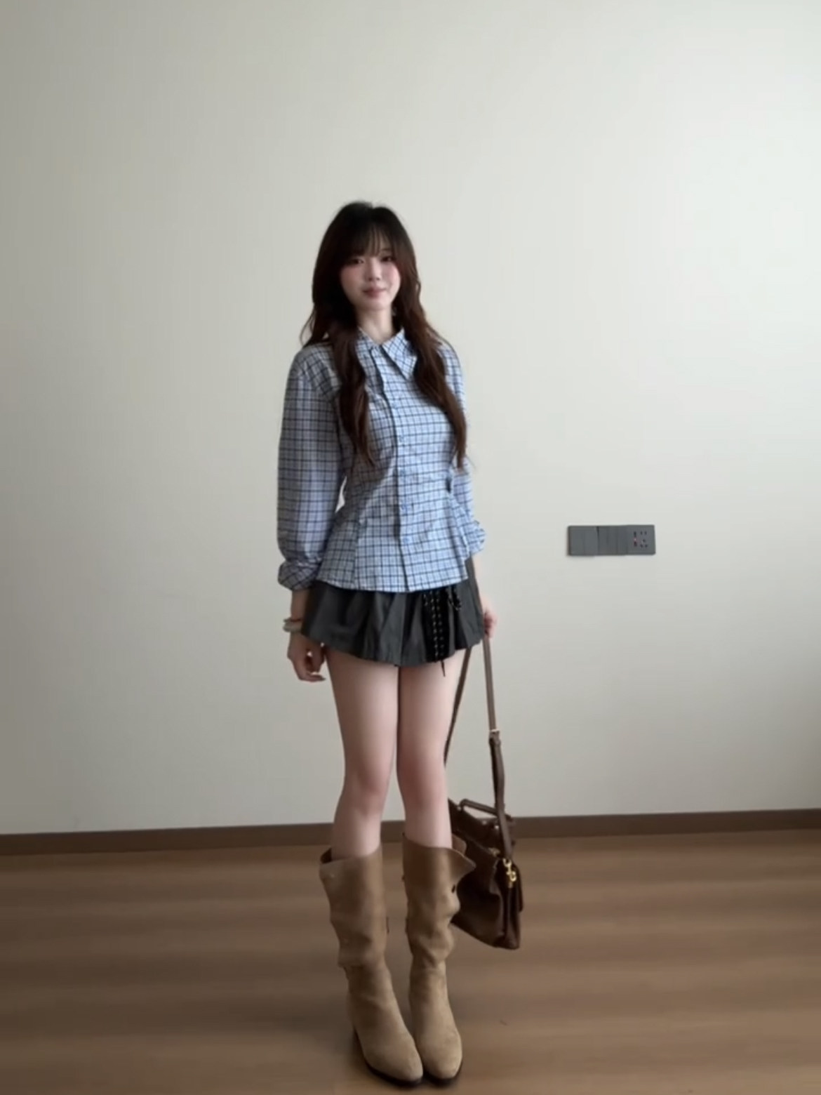 藍色格子收腰襯衫女款2025新款早秋季設計感小衆巨好看的長袖上衣