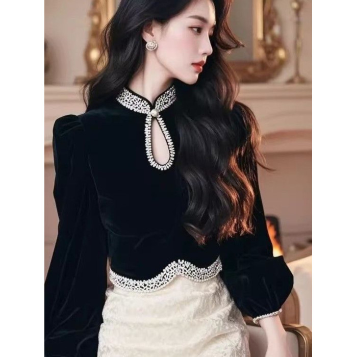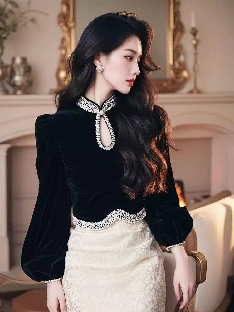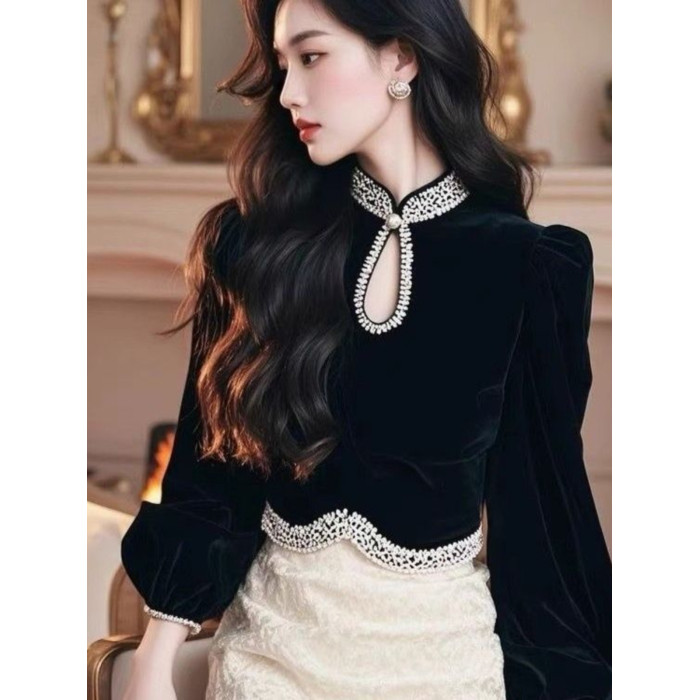 黑色高級感絲絨襯衫女長袖秋冬新款洋氣顯瘦上衣減齡絕美打底小衫