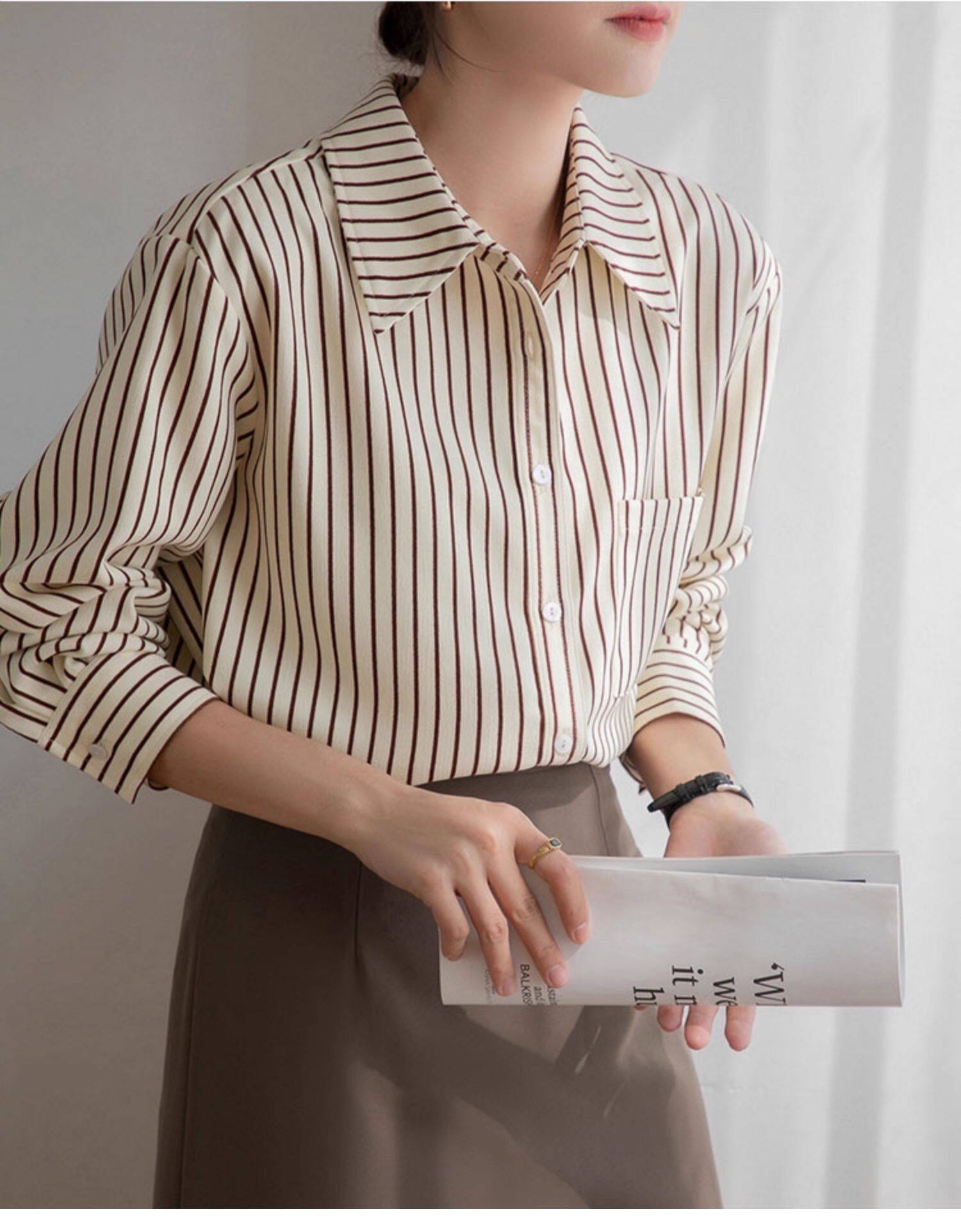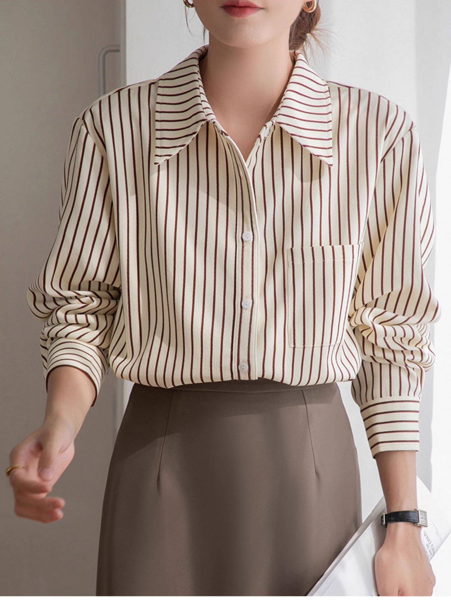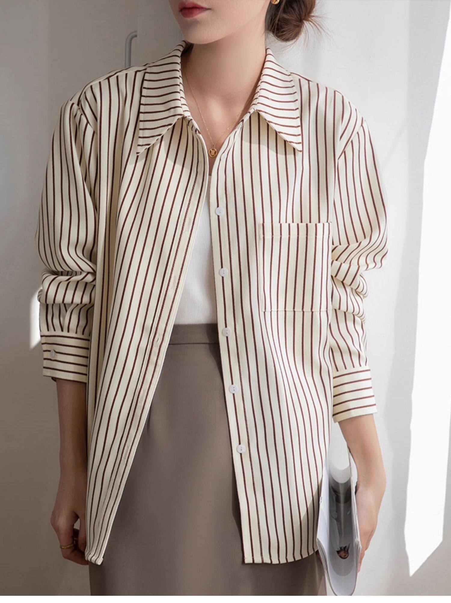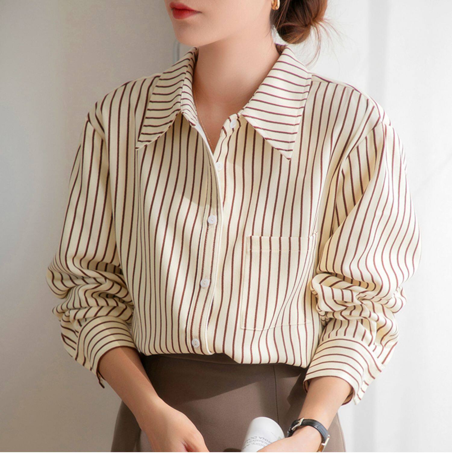 長袖條紋襯衫女秋季磨毛曡穿燈芯絨襯衣夏薄款復古通勤設計感上衣