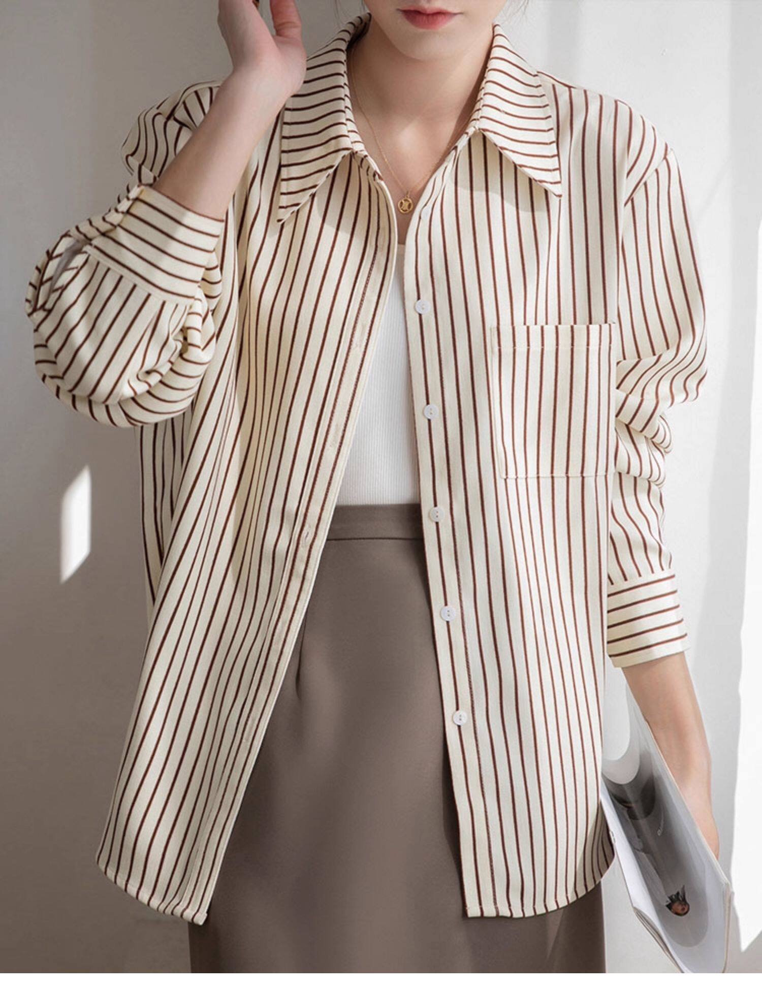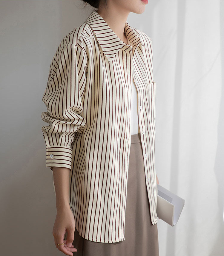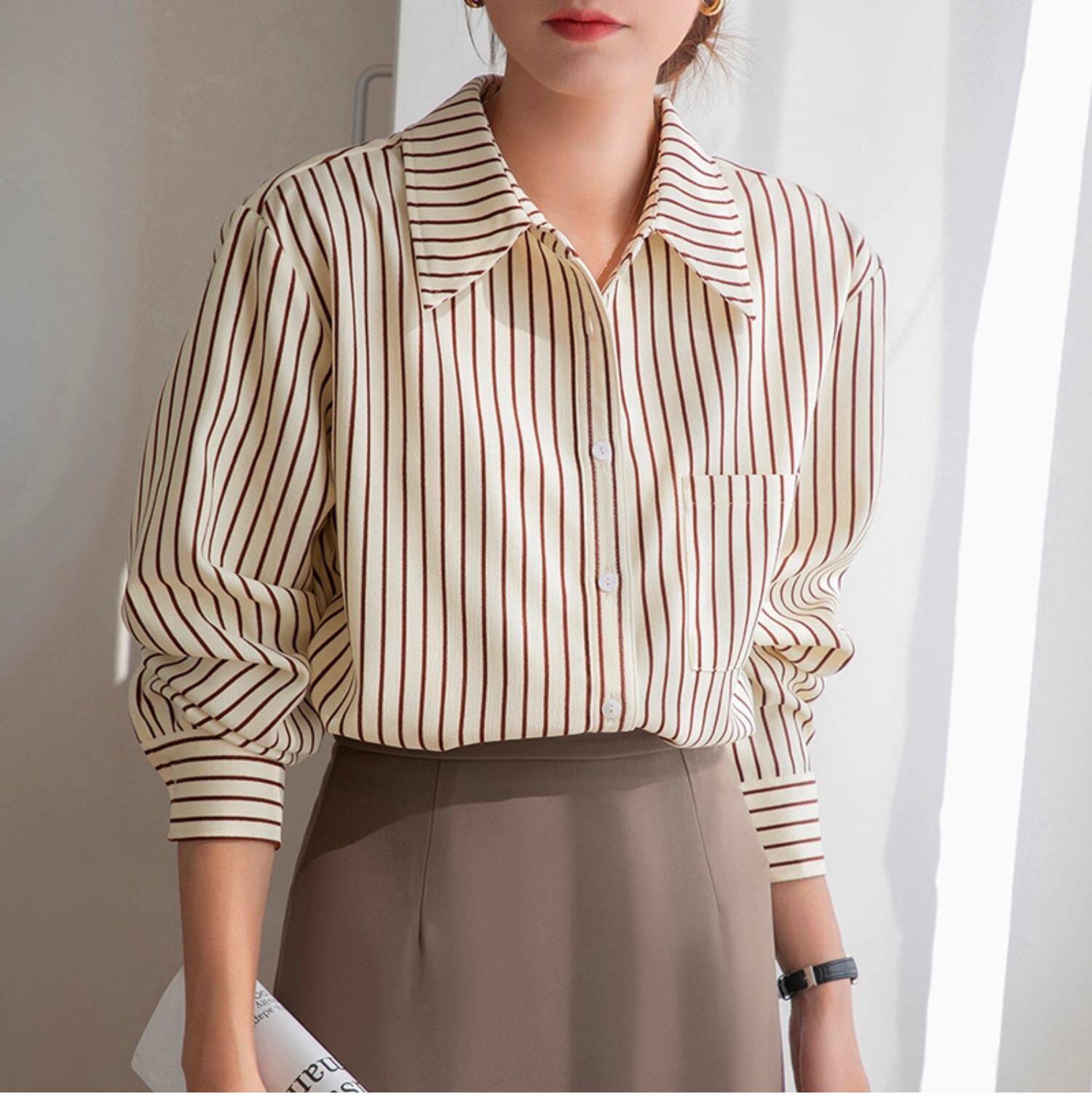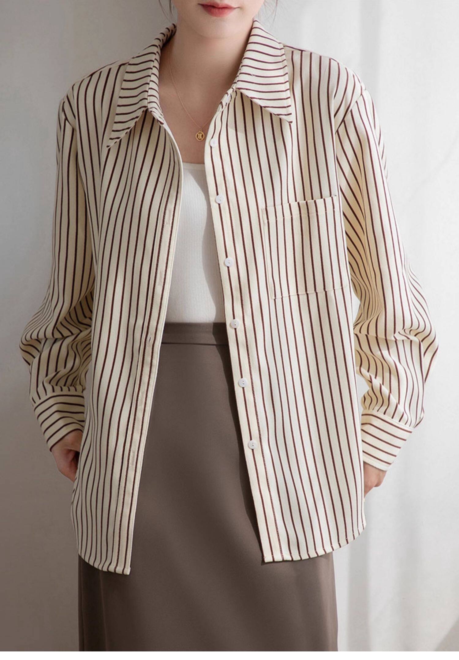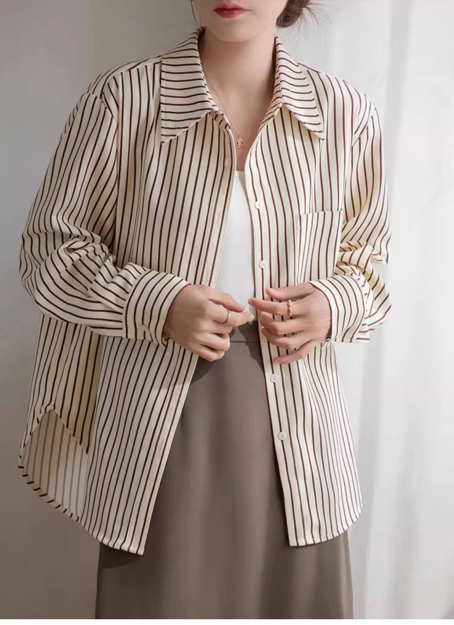 長袖條紋襯衫女秋季磨毛曡穿燈芯絨襯衣夏薄款復古通勤設計感上衣