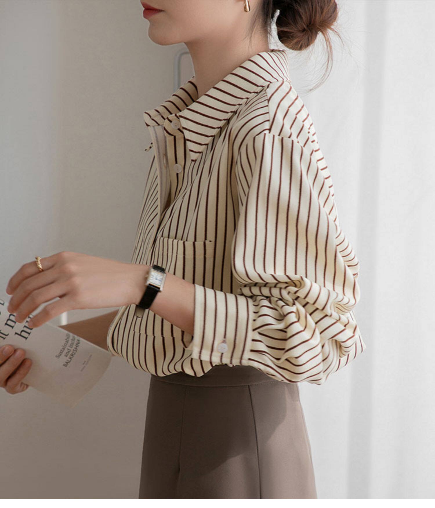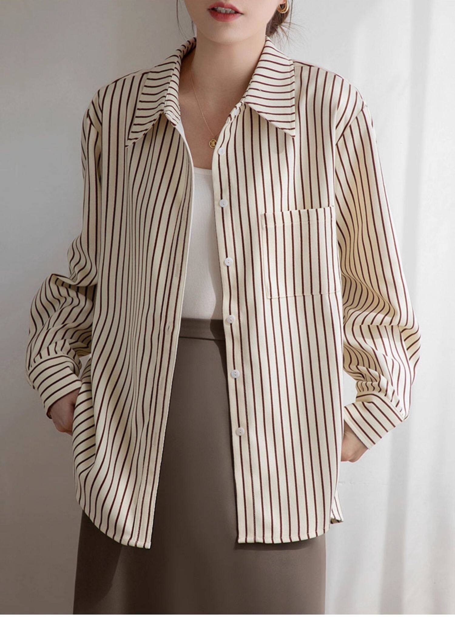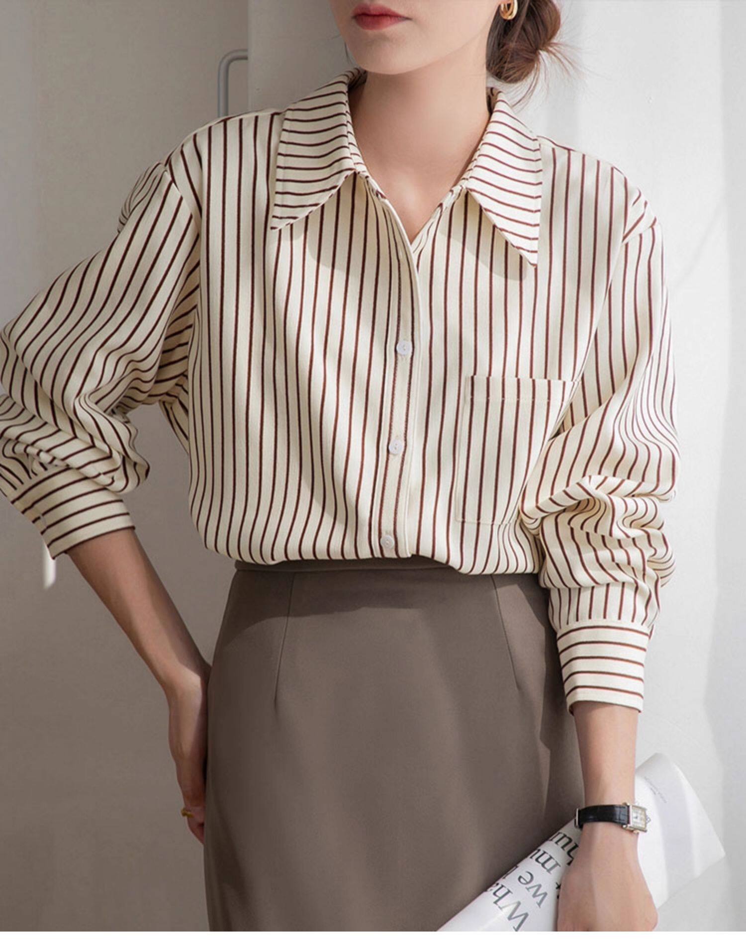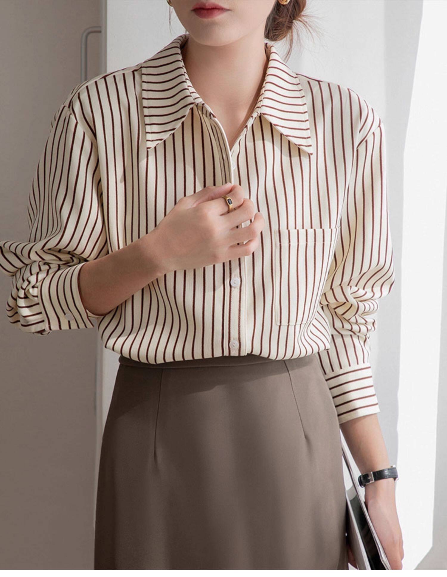 長袖條紋襯衫女秋季磨毛曡穿燈芯絨襯衣夏薄款復古通勤設計感上衣