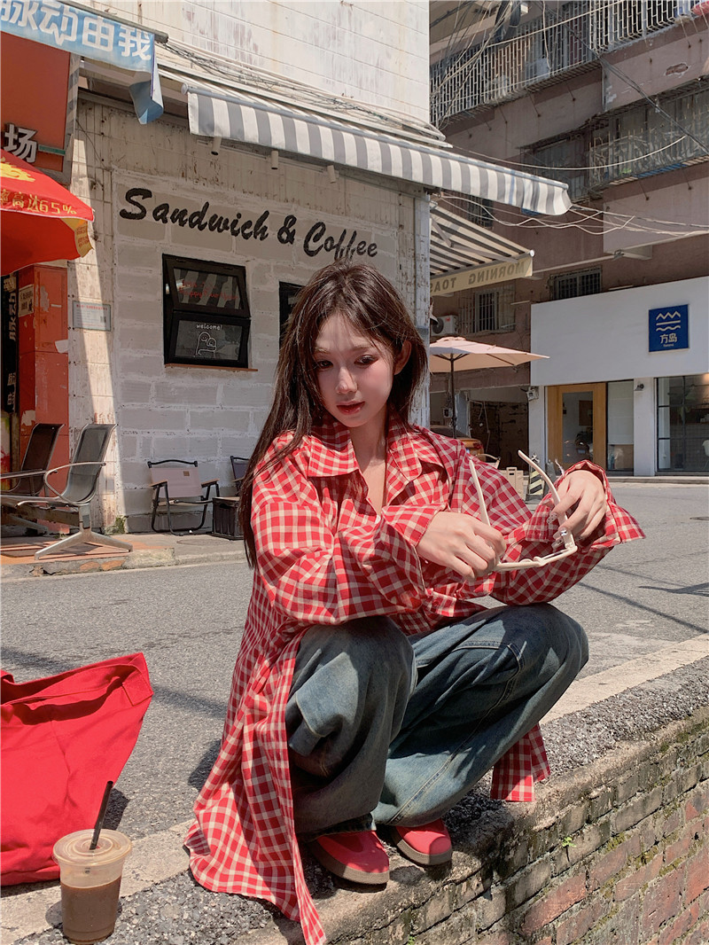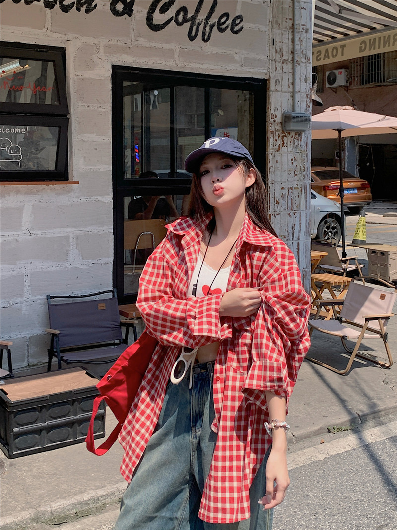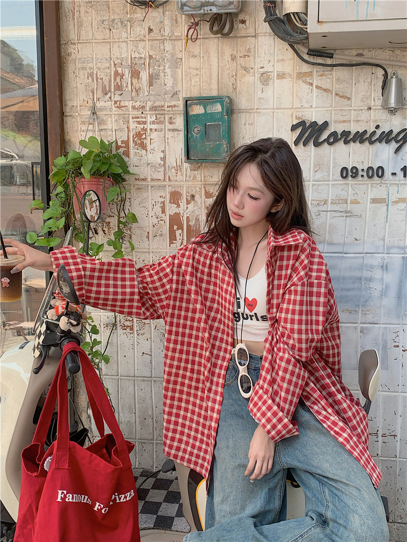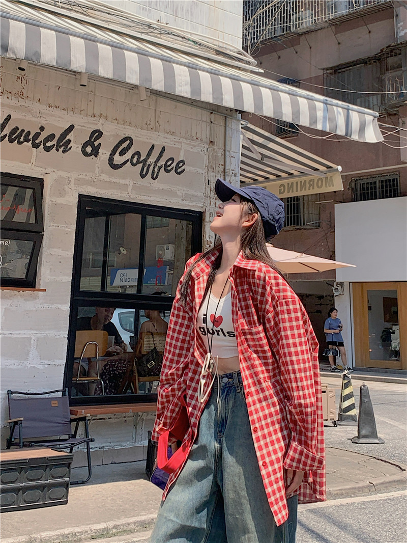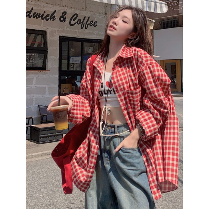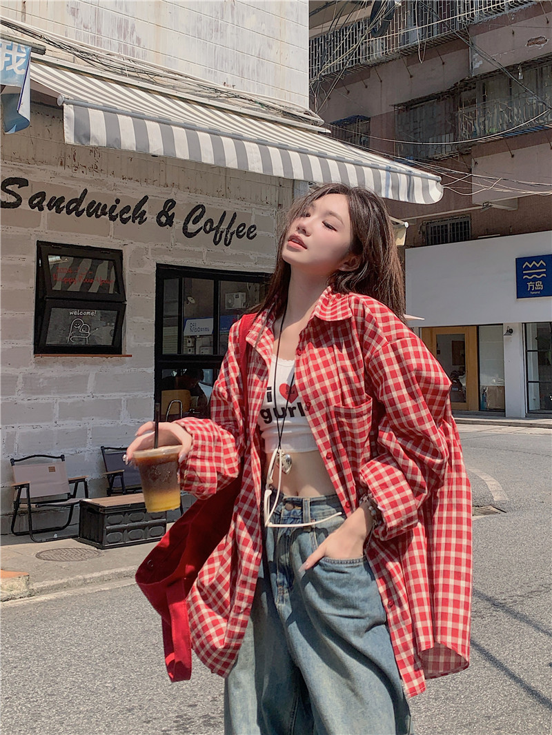 港風紅色大碼格子襯衫外搭女寬鬆顯瘦oversize百搭男友風長袖襯衫
