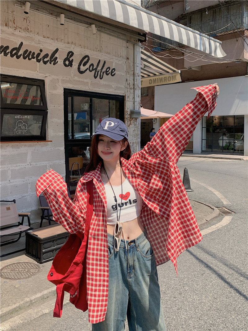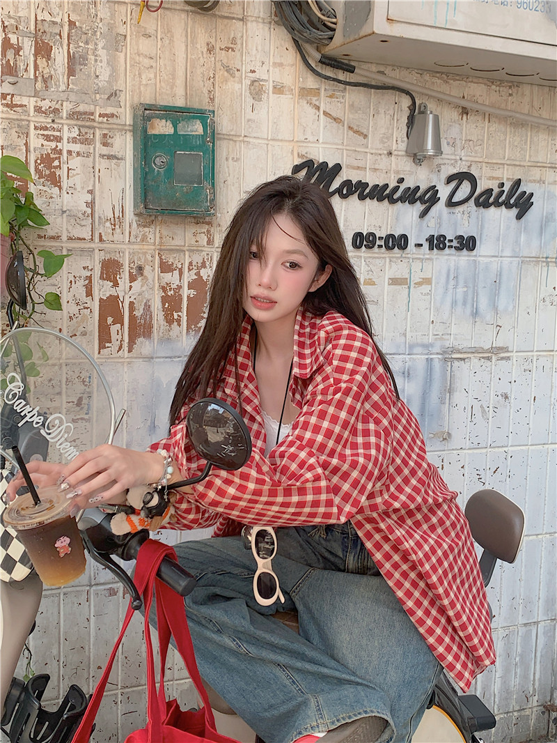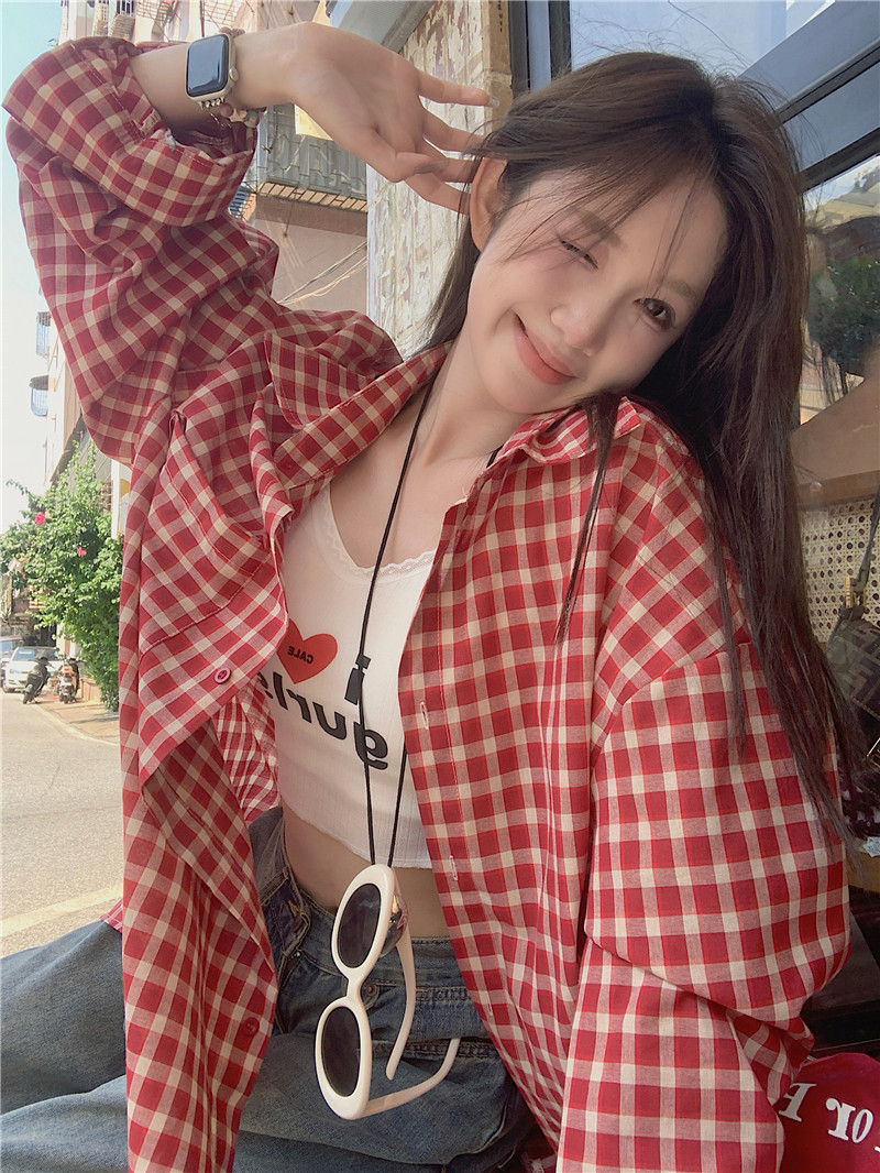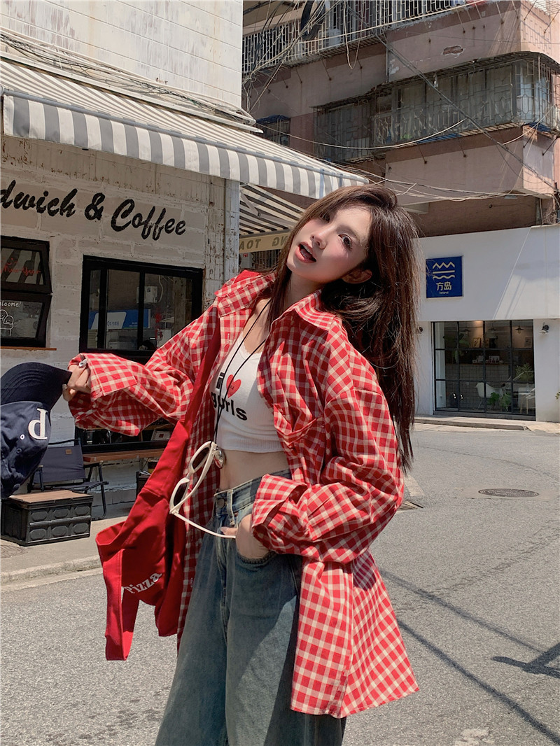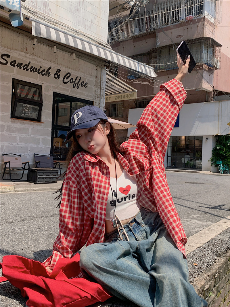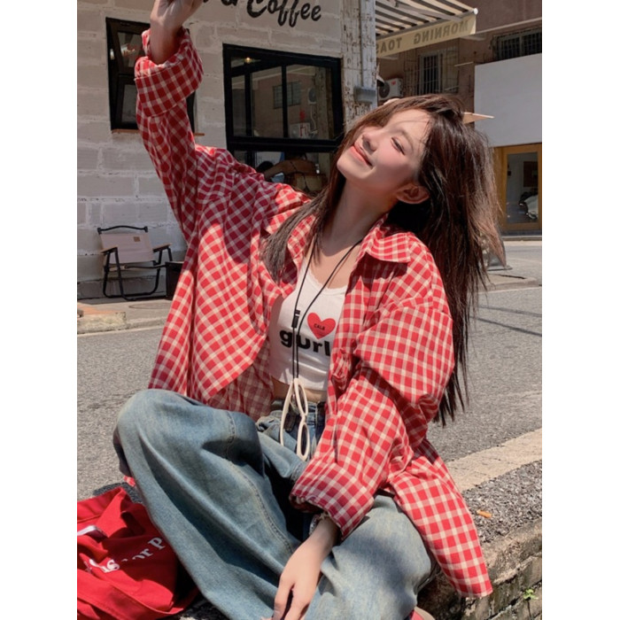 港風紅色大碼格子襯衫外搭女寬鬆顯瘦oversize百搭男友風長袖襯衫